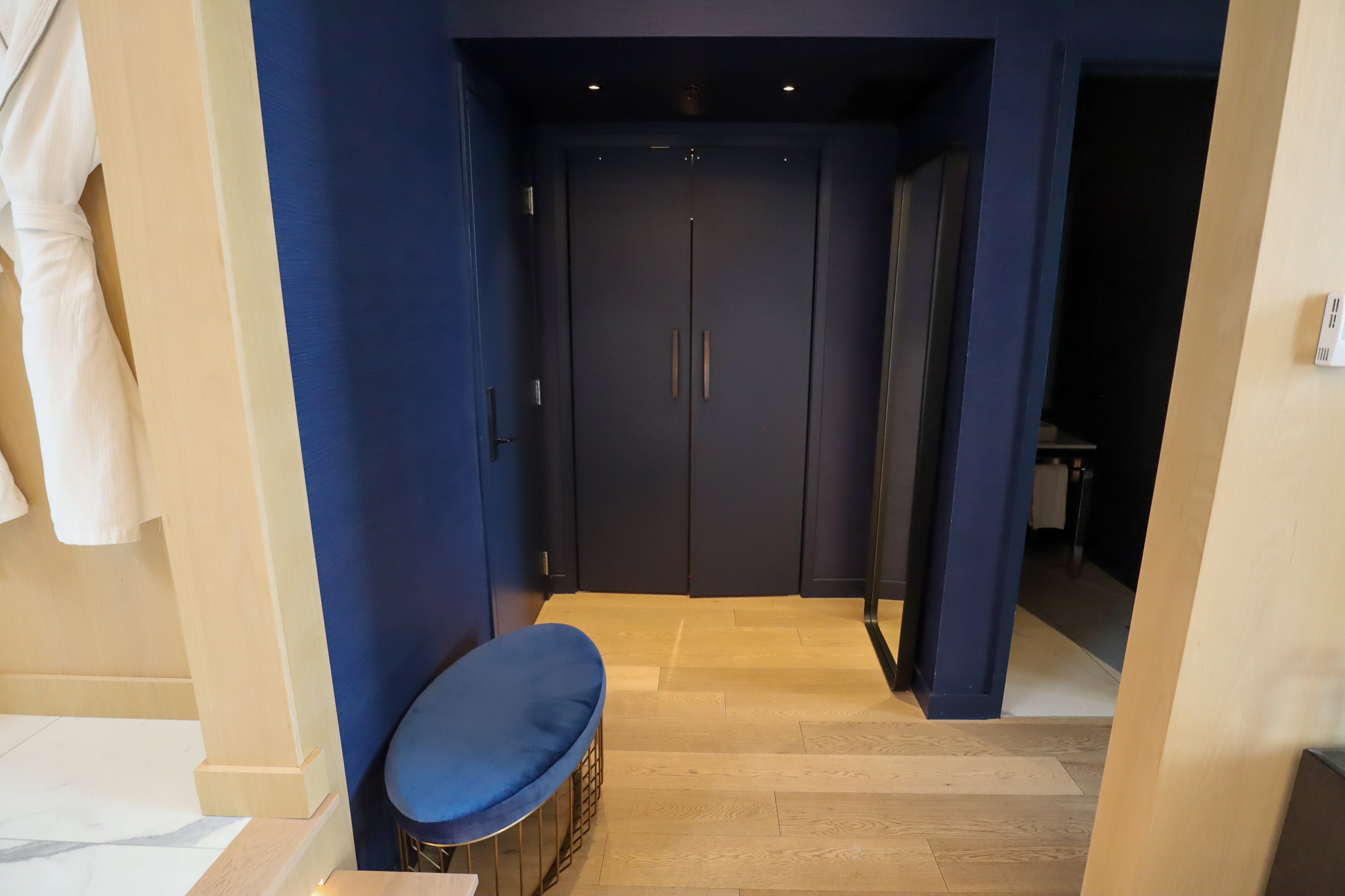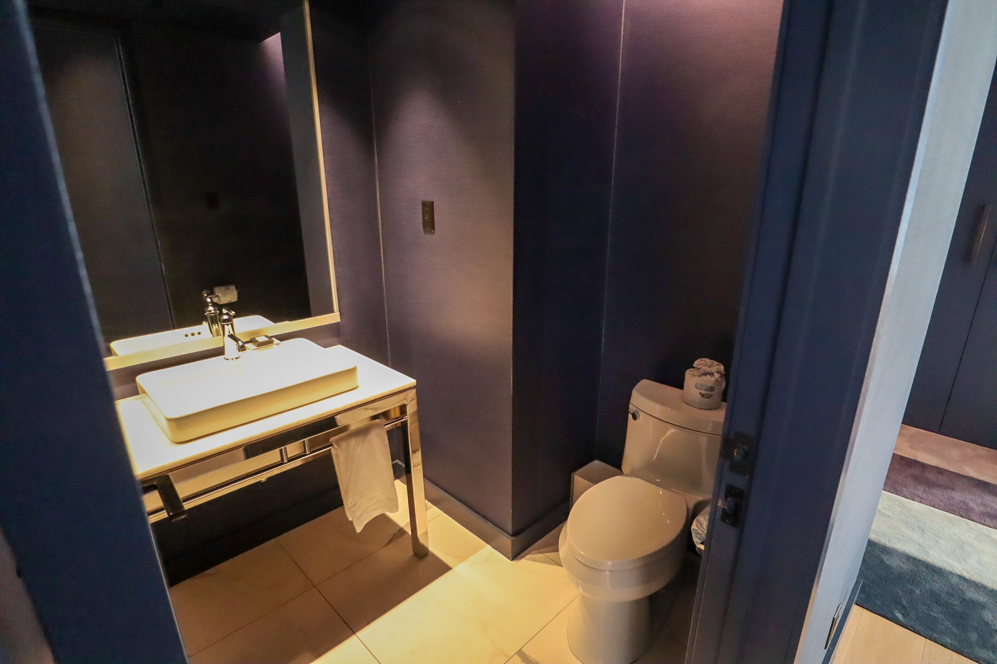 Finally, a few more features round out the Extreme WOW Suite, such as a powder room near the entrance, a series of spacious closets and wardrobes, and even an adjoining kitchenette that consists of a sink and microwave, which is often used for catering purposes when the suite is rented out for events.