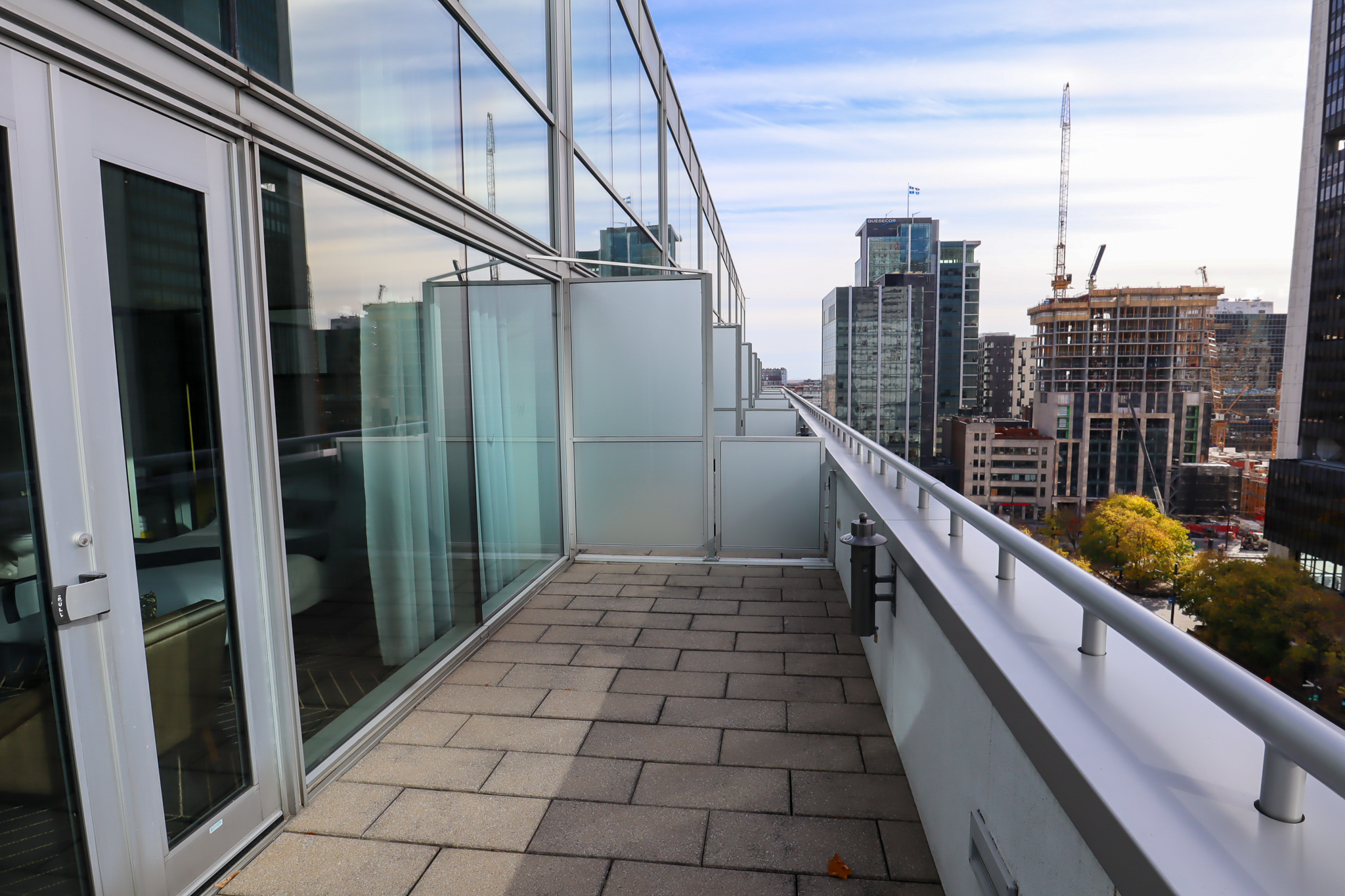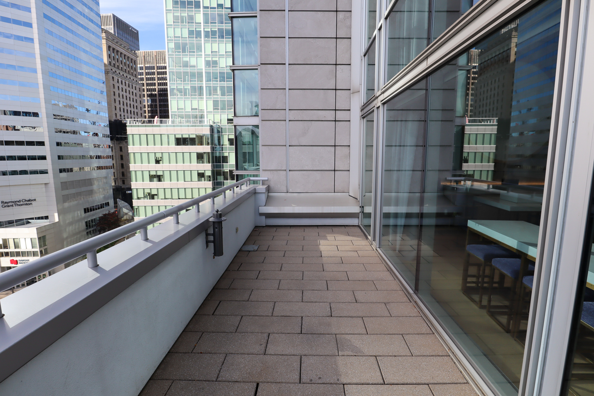 And of course, the balcony, which is fairly wide and seems like a great place to hang out in the summer. Given the hotel’s location, the views mostly consist of office buildings and tower blocks, although the birds-eye view of Square Victoria underneath is quite nice.