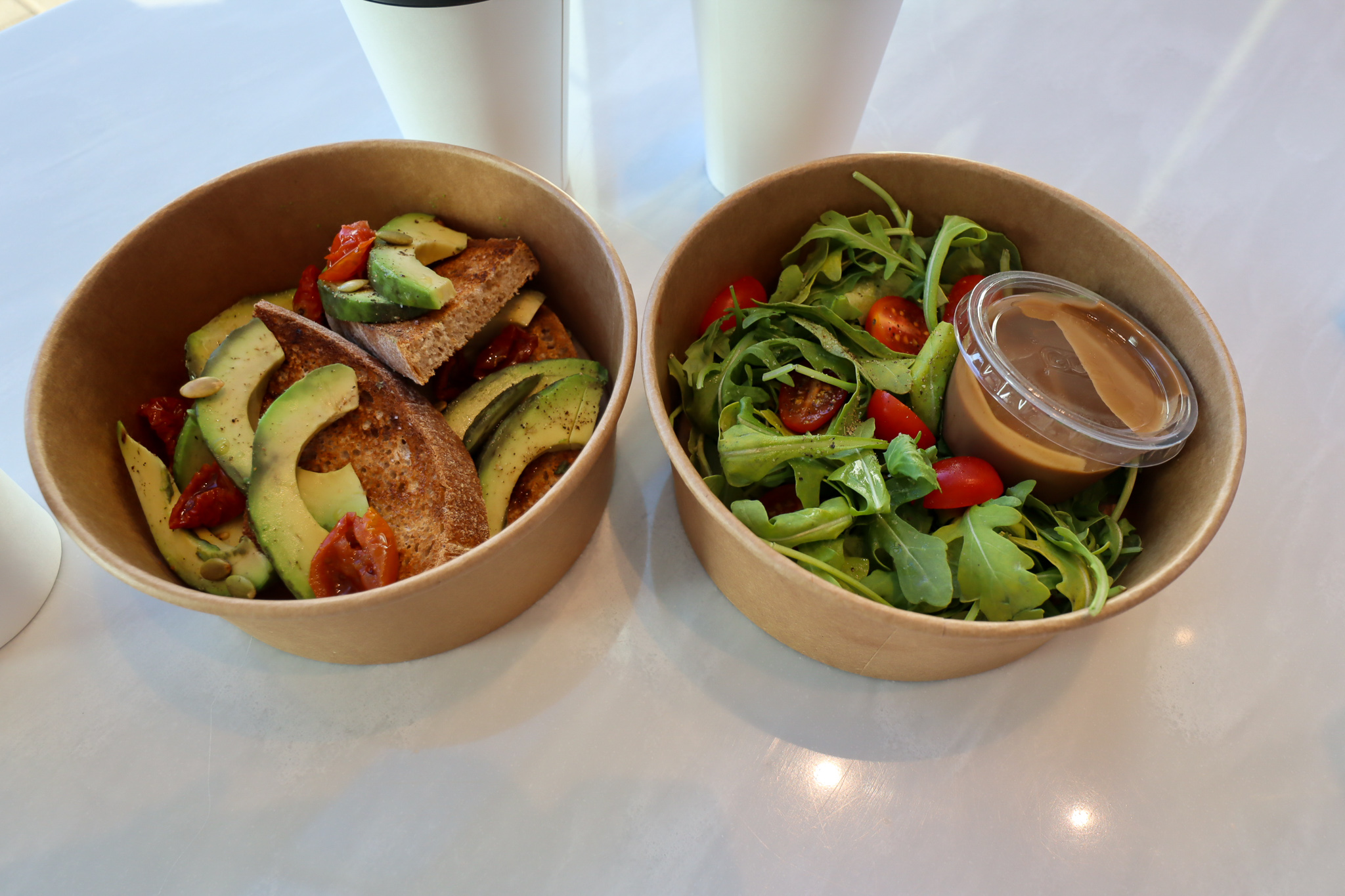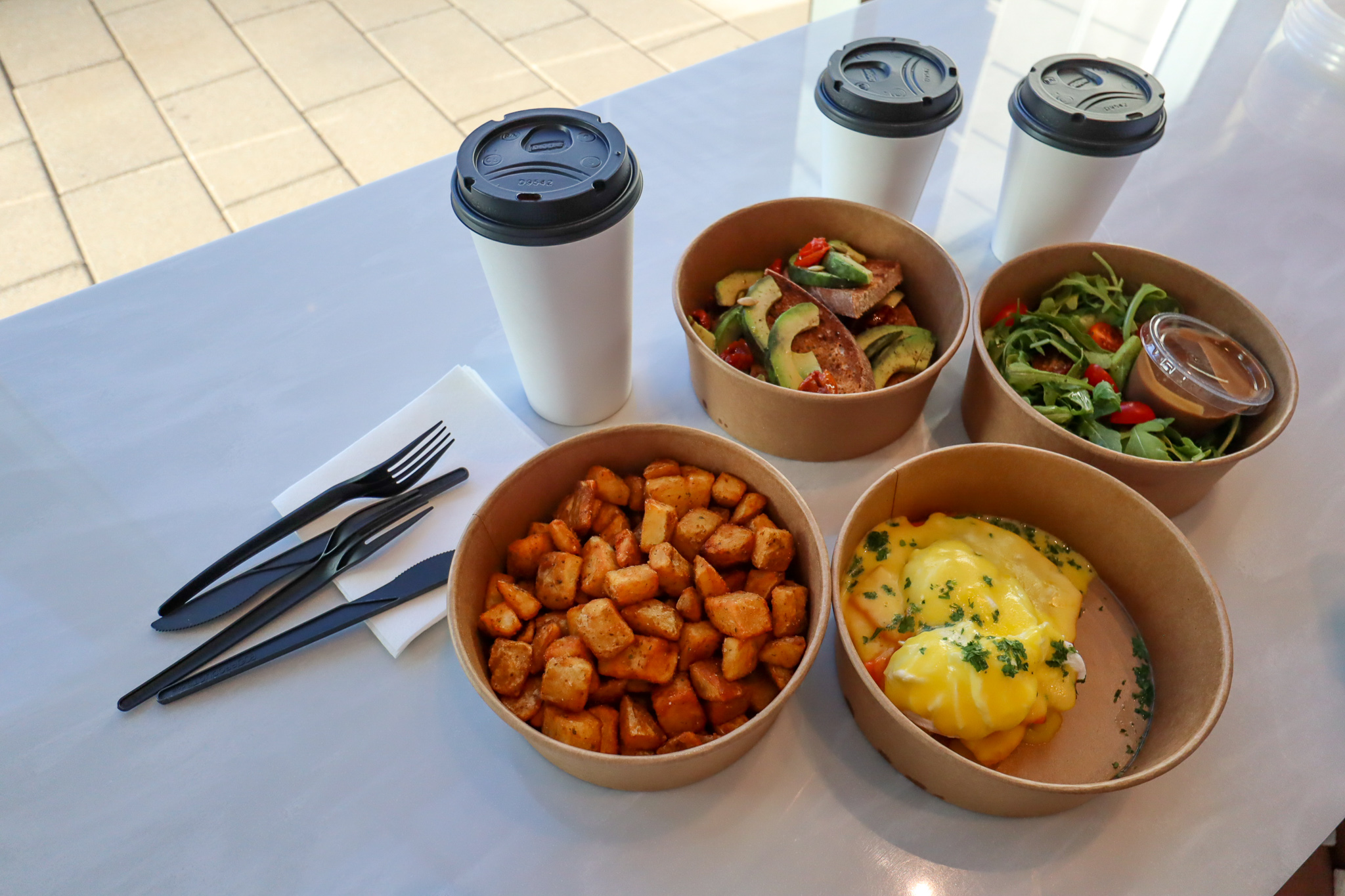 I ordered an Eggs Benedict with home fries on the side, whereas Jessy opted for the avocado toast with salad, and we got some coffee and juice on top of that as well.