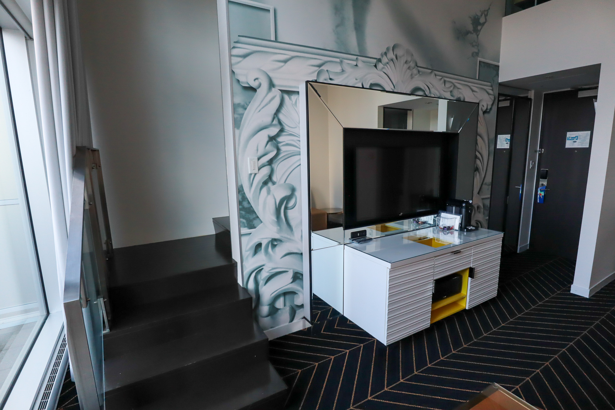 Like the Extreme WOW Suites, the WOW Suites are two-level spaces with floor-to-ceiling windows, and in this case they actually have the living space on the ground floor and a staircase leading up the bedroom on the second level.