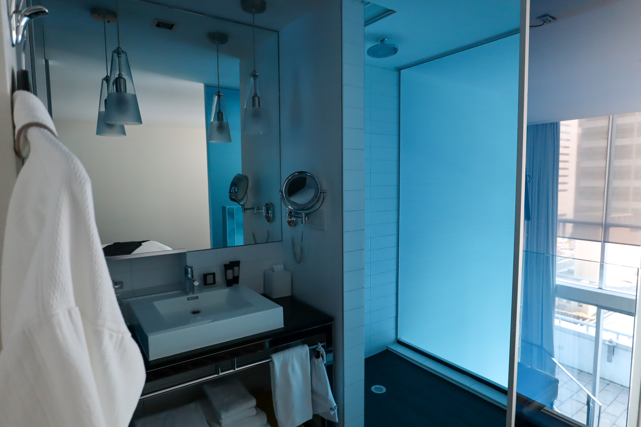 The bathroom (which, notably, does not offer a bathtub) affords a very slight degree of greater privacy than the Extreme WOW Suite, but not by much: the shower is encased in clear blue glass planes, meaning that everyone downstairs can kind of see what’s happening up here.