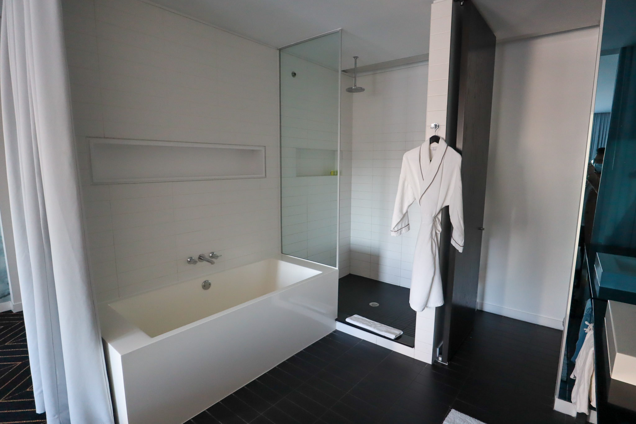 The king bed, chaise longue, working area, and bathroom are all quite large, and there’s still ample space in the room beyond the interior furniture. The bathroom even offers – gasp! – some measure of privacy in the form of a set of curtains.
