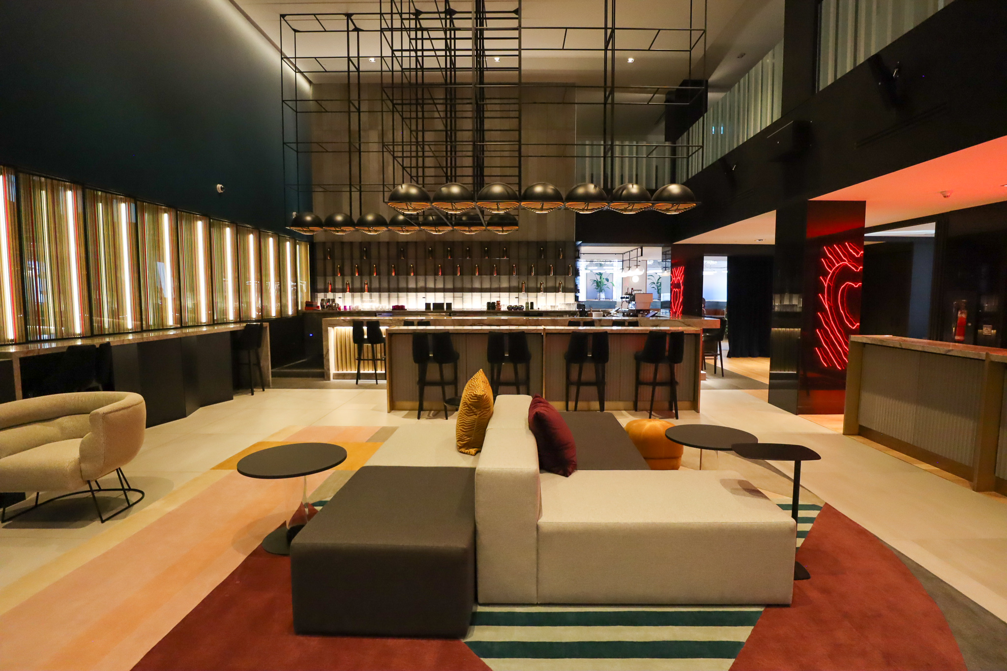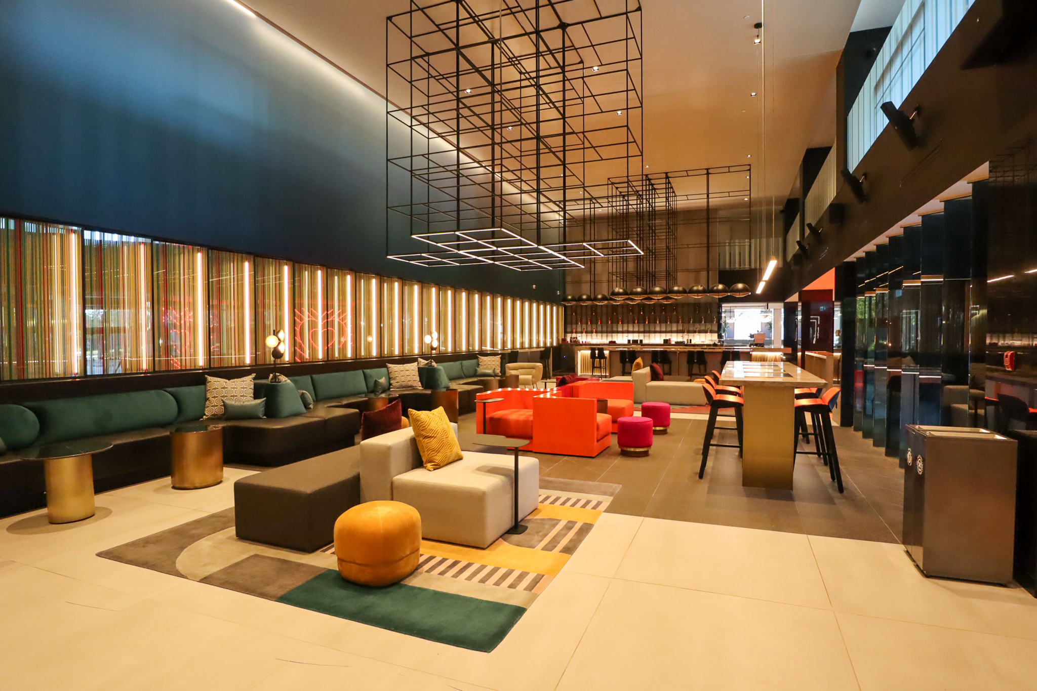 The lobby lounge draws upon a multicoloured palette and a variety of different lighting styles (take note of the geometric cube-shaped light fixtures inspired by Montreal’s Habitat 67 housing complex, which we’ll see again later on).