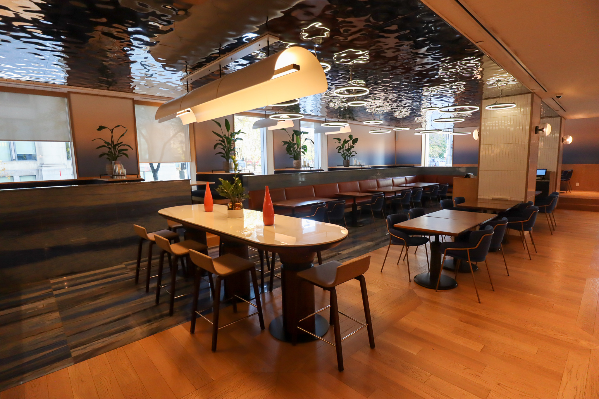 To the side, we have another lattice-like table with seating for eight, bathed in sunlight by the impressive floor-to-ceiling windows with commanding views of Square Victoria outside. We’ll come back and check out the balcony momentarily.