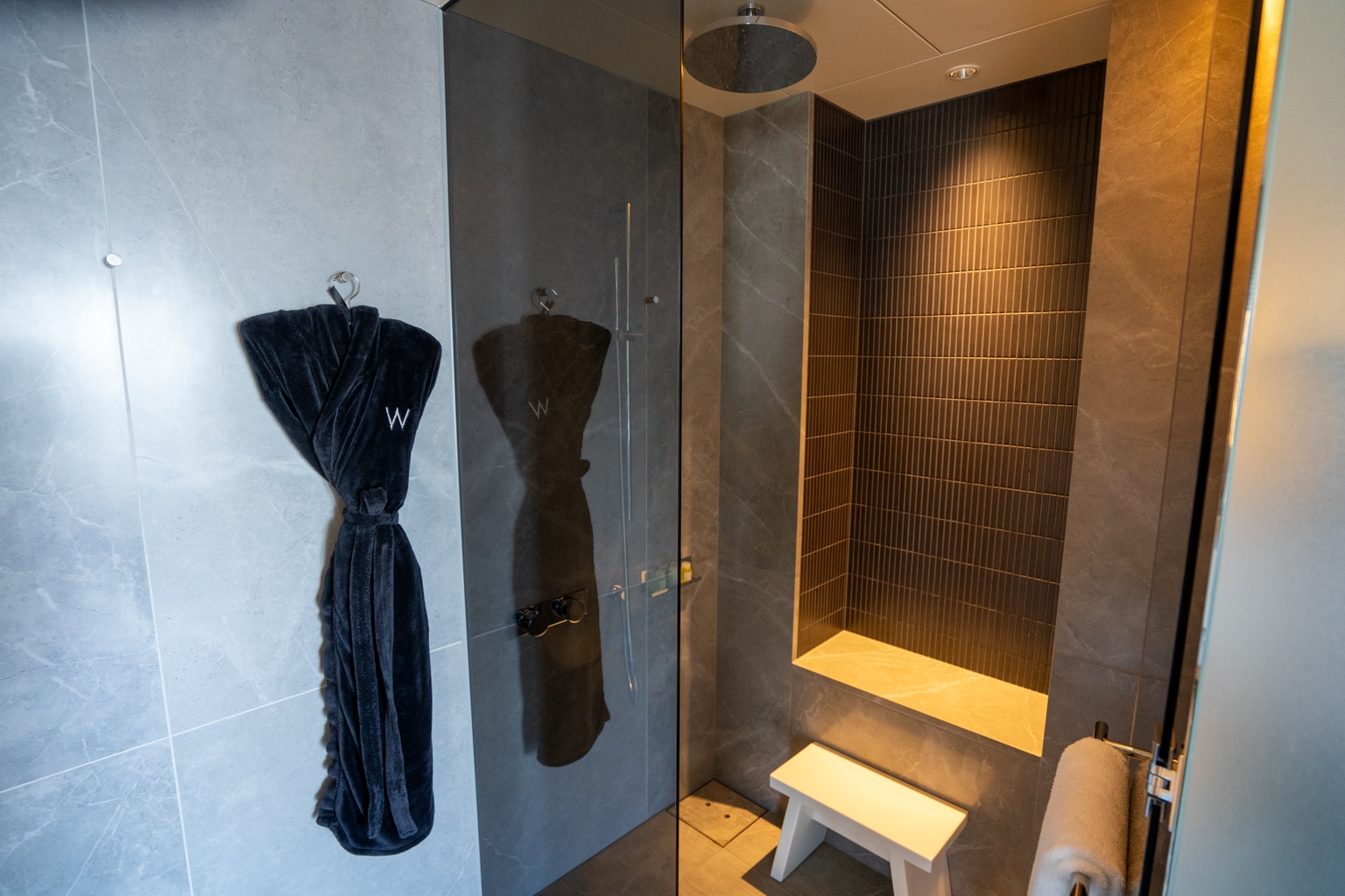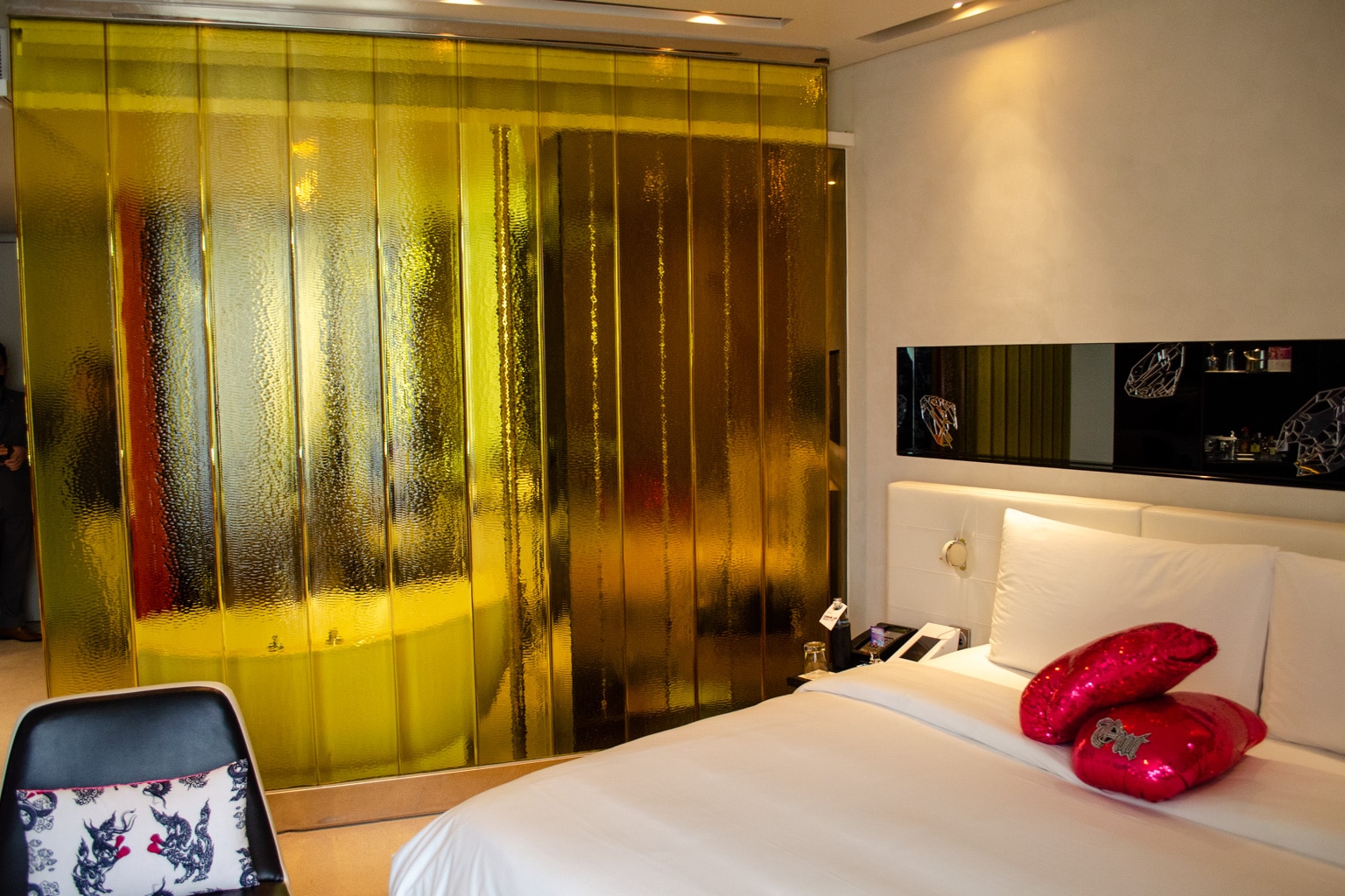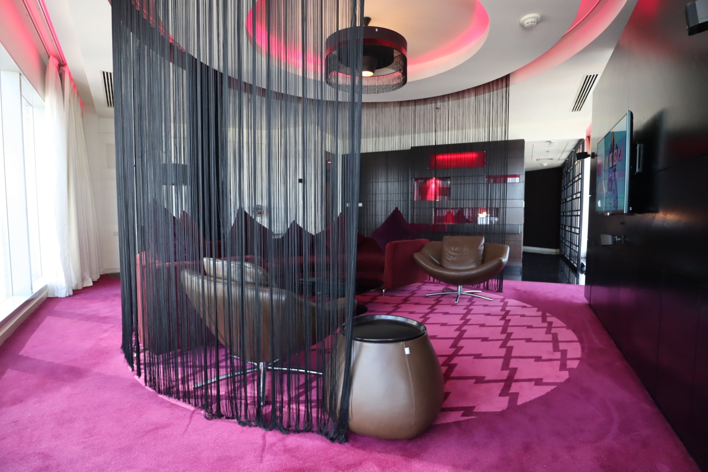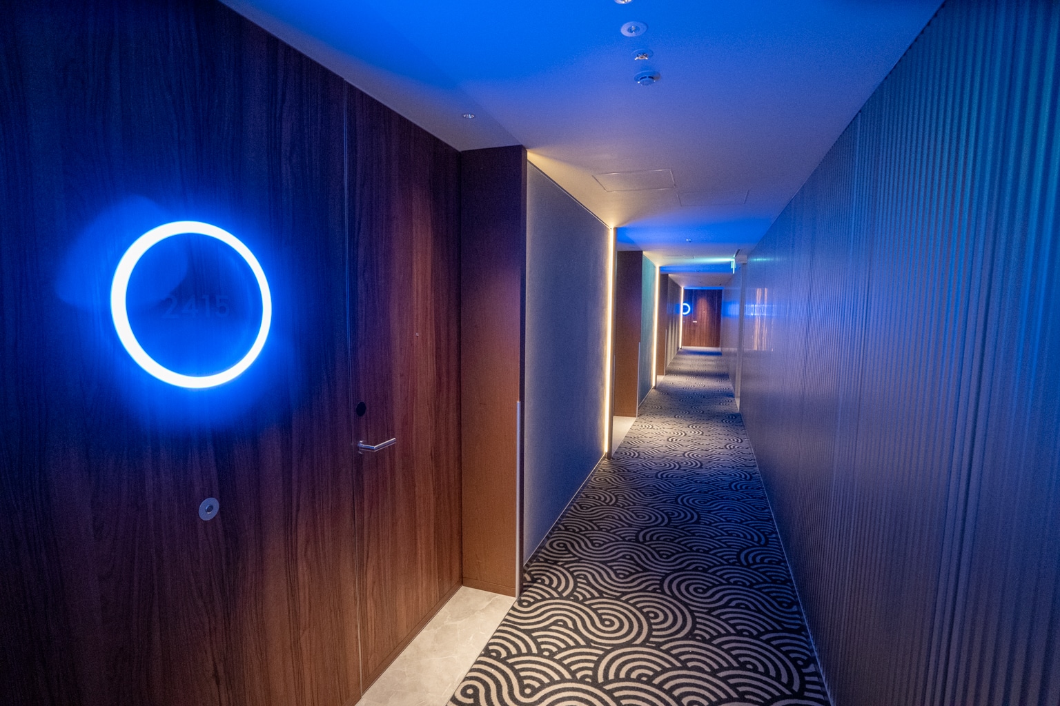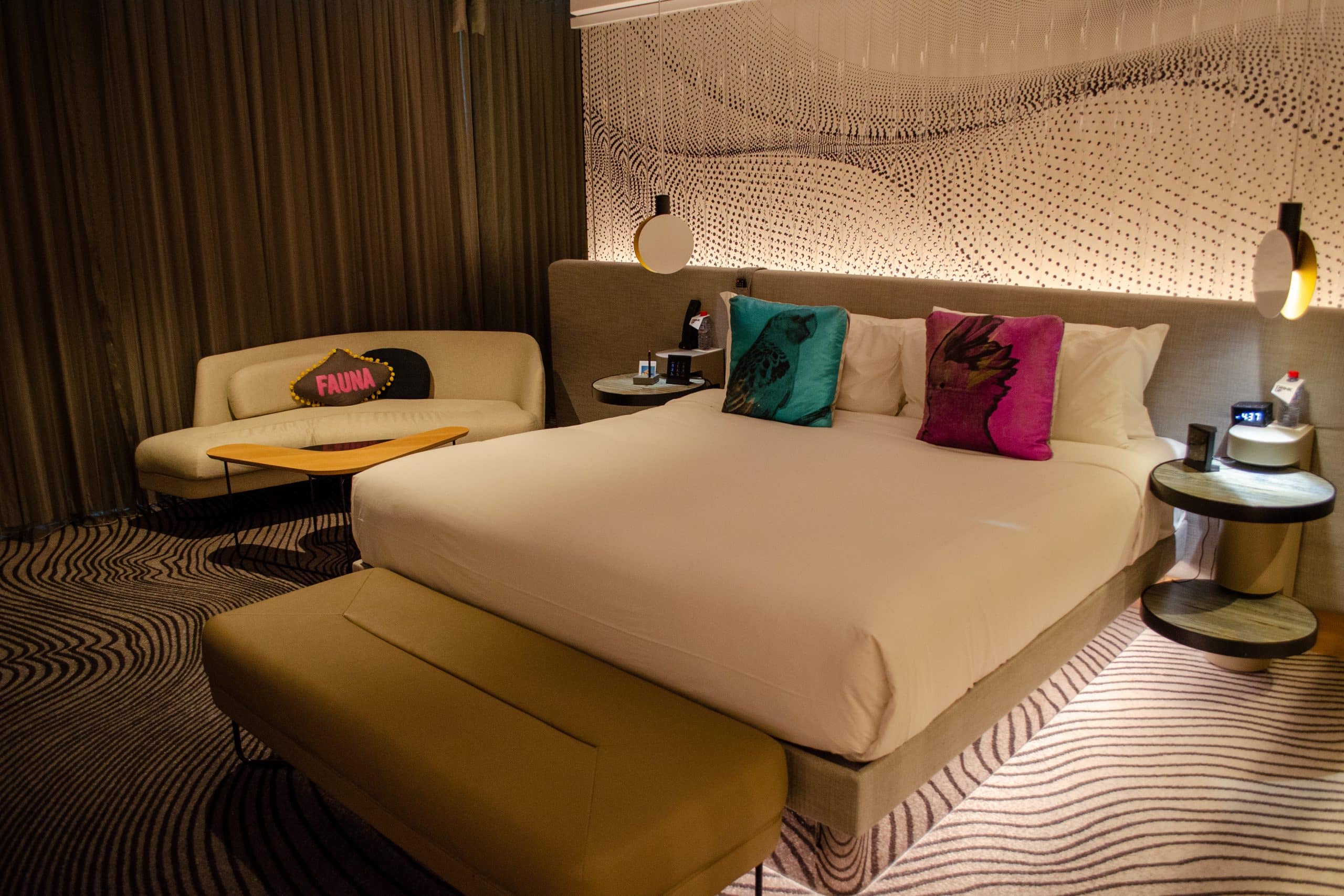 Stepping into the guest room hallway, you’ll encounter neon lights and quirky floor patterns that are typical of the W brand.