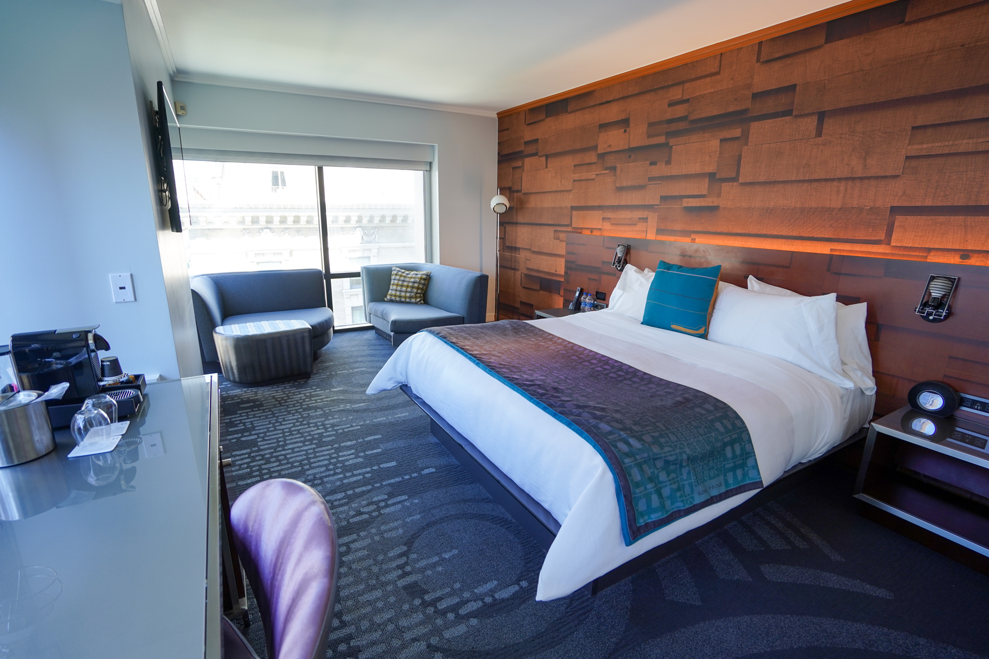 The flat-screen TV sits within an oak wooden enclave, fronting the king bed. Next to the bedroom’s windows, there is a small seating area and a mirror.