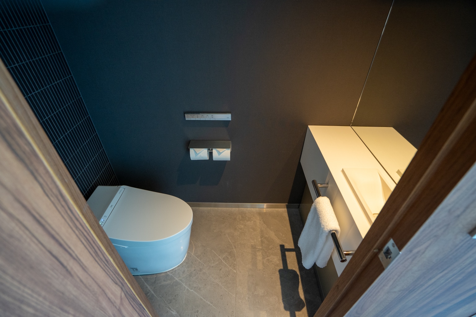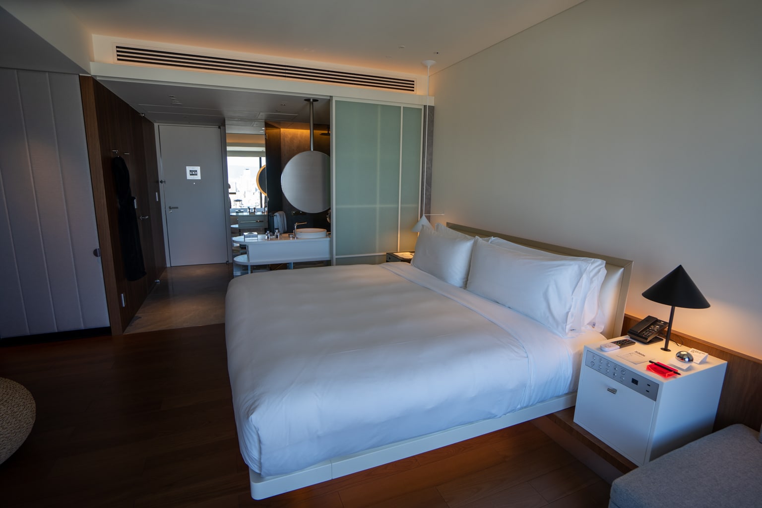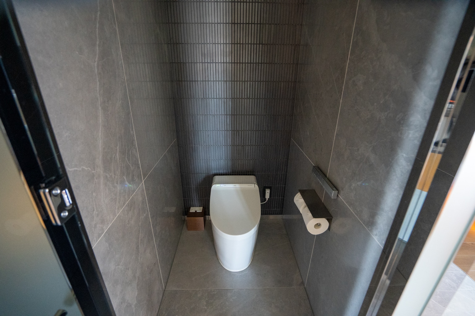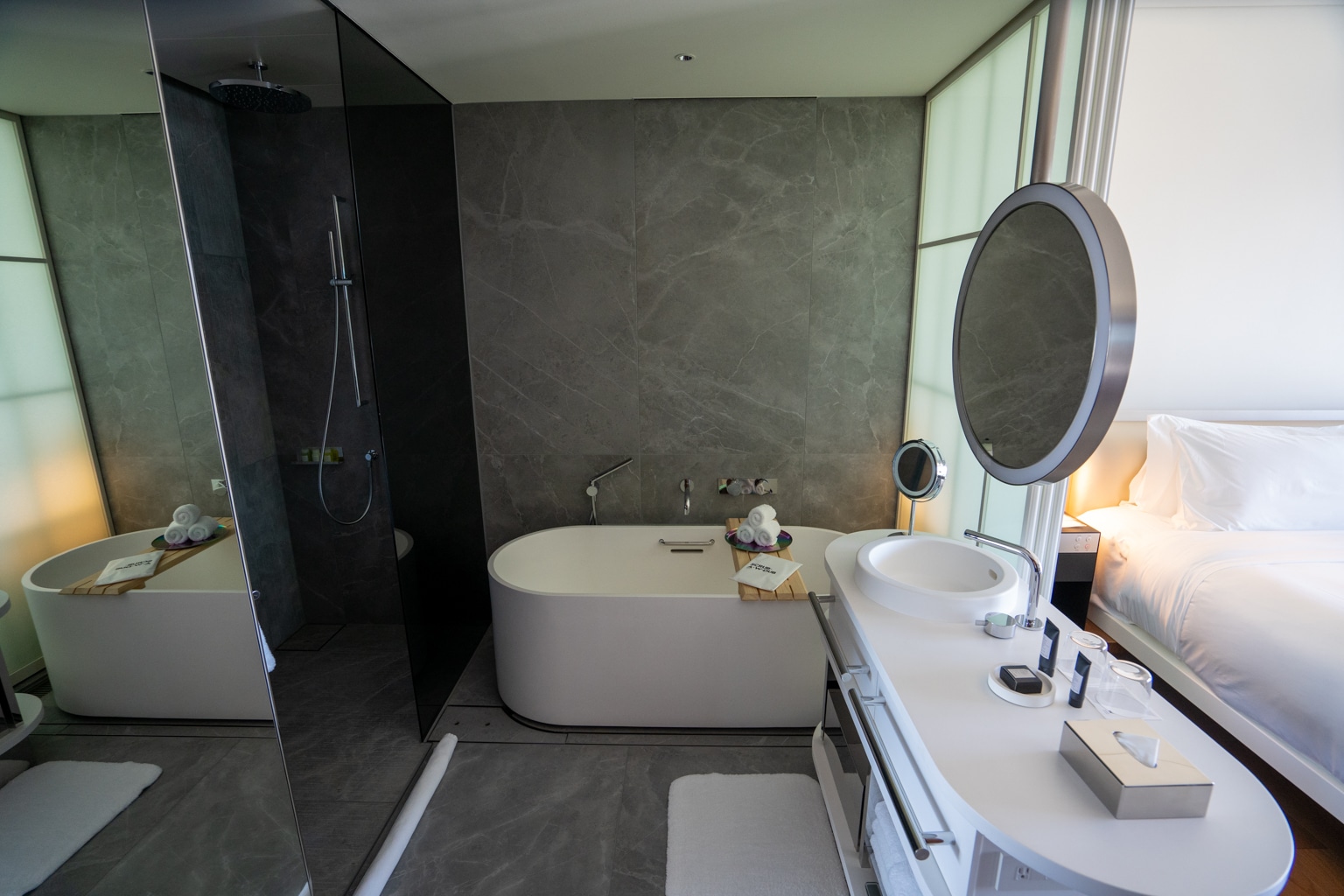 The bathroom of the suite is semi-open, separated by a frosted sliding screen door. The space is beautiful, its walls and floors adorned with grey marble.