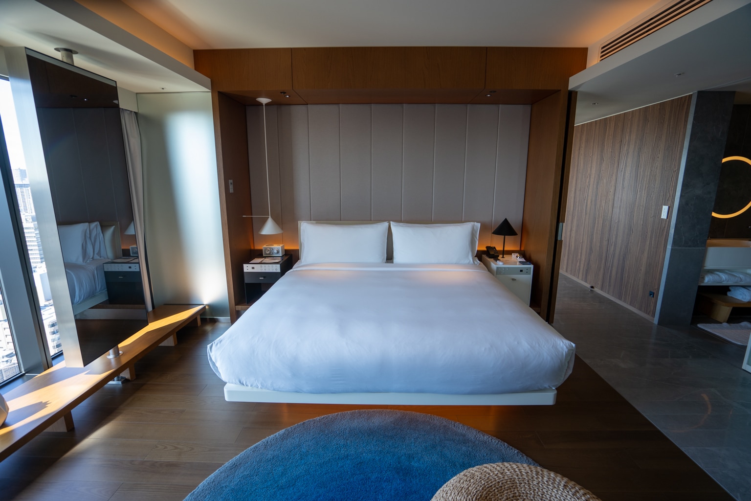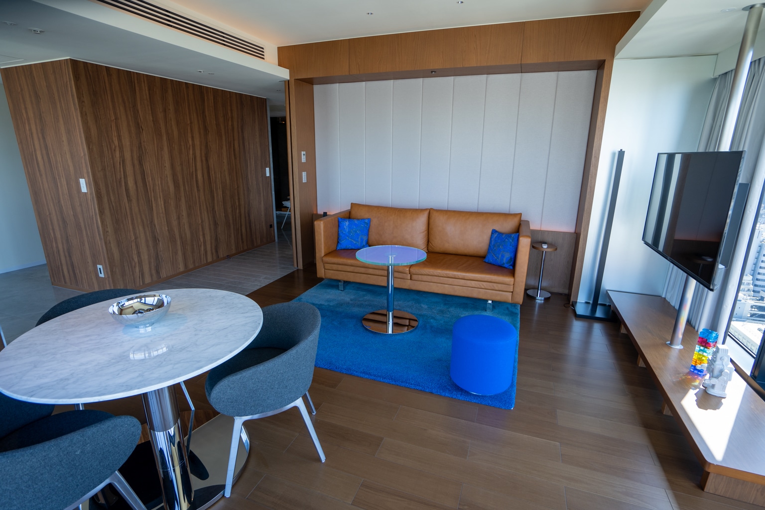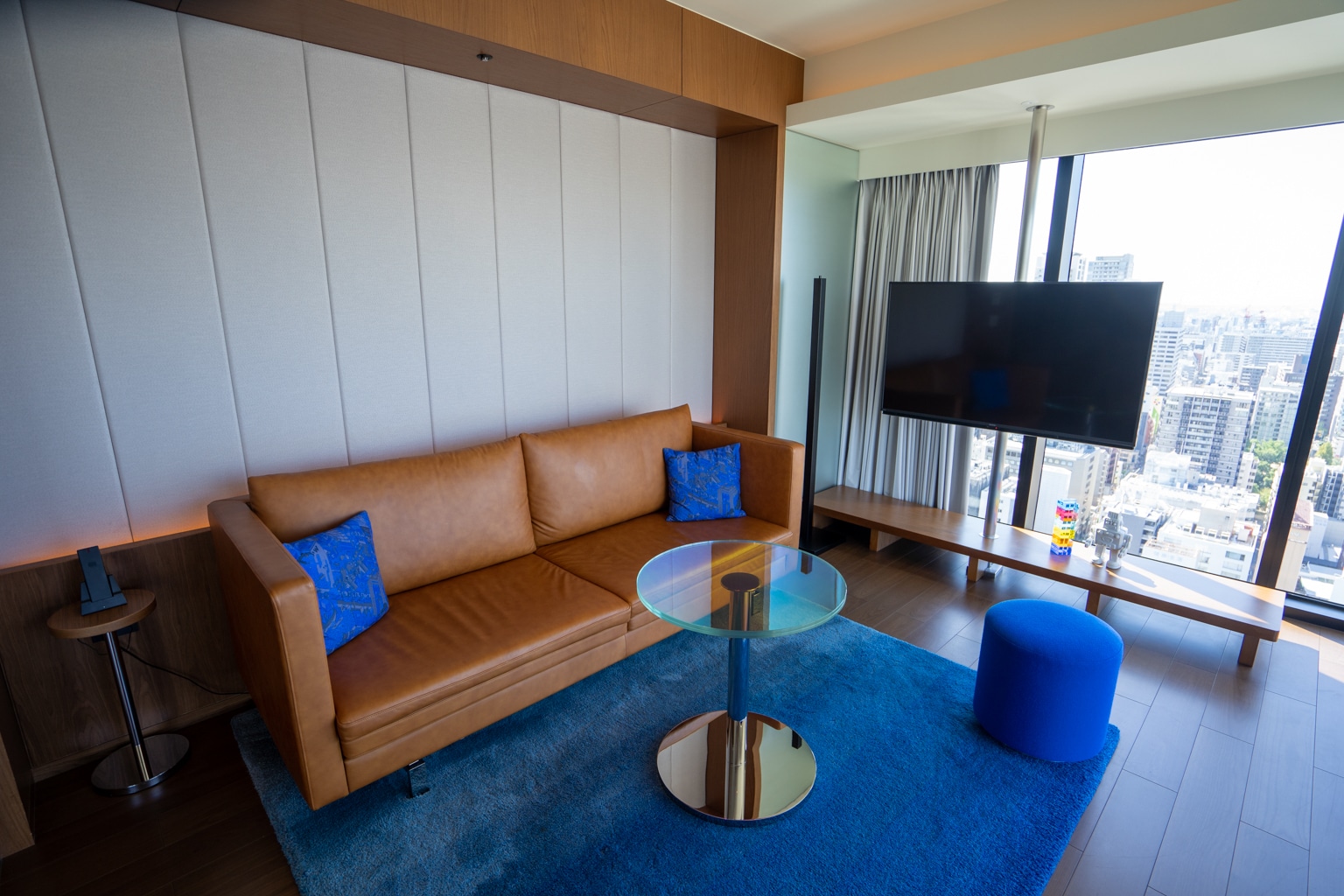Each room at the W Osaka has a different colour palette, according to its floor. The theme here at the Marvelous Suite was a vibrant blue that can be seen in the rugs and decorative details of the suite.