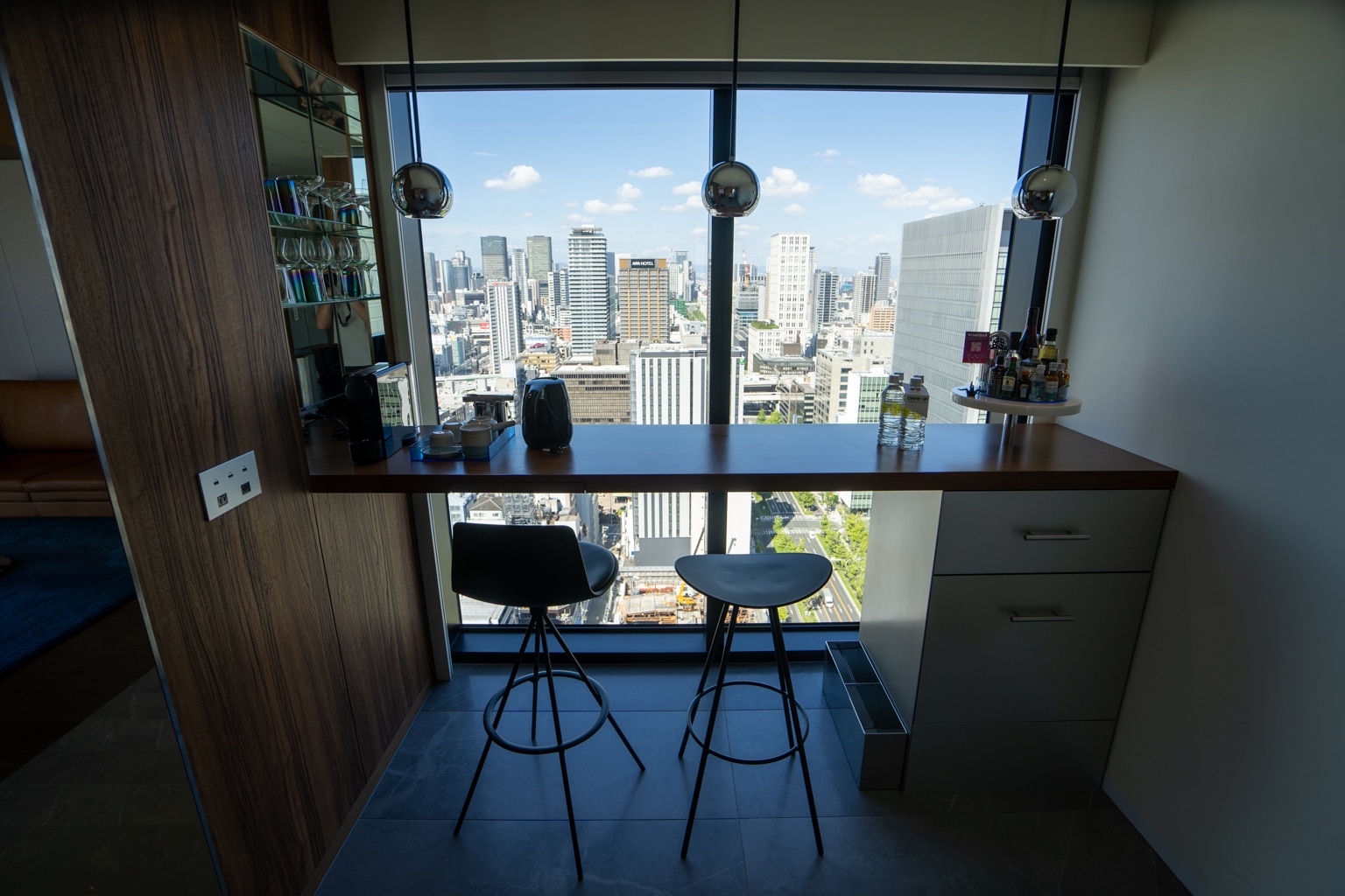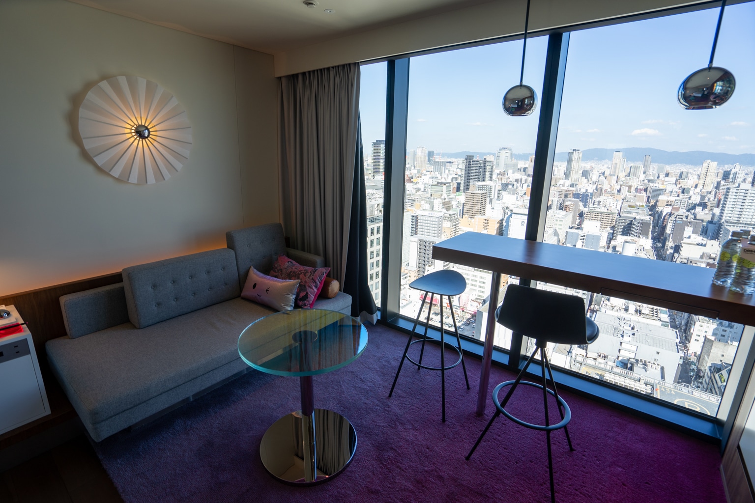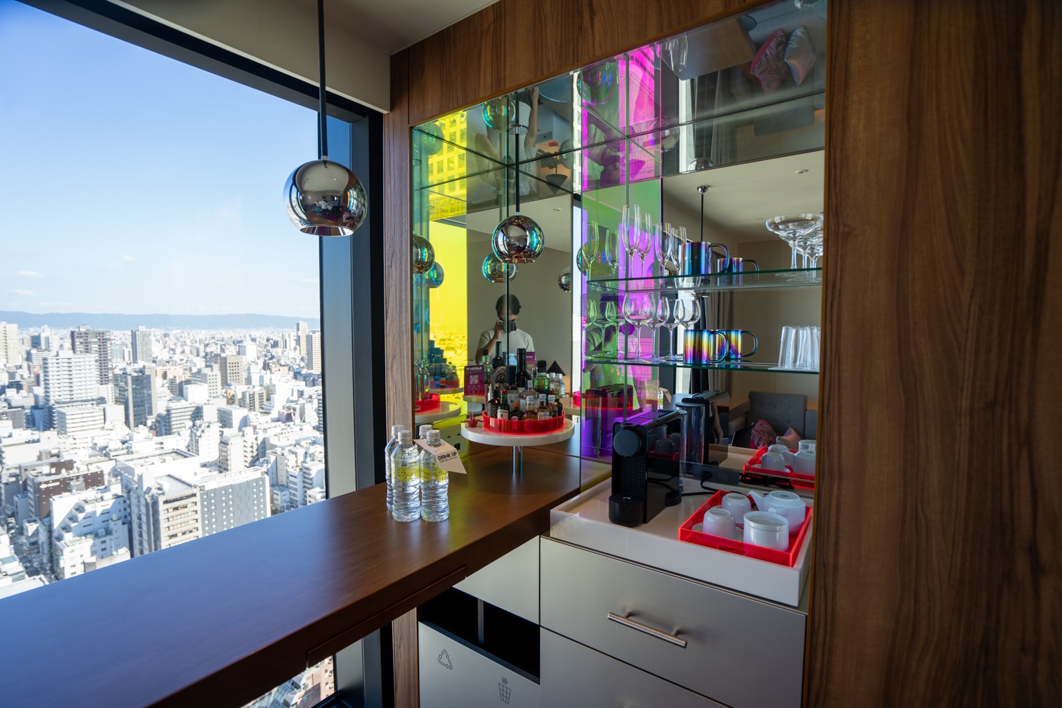 At the far end of the room, a colourful mini-bar is tucked away next to a window with a sweeping view of Osaka.