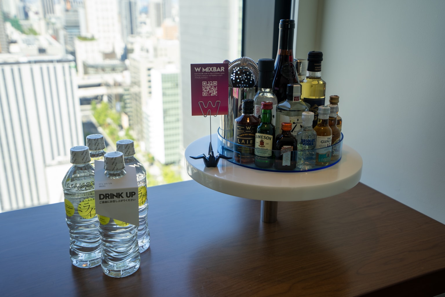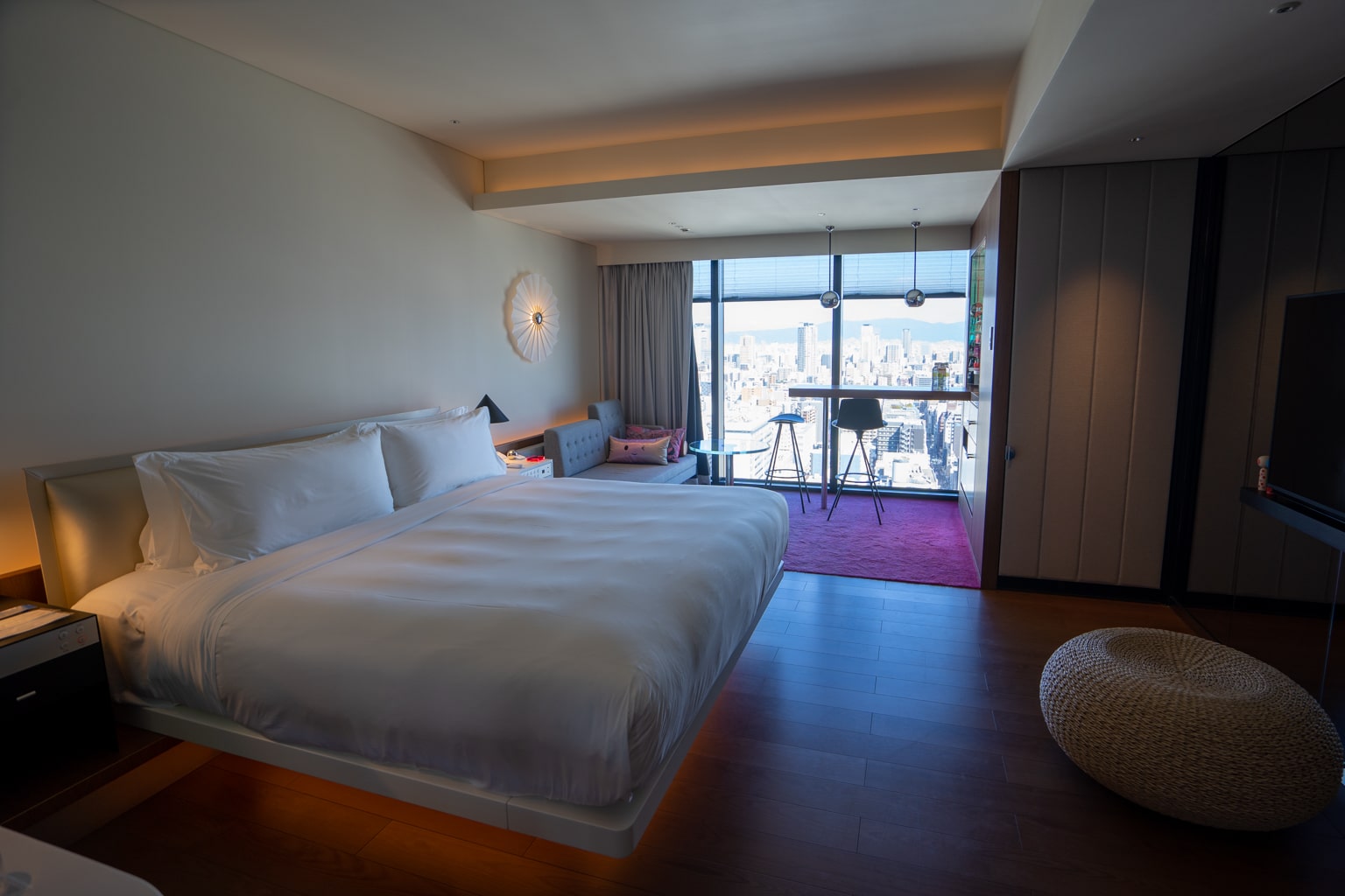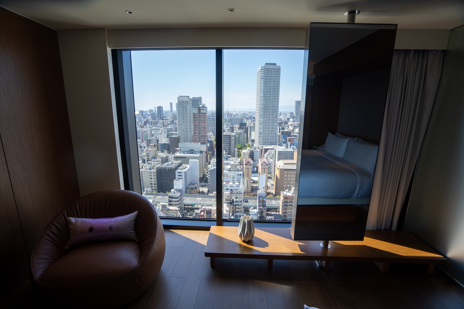 At the far end of the room, a colourful mini-bar is tucked away next to a window with a sweeping view of Osaka.