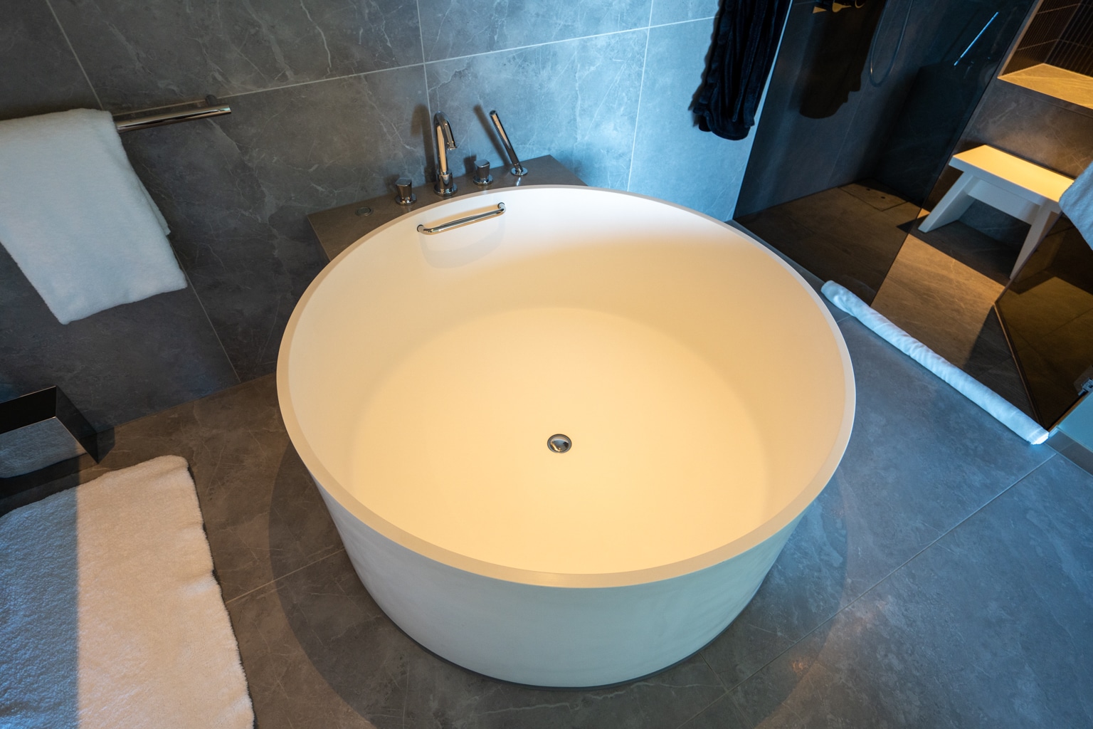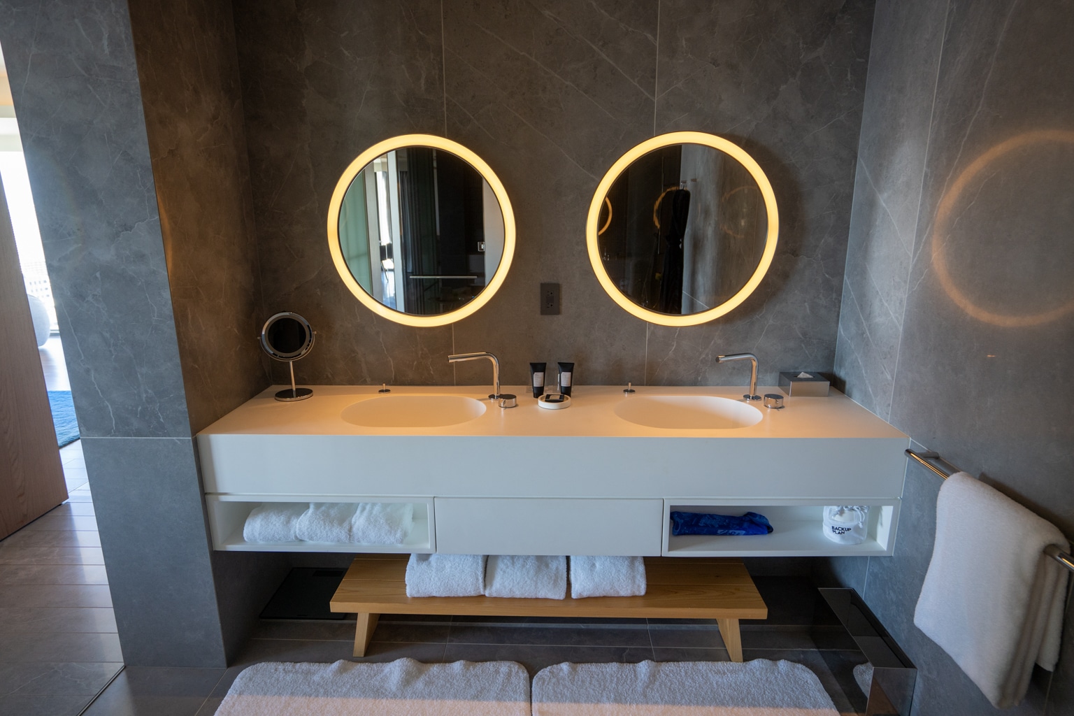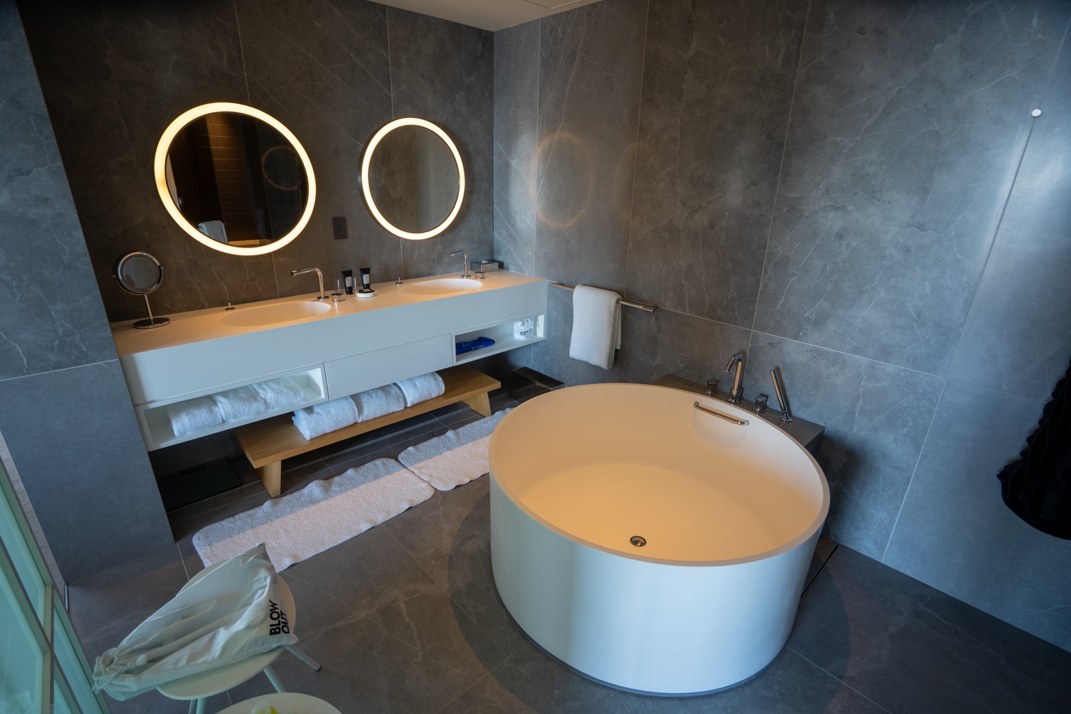 Behind the doors are a large circular-shaped bathtub and a double vanity with round LED mirrors. The shower and toilet are housed in their own respective chambers.