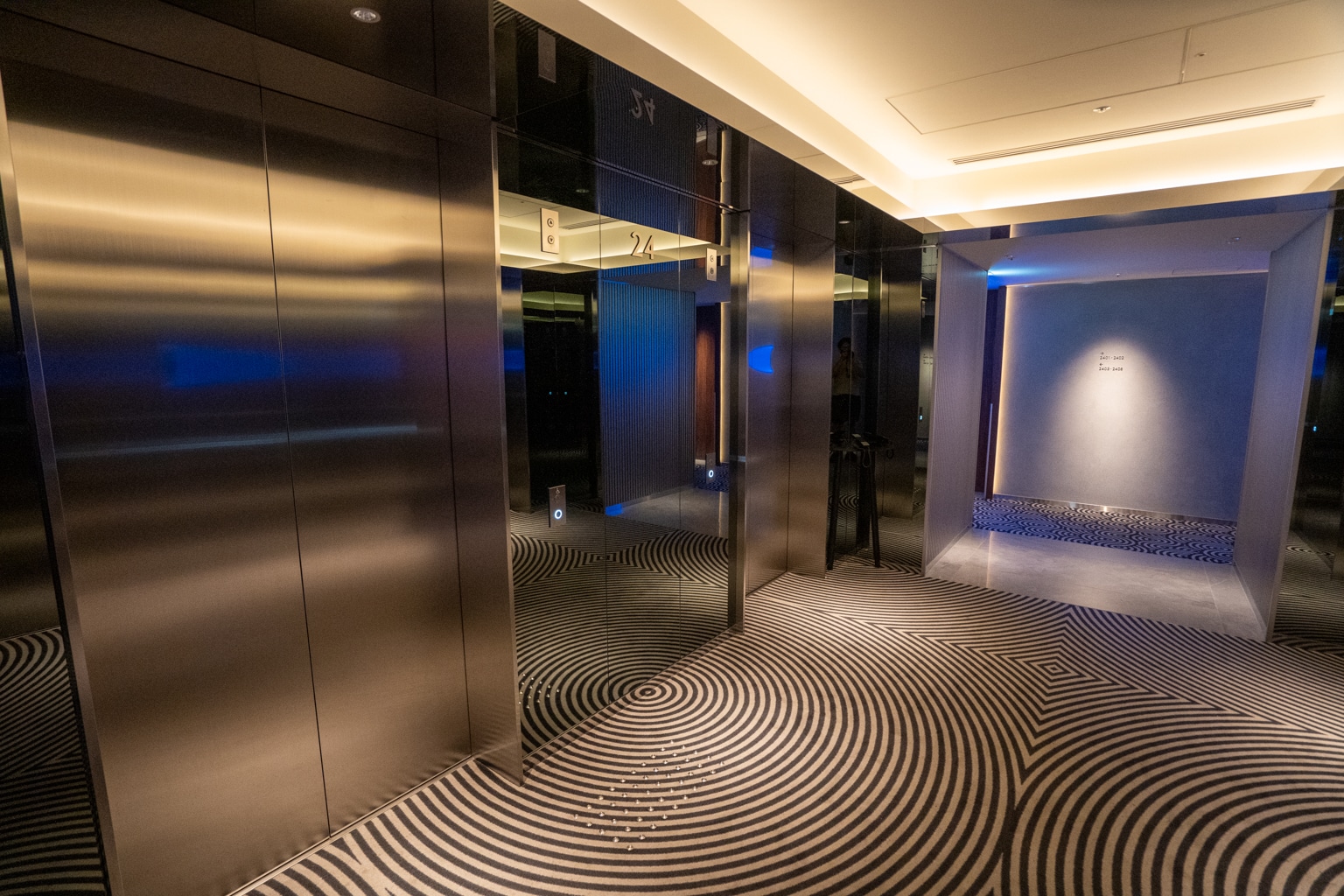 Depending on the floor, the room numbers are illuminated with neon lighting that emits a blue or pink glow.