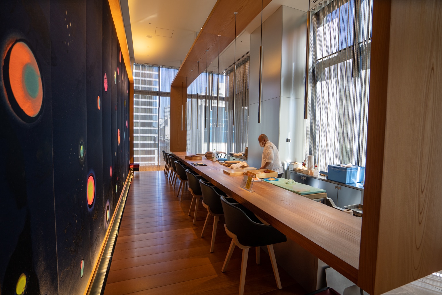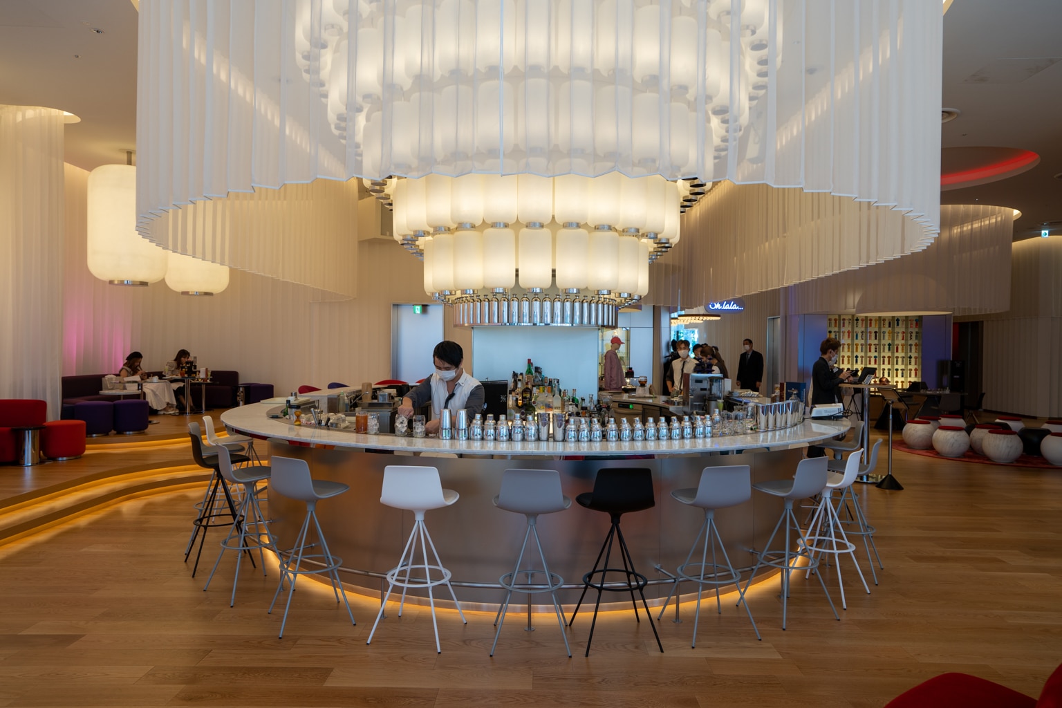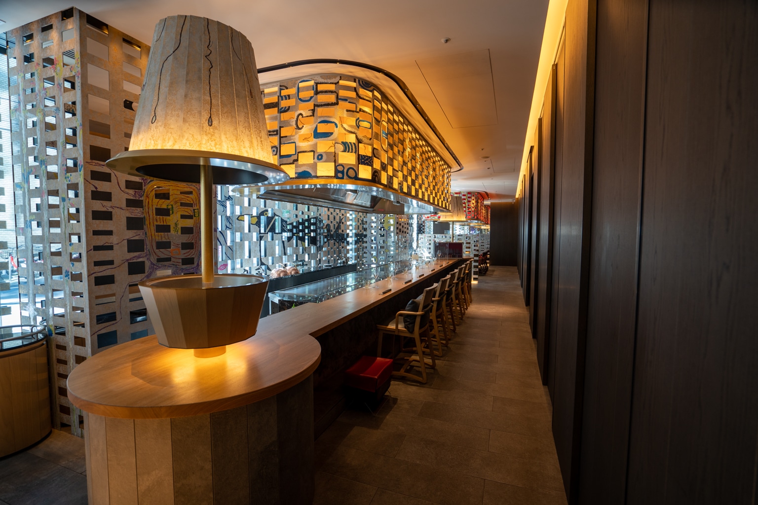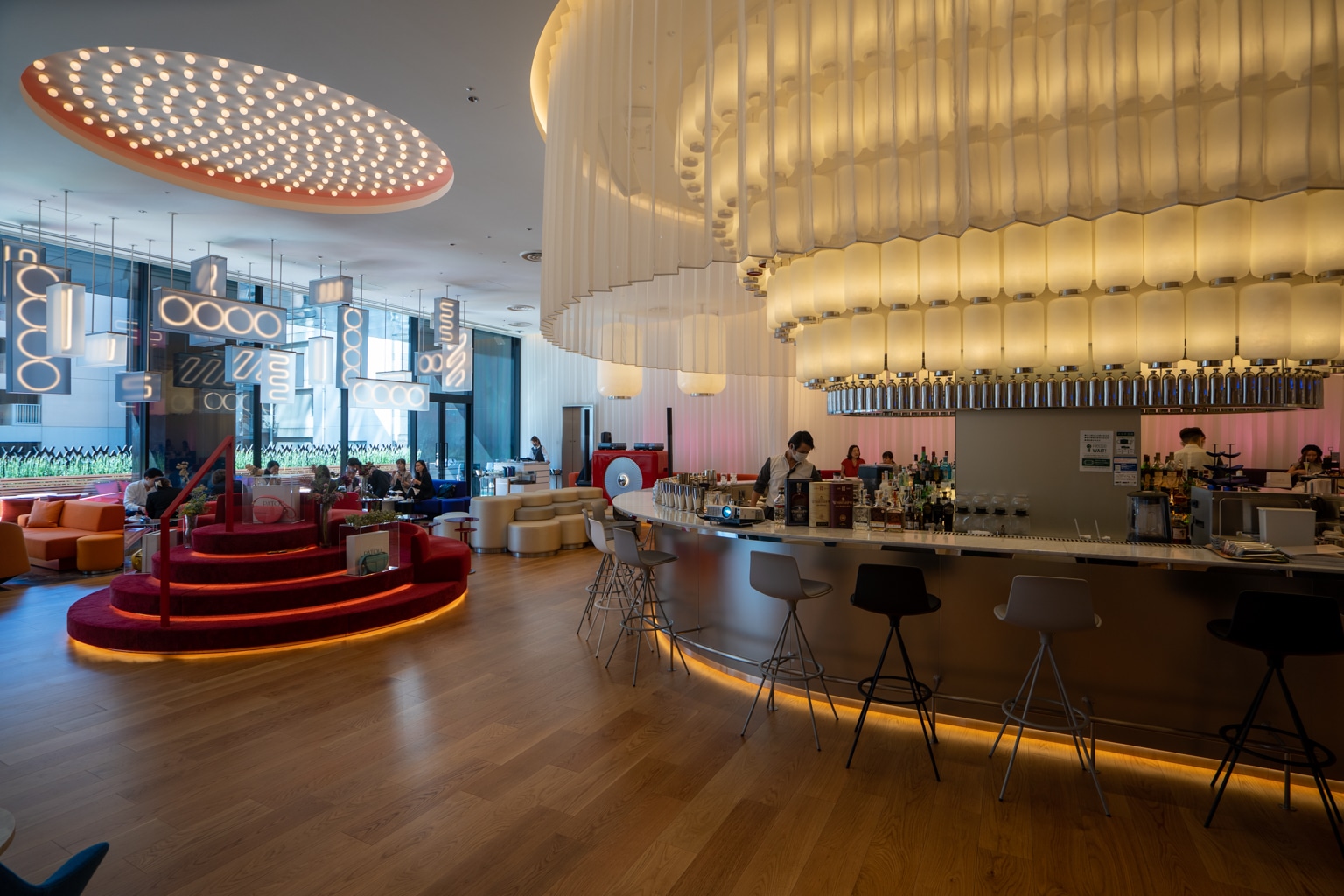 These interiors draw a contrast between the minimalism of Japanese design and the maximalism of urban life, as exemplified by the lengthy tunnel lined with circular patterns that you first walk through upon entering.