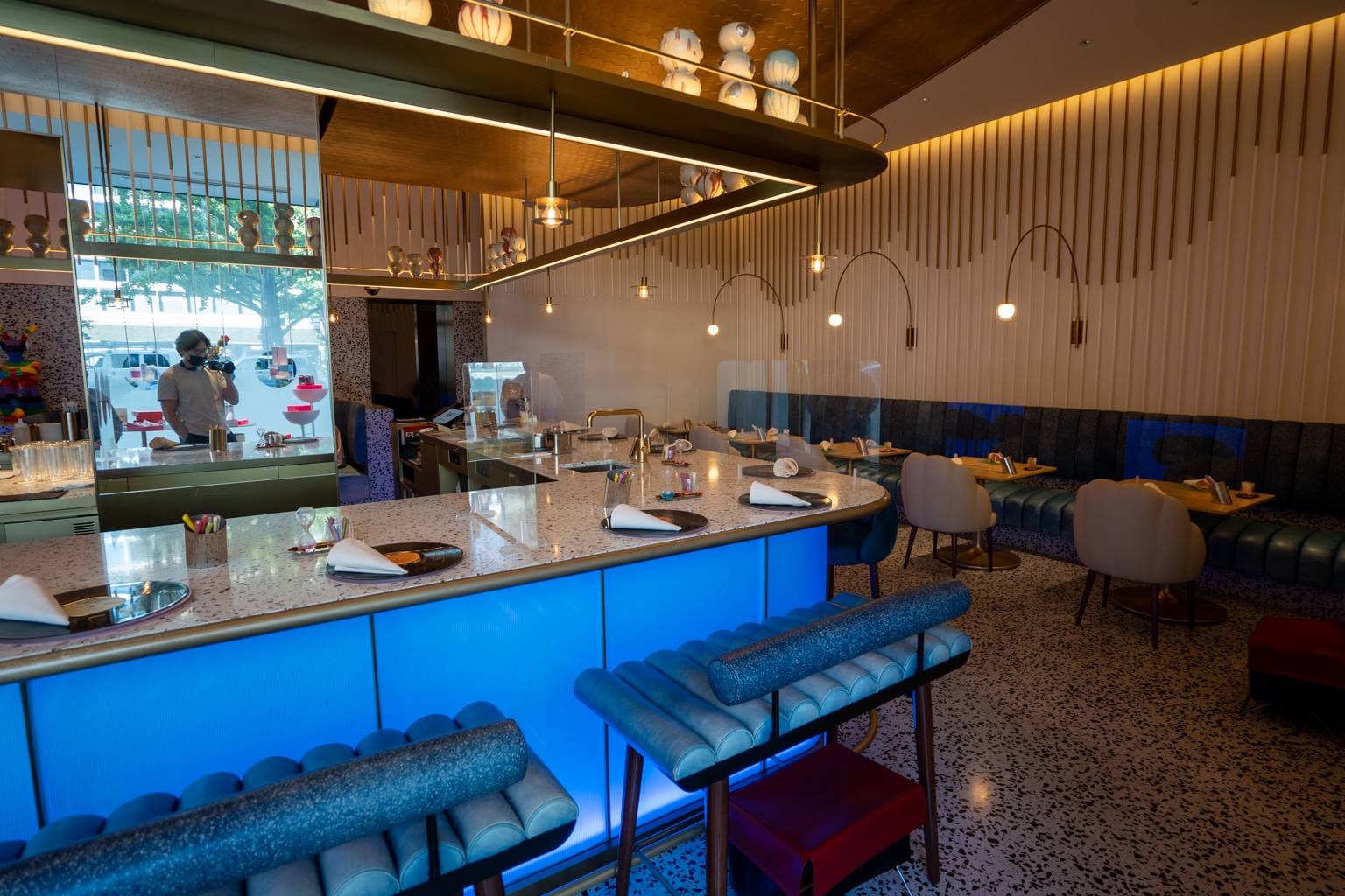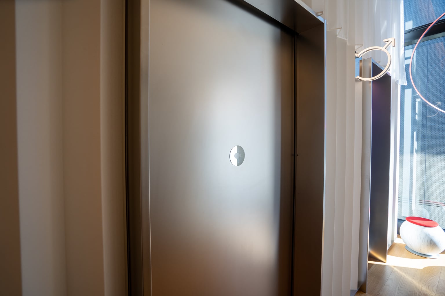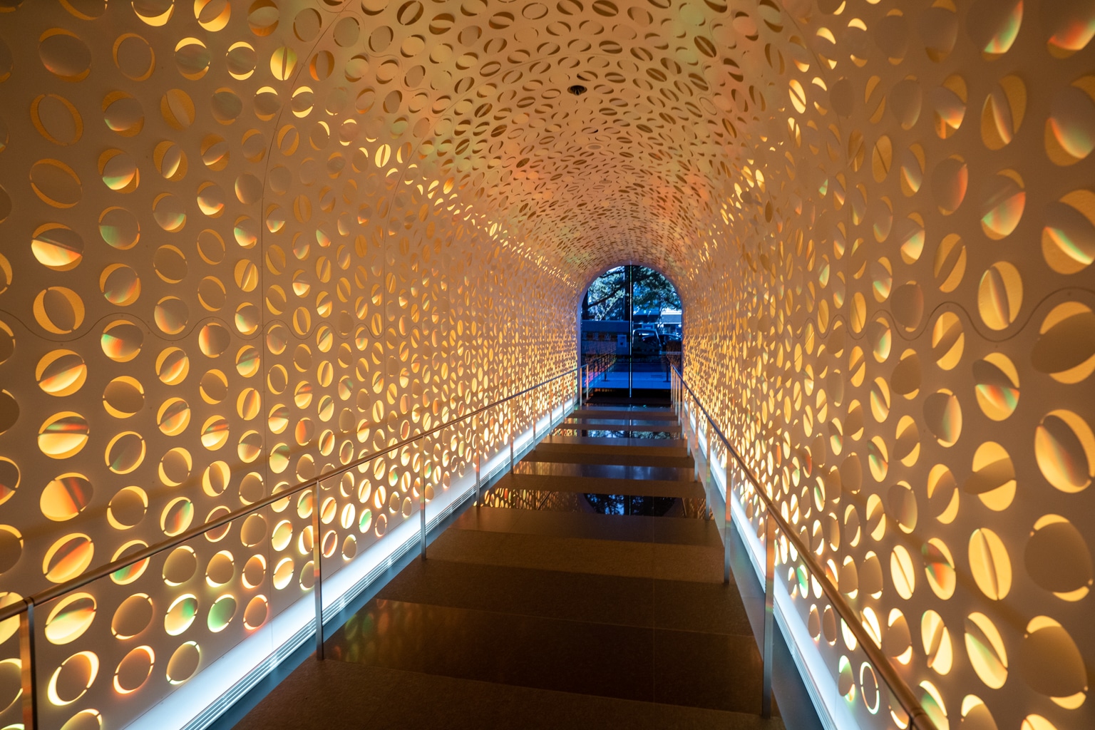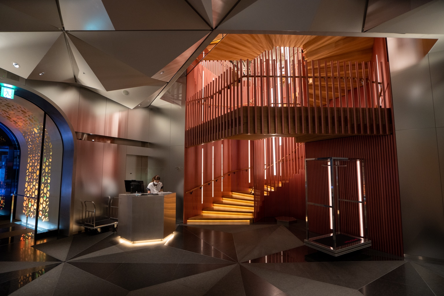 These interiors draw a contrast between the minimalism of Japanese design and the maximalism of urban life, as exemplified by the lengthy tunnel lined with circular patterns that you first walk through upon entering.