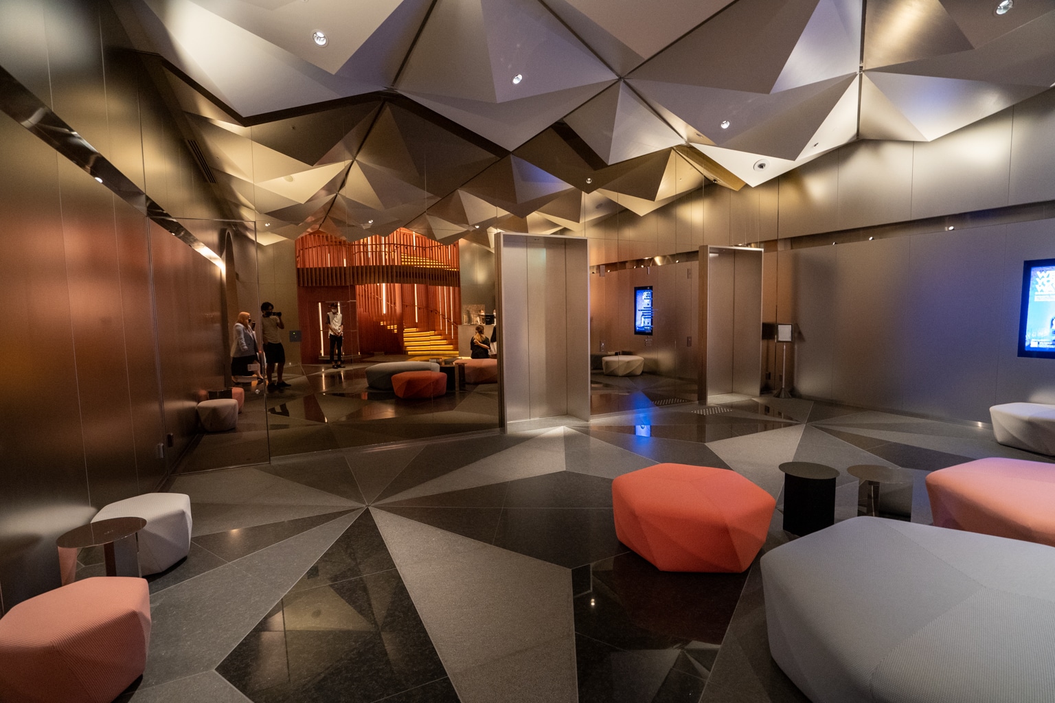 The arrival lobby features a striking 3D geometric Asanoha design on the ceiling, recreating a popular Japanese traditional motif. The granite flooring and the ottomans scattered across the lobby employ the same concept.