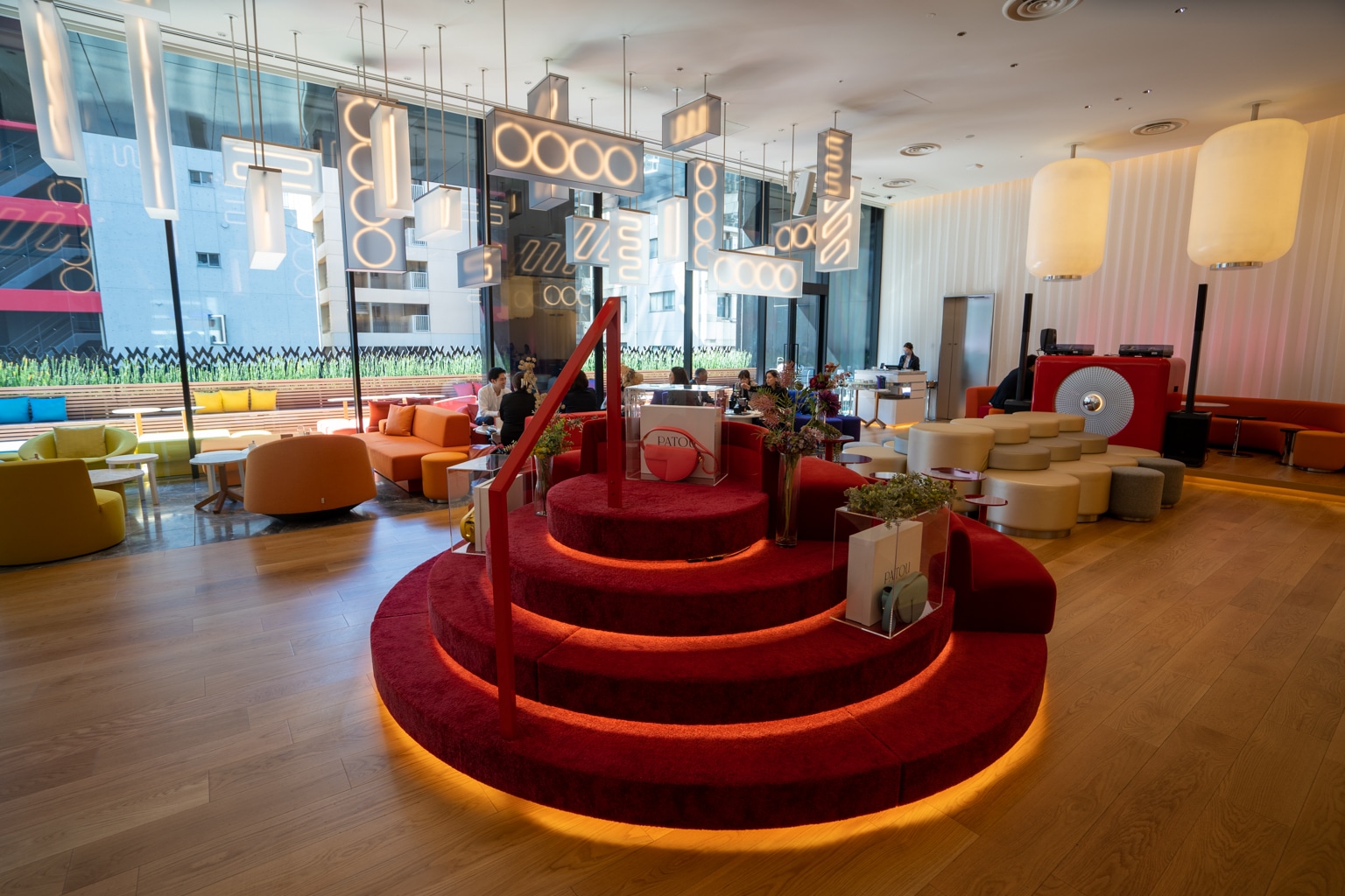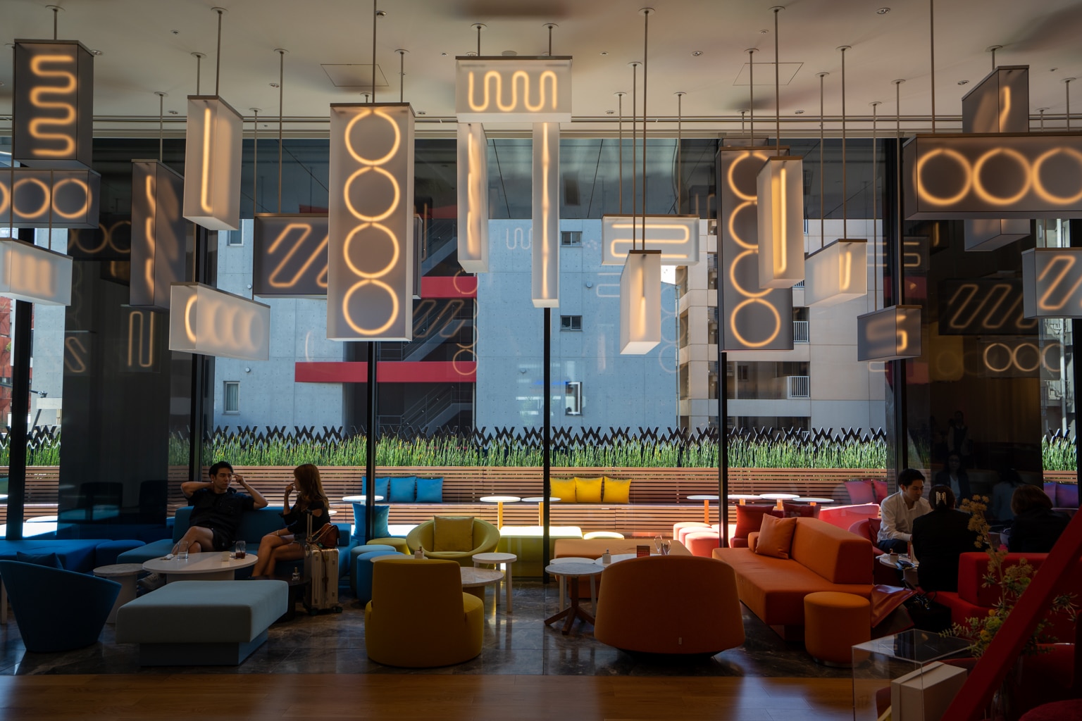 The space features colourful chairs and rectangular lamps that dangle from the ceiling at various heights, mirroring the vibrant lanterns of Dotonbori.