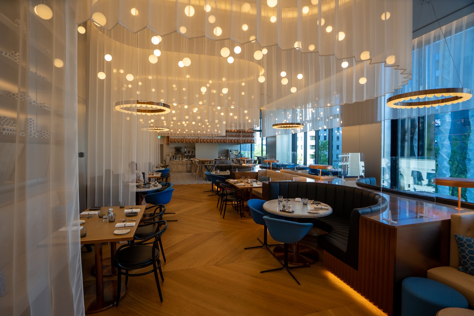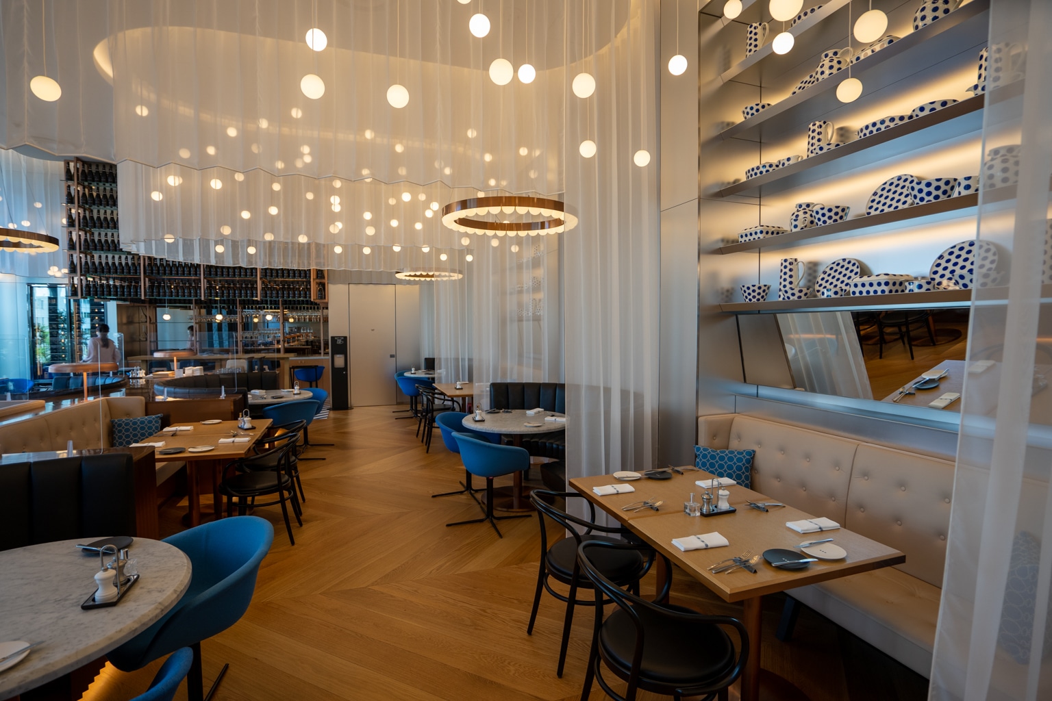 The space has a bright and airy atmosphere, with curved booths and sheer curtains falling from the ceiling. Here, blue accents, zigzag designs, and polka-dot embellishments reflect the distinctive W aesthetic.