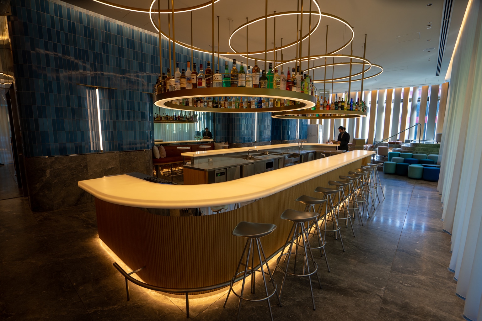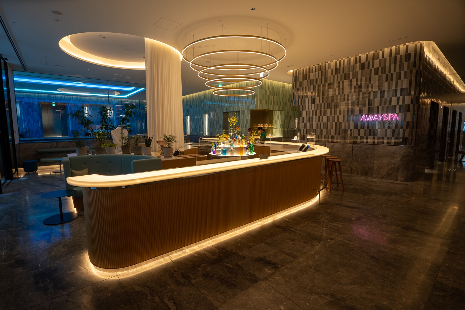 The pod-like check-in counters are tucked away in a corner, surrounded by extravagant LED lighting.