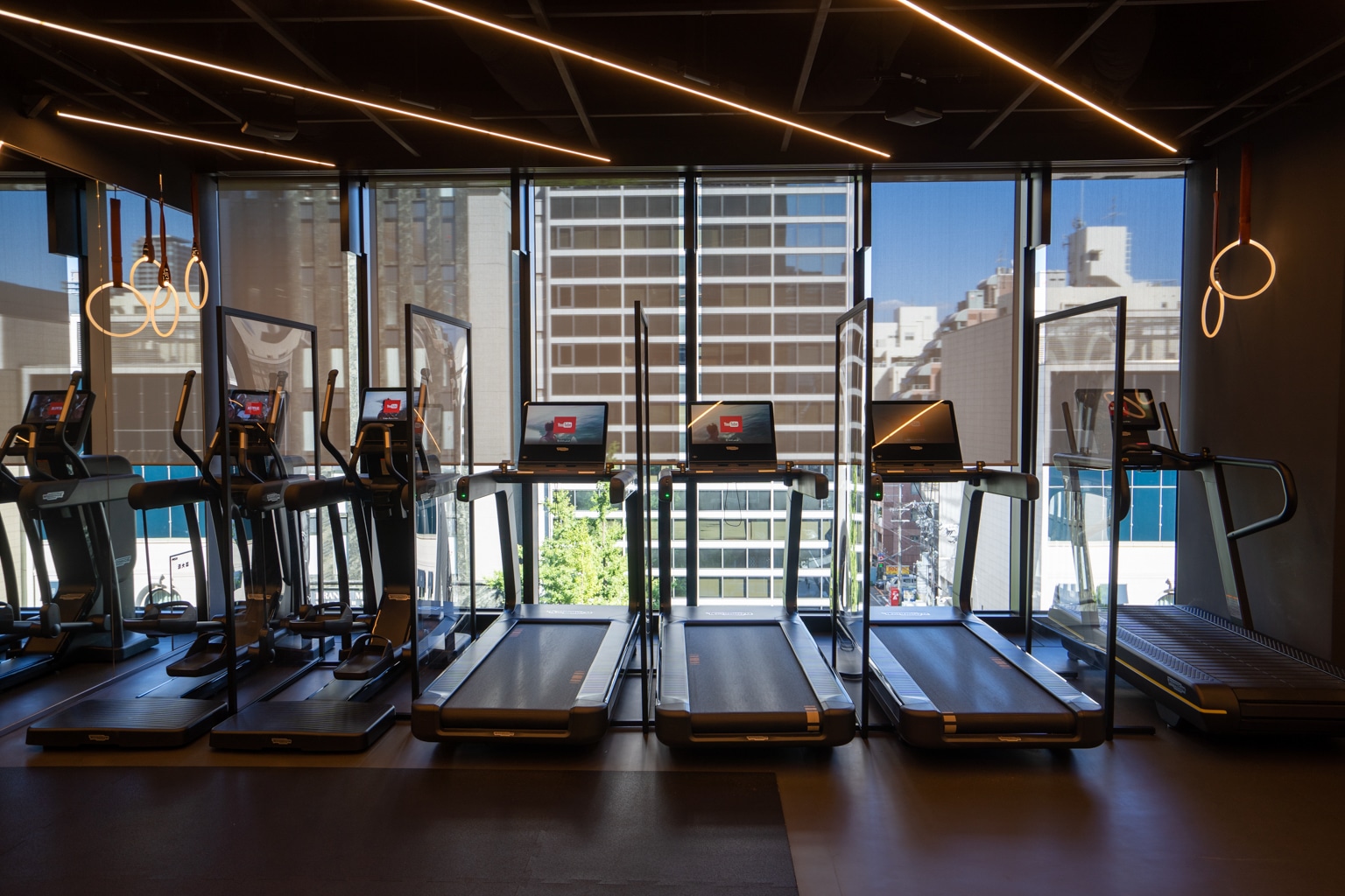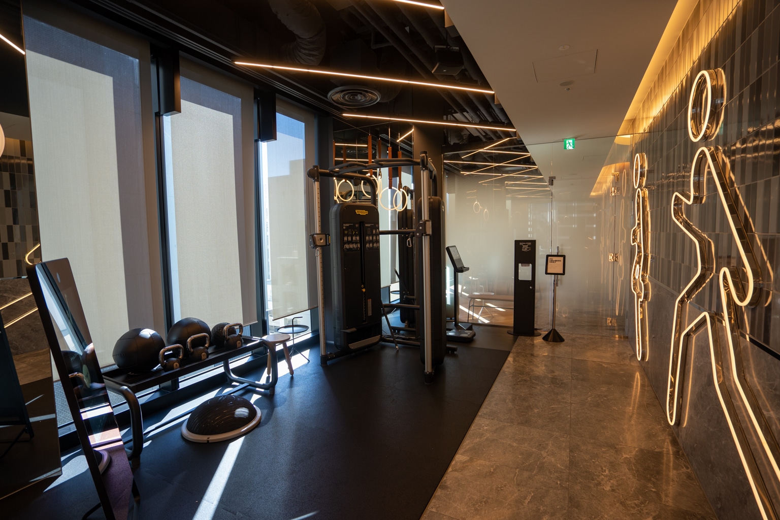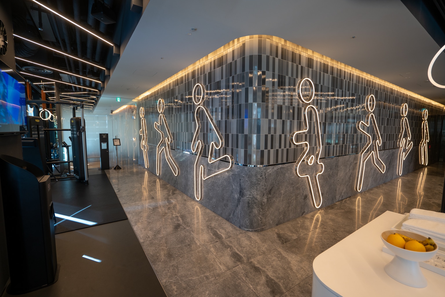 The fitness centre was highly impressive, with a cutting-edge layout and design. Floor-to-ceiling windows allowed plenty of light to flow into the space, which was accentuated by the fitness-inspired neon light strips adorning the walls.