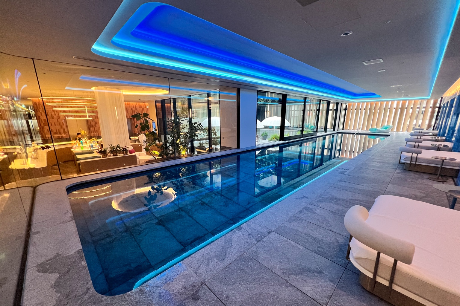 WET is the hotel’s indoor plunge pool, set under vibrant neon lights and alongside spacious day beds.