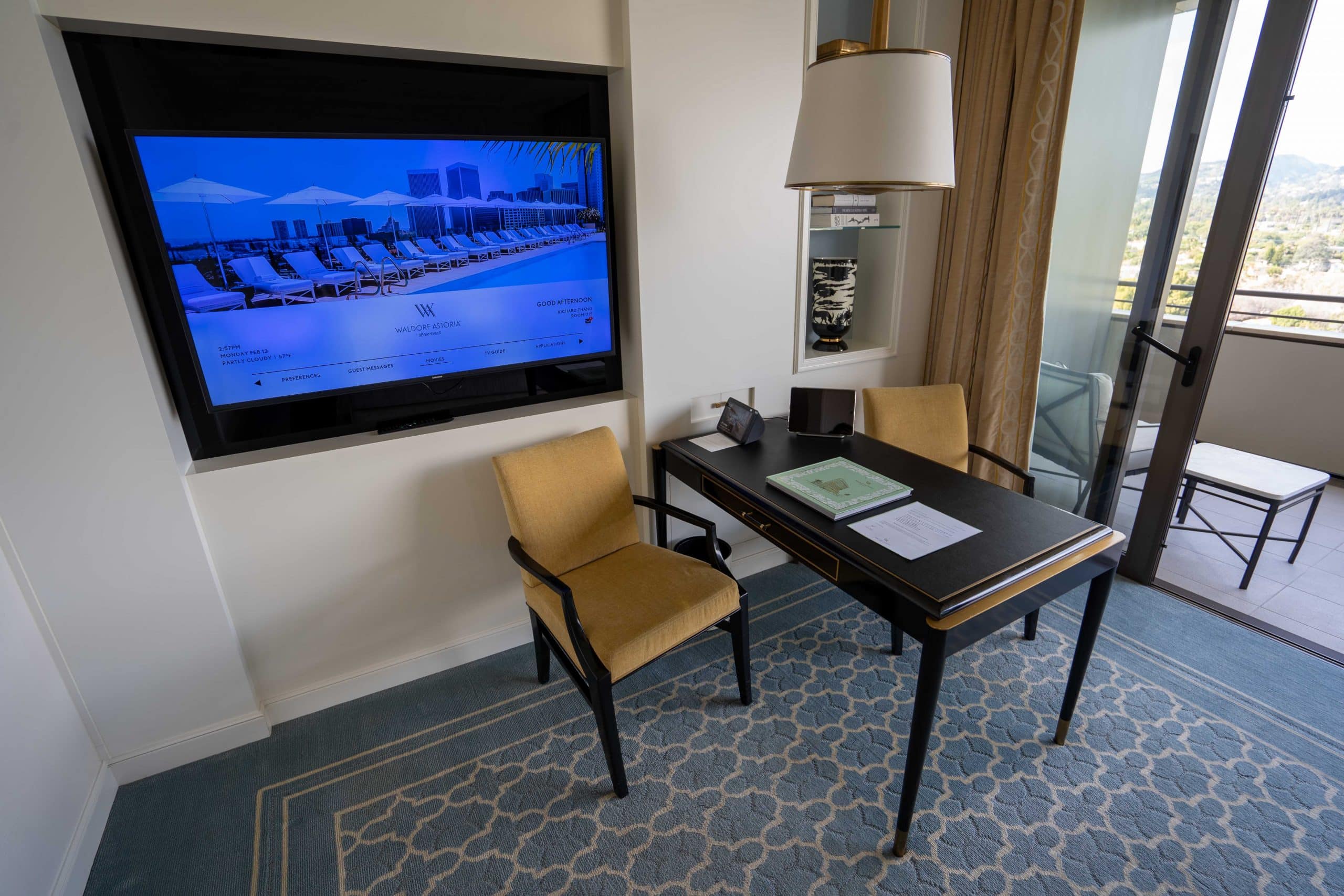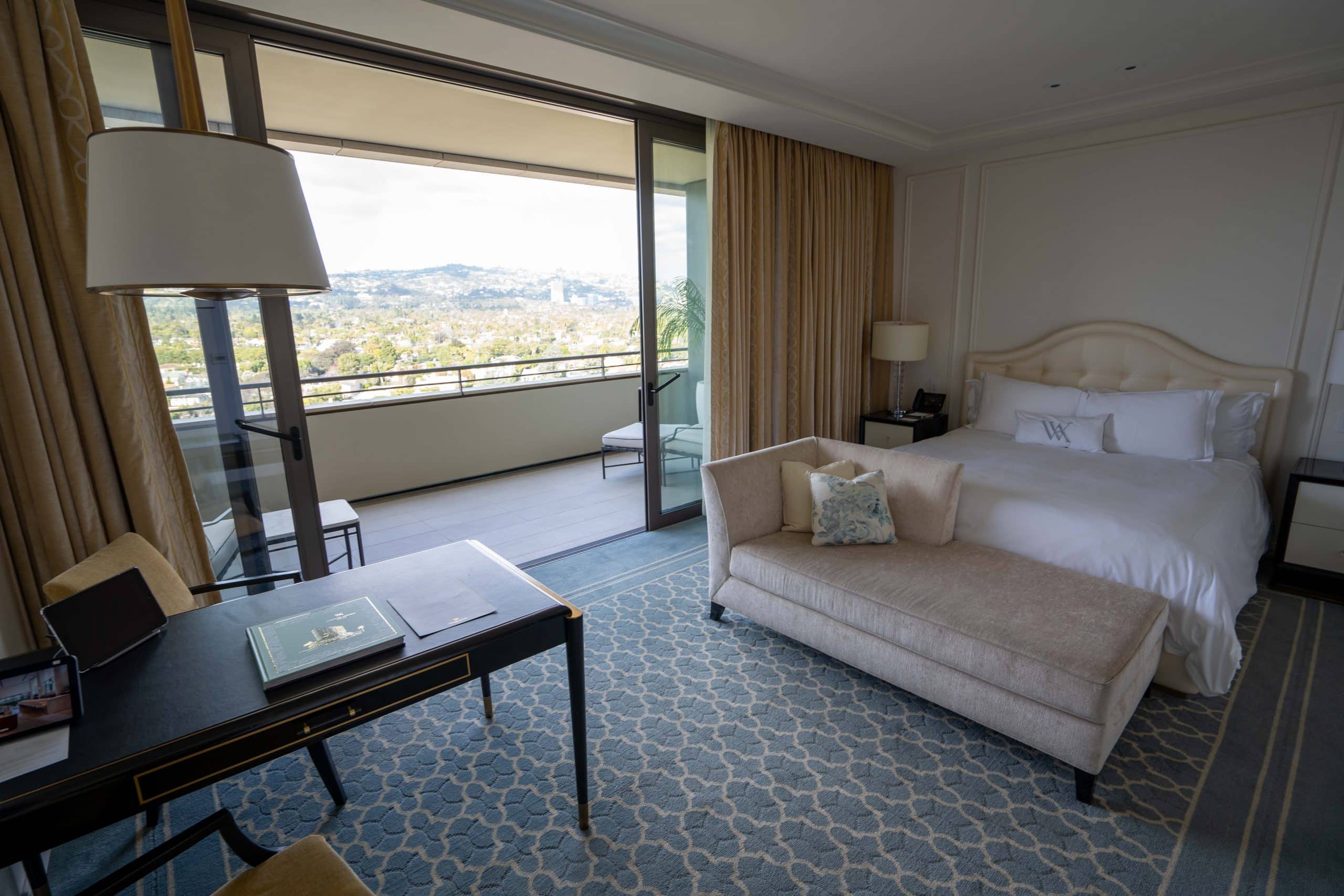 Each room at the Waldorf Astoria Beverly Hills boasts a balcony and large floor-to-ceiling windows, providing magnificent views of either the Hollywood Hills or Downtown LA.
