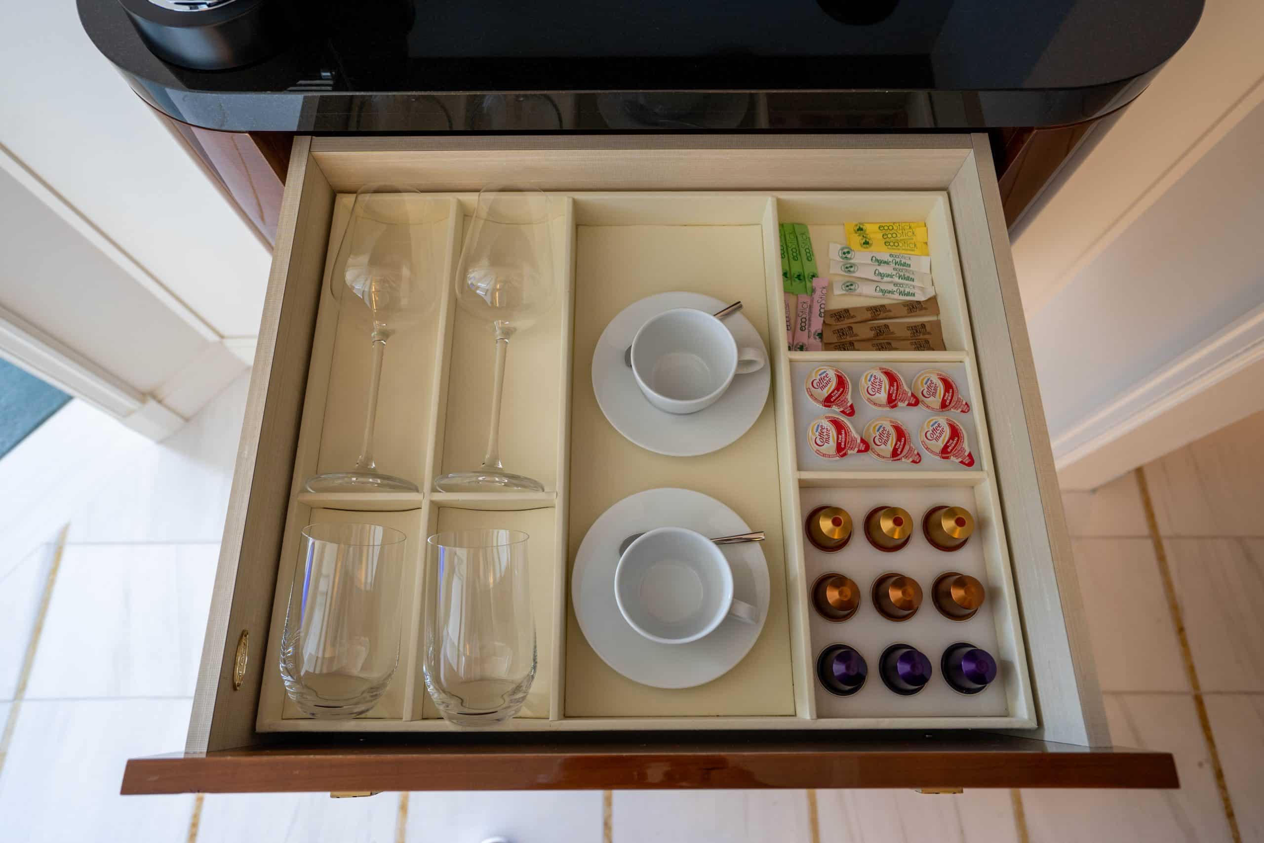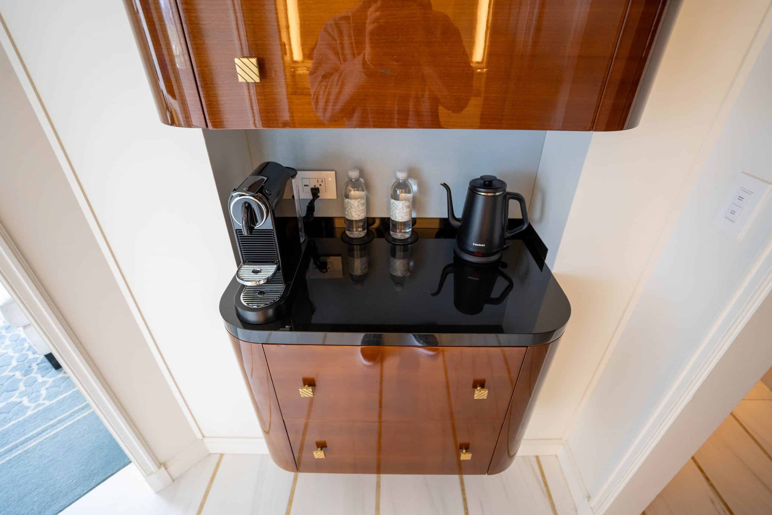 Near the entrance, a well-stocked minibar, a Nespresso machine, and bottled water awaited us at the counter. As a welcome amenity, three delicate sweets were left in the room, adding a thoughtful touch to our arrival.