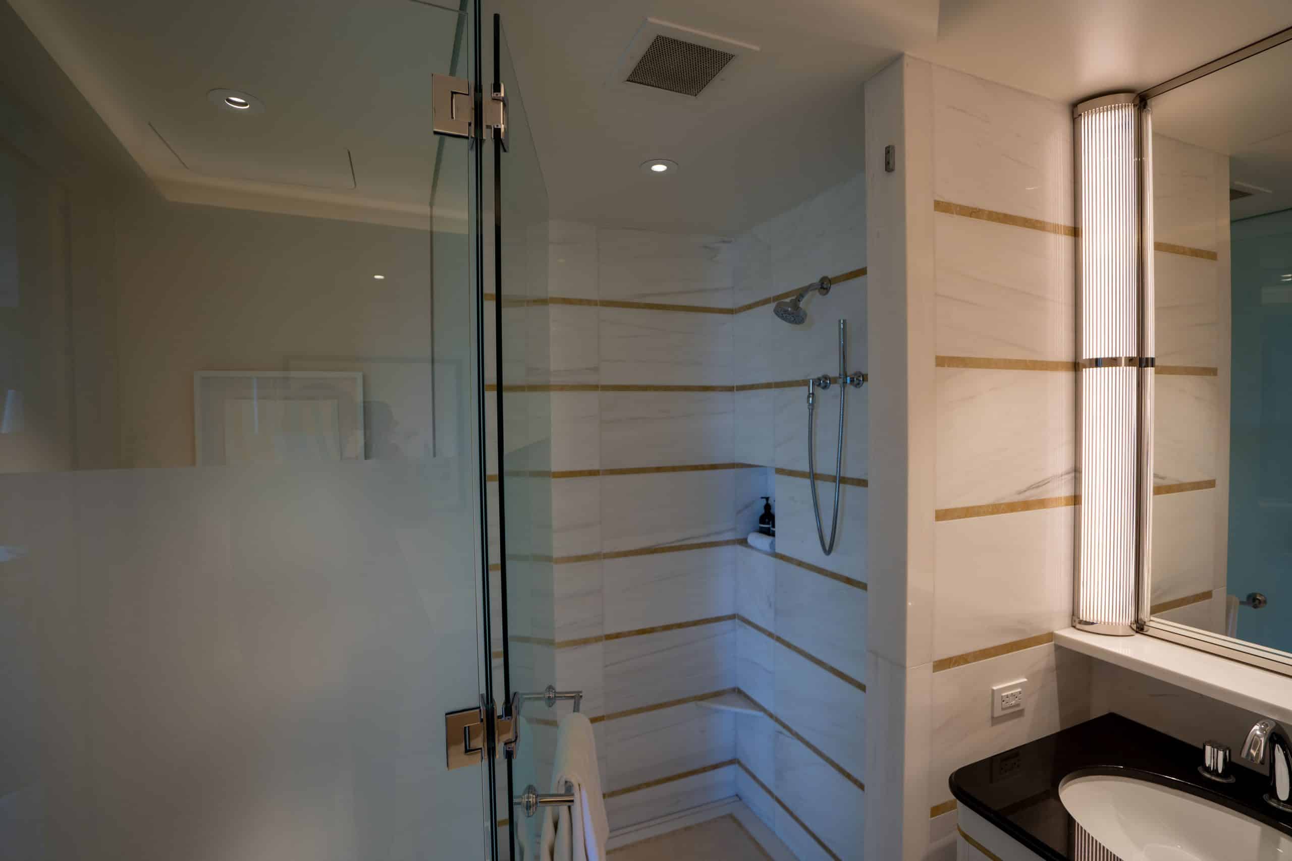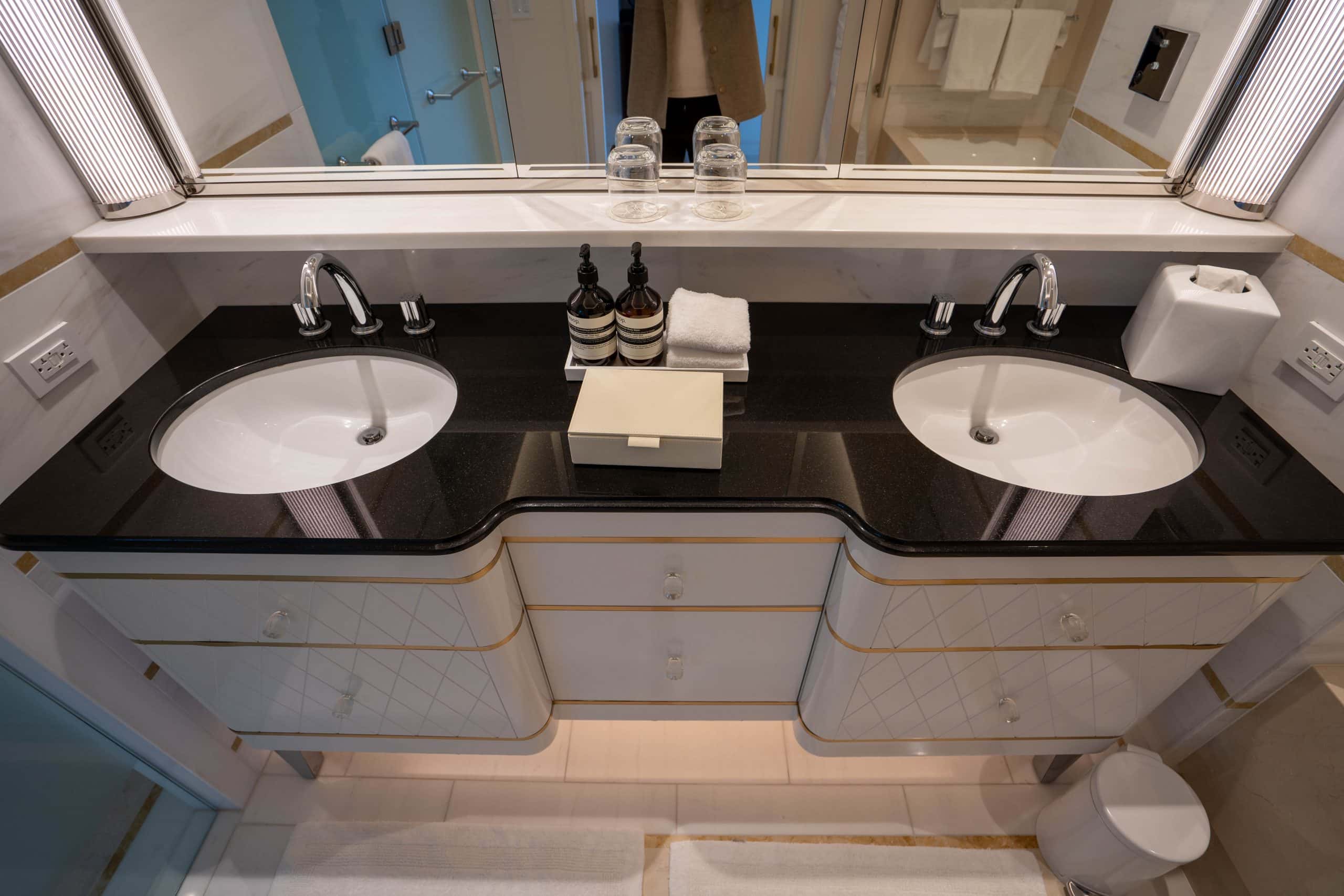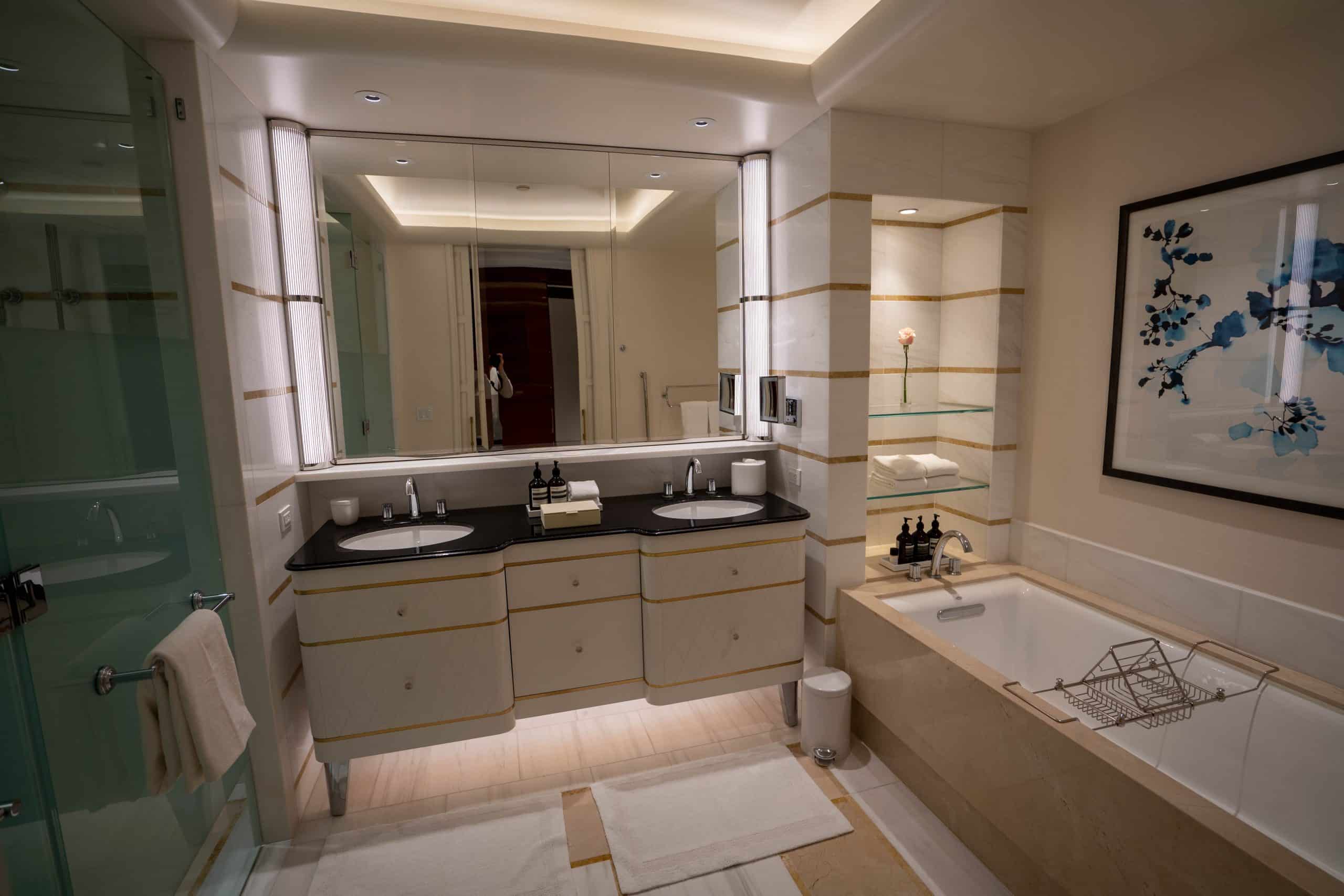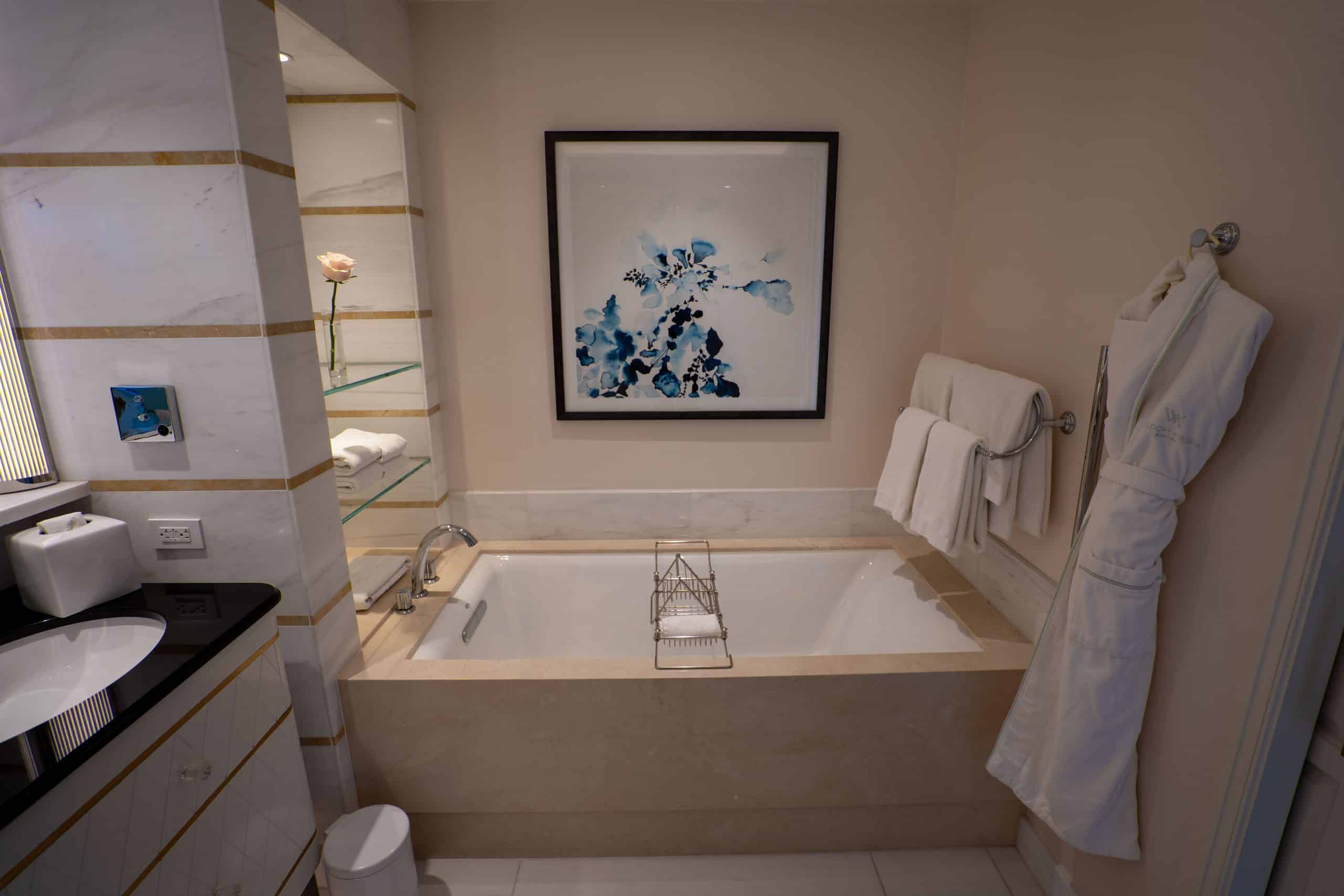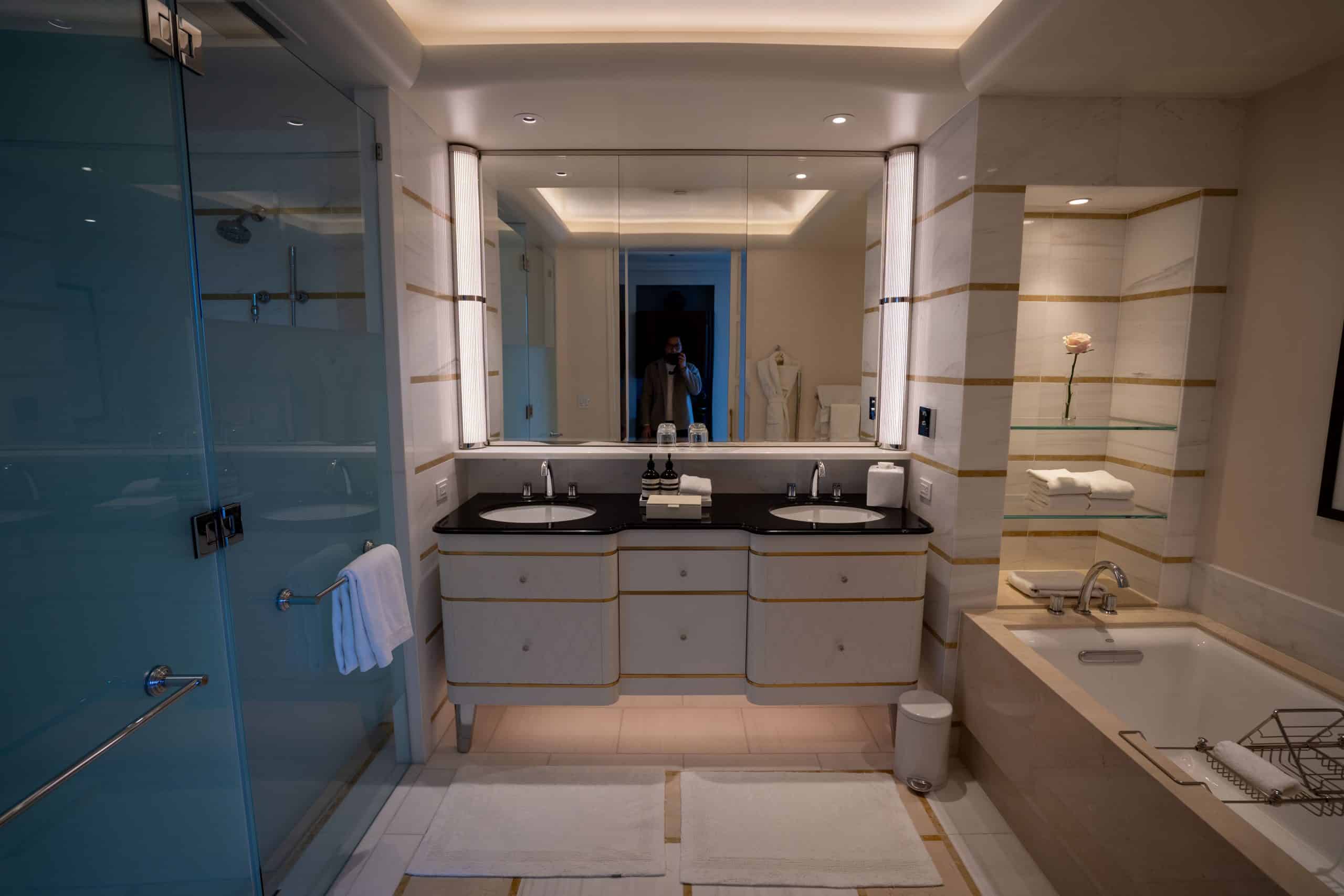 Consistency in design is a hallmark of the Waldorf Astoria brand, and this extends to the bathrooms found in all room types, including the Deluxe Corner Junior Suite.