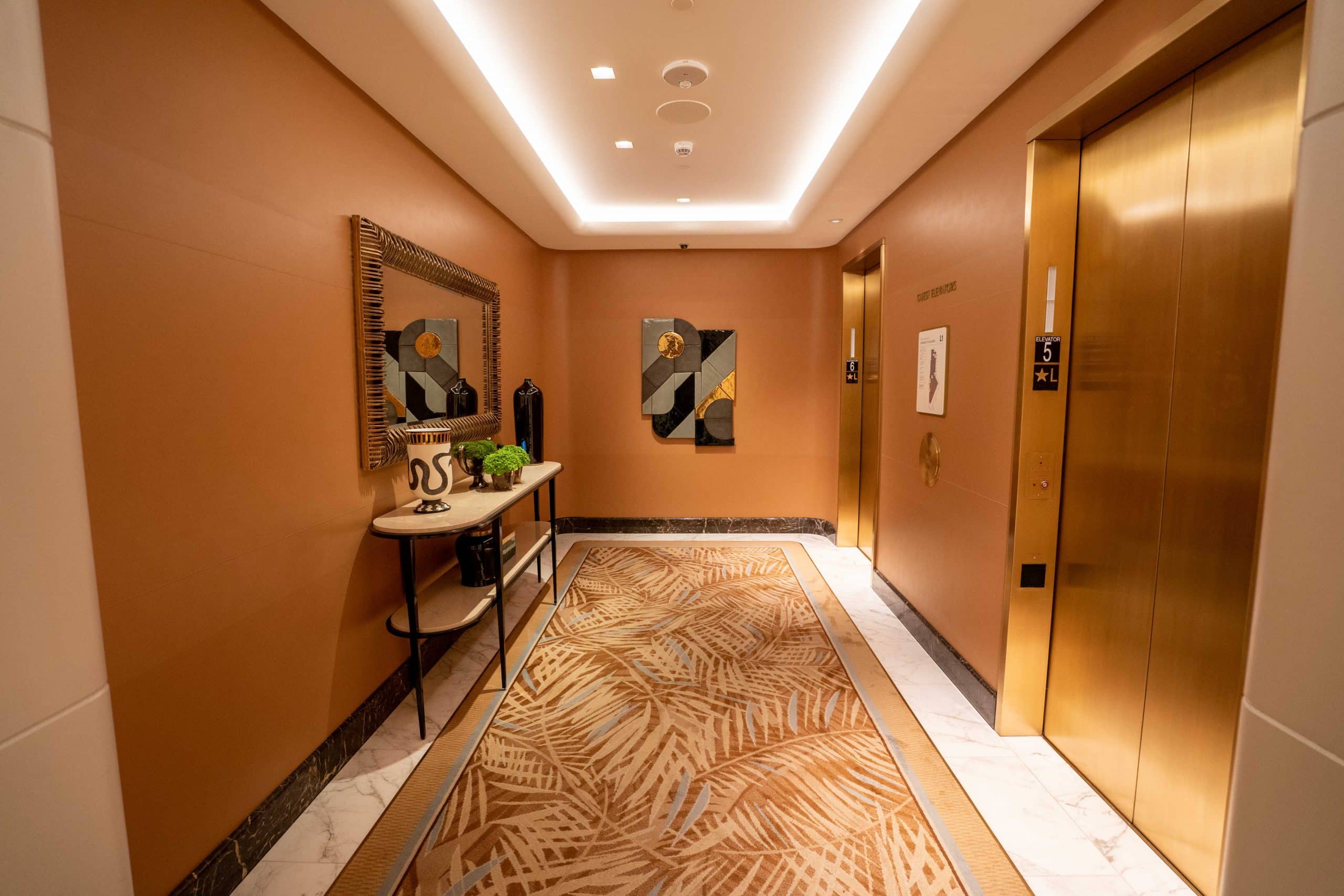 We proceeded towards a set of elegant elevators adorned in warm taupe tones, which were ready to whisk us up to our luxurious Deluxe King Room.
