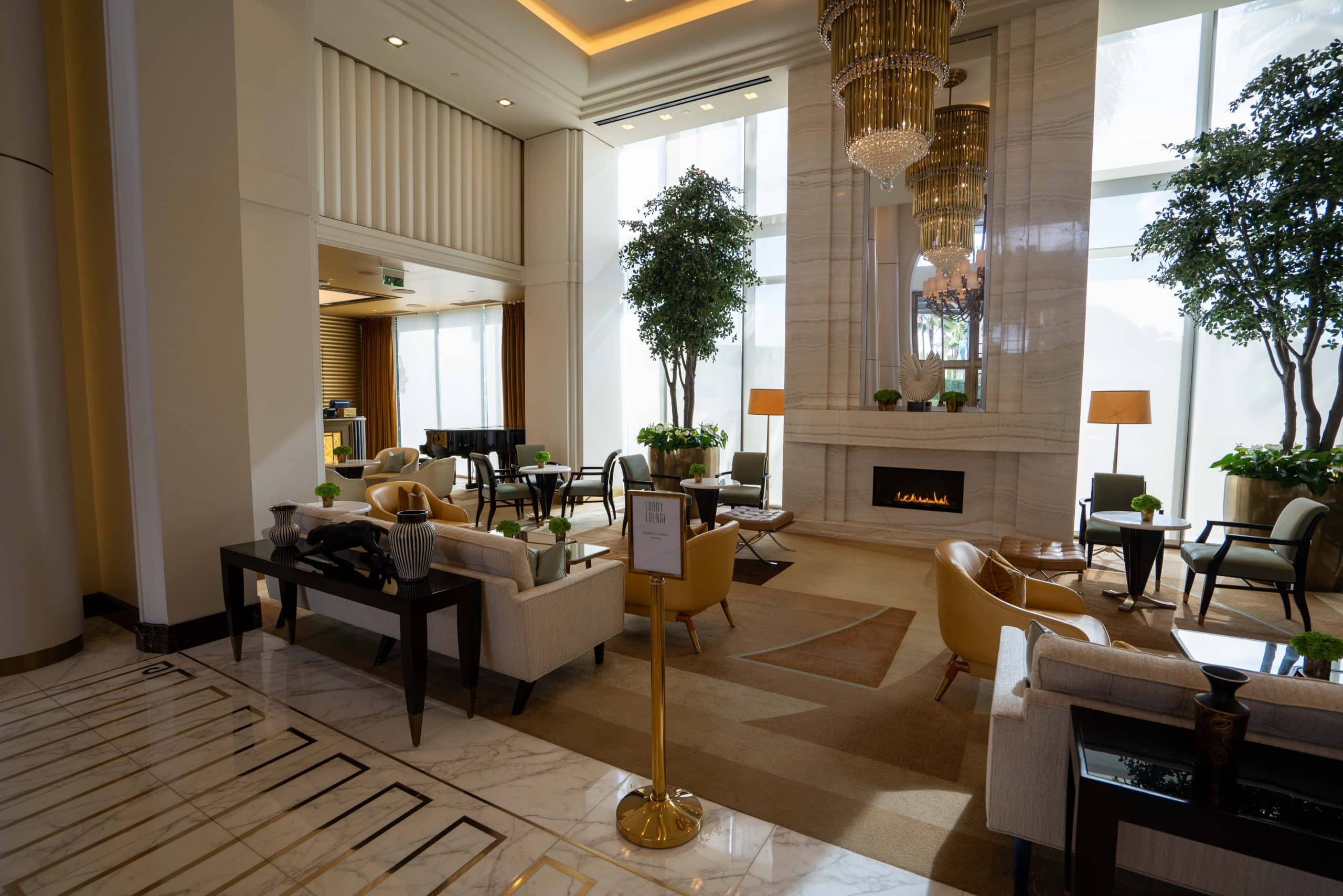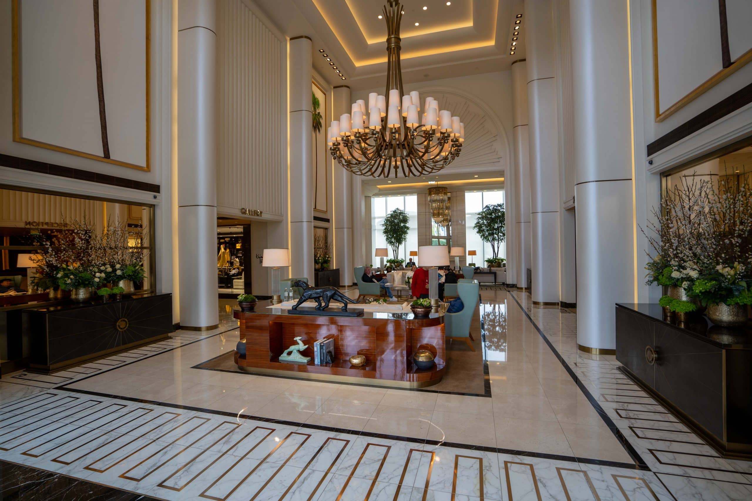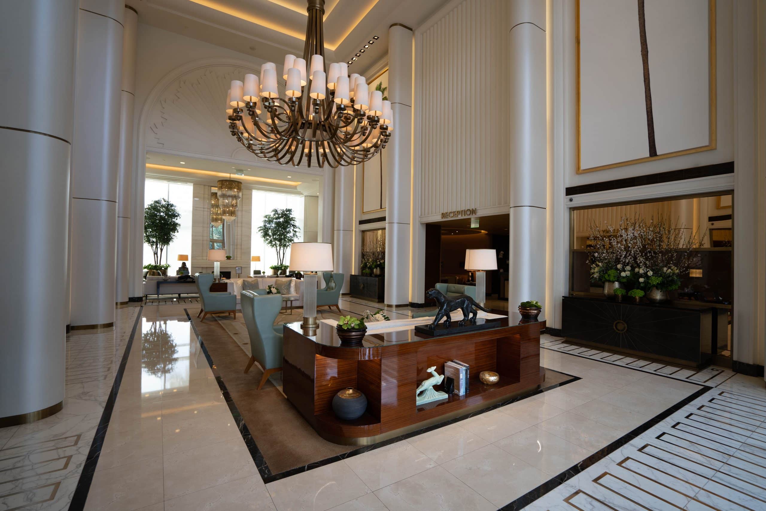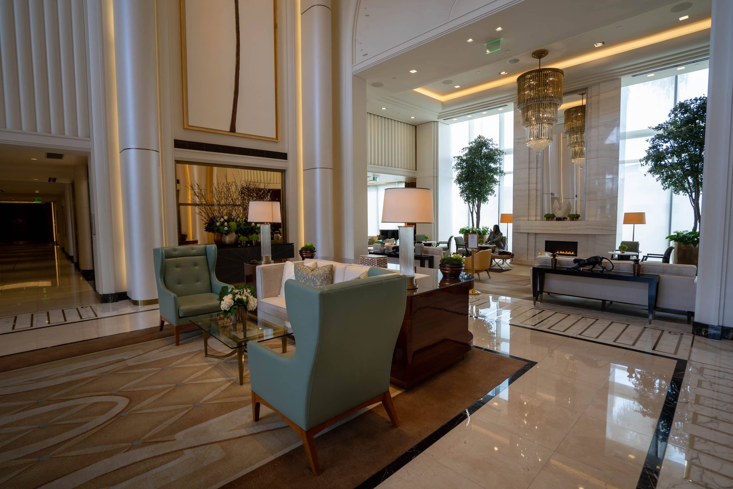 As I stepped inside, I was immediately captivated by a beautiful timeless lobby with soaring triple-height ceilings, and a magnificent custom bronze Strass chandelier that immediately captured our attention.