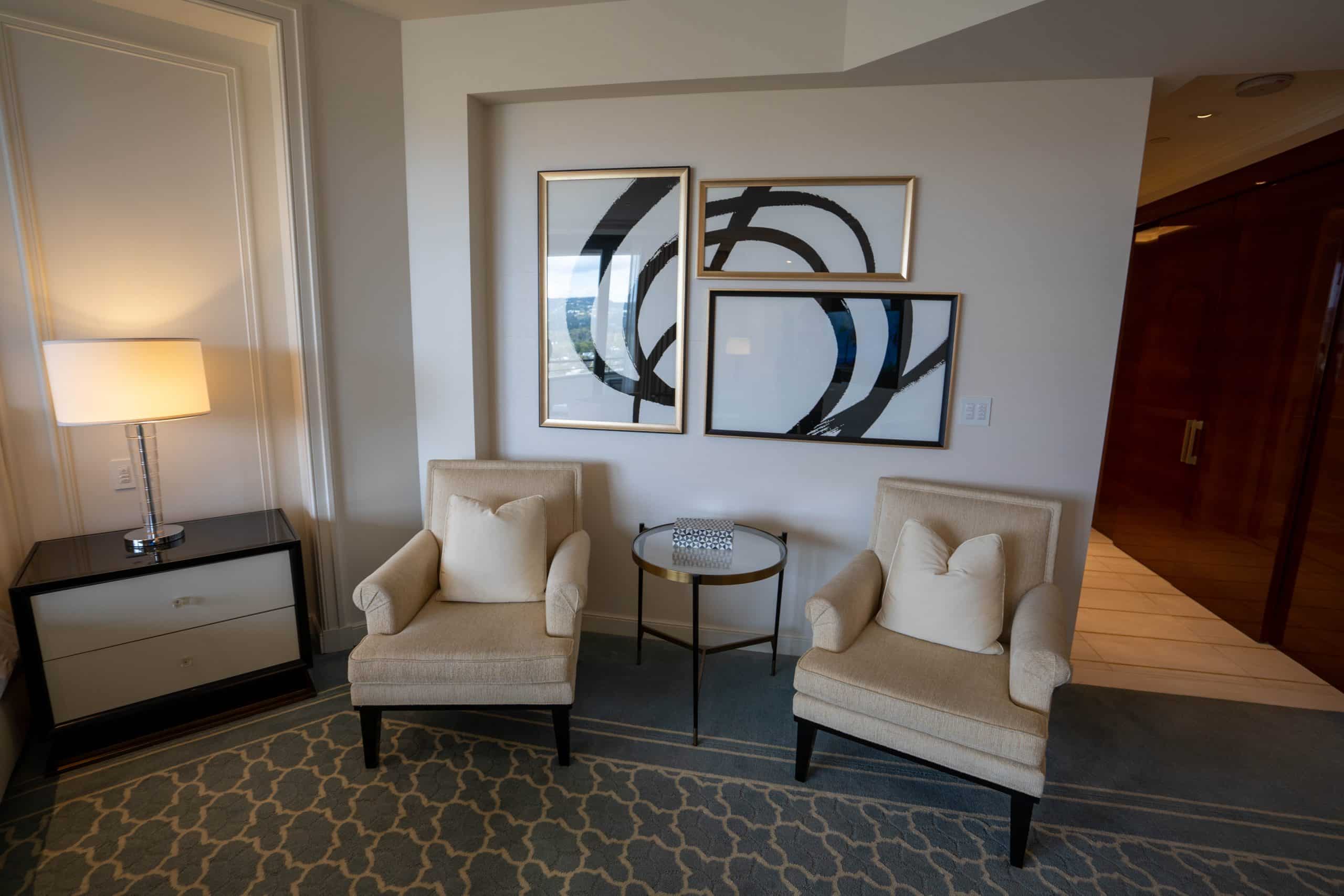 A separate living room area adds to the spaciousness of the suite, and is furnished with a loveseat, armchair, and desk, providing a designated space for work or leisure.