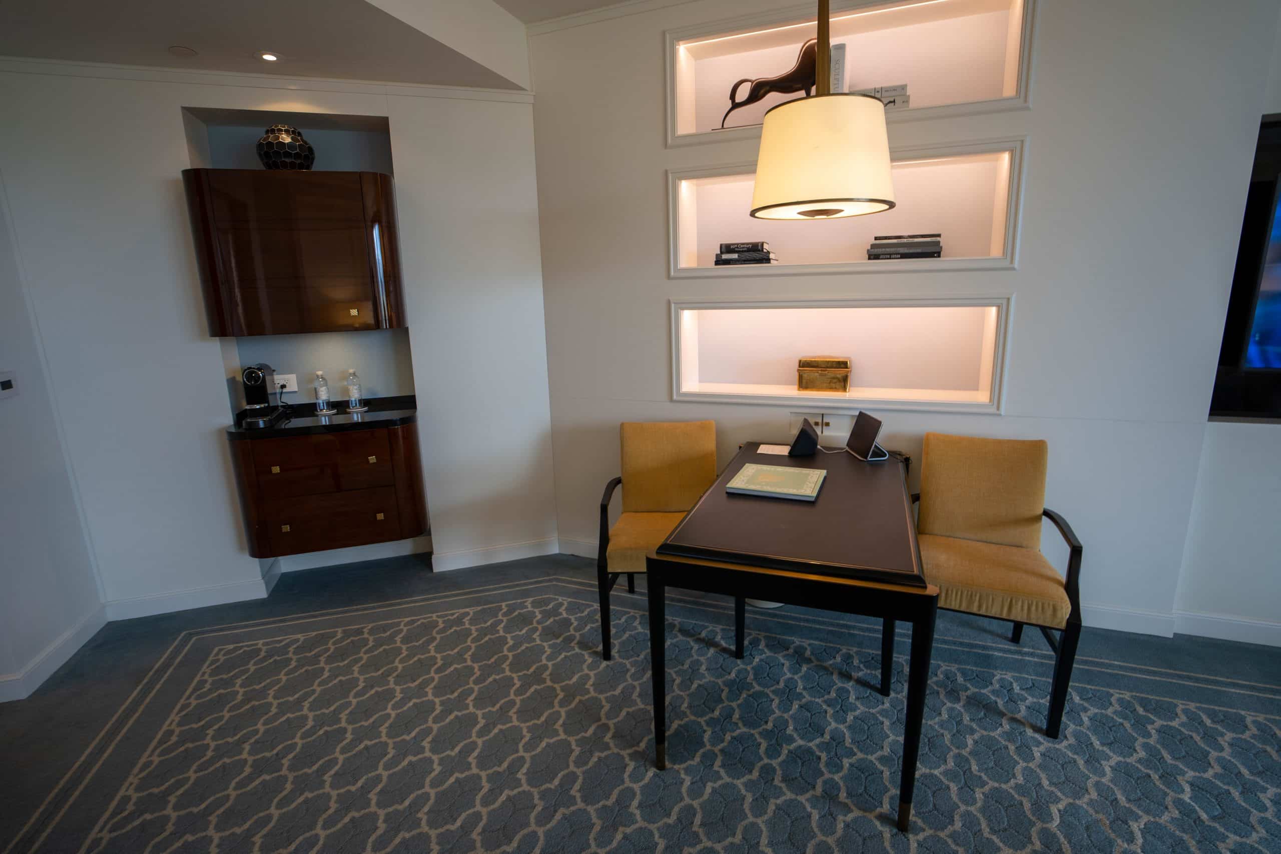 On the opposite wall, a desk and two armchairs provide a versatile space for catching up on work or enjoying a meal. The desk was equipped with a Crestron smart home system, allowing for convenient control over the drapes, entertainment, lighting, and room service.