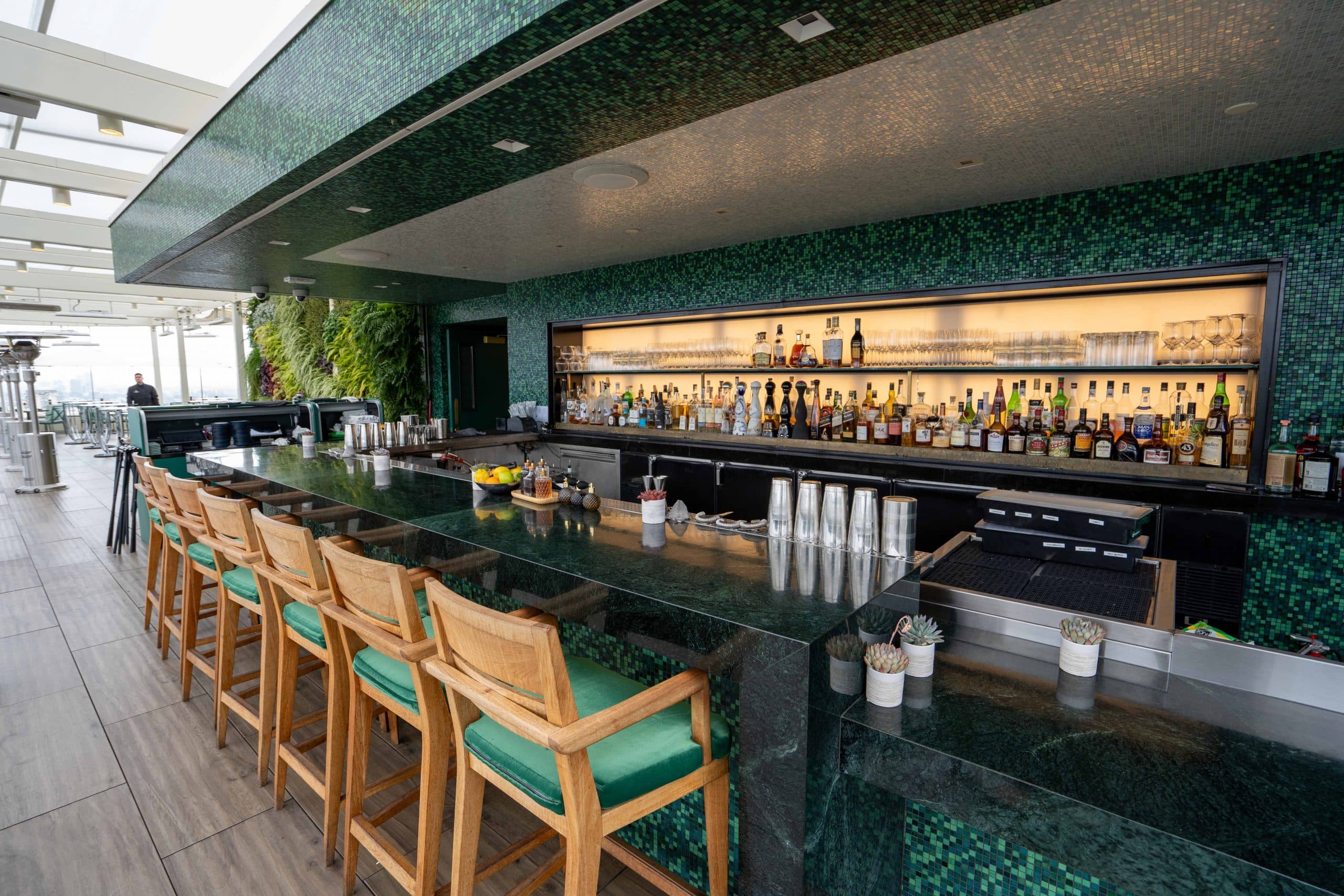 The bar has an impeccably styled garden setting with a cozy fireplace, mixed seating, and a stunning turquoise bar.