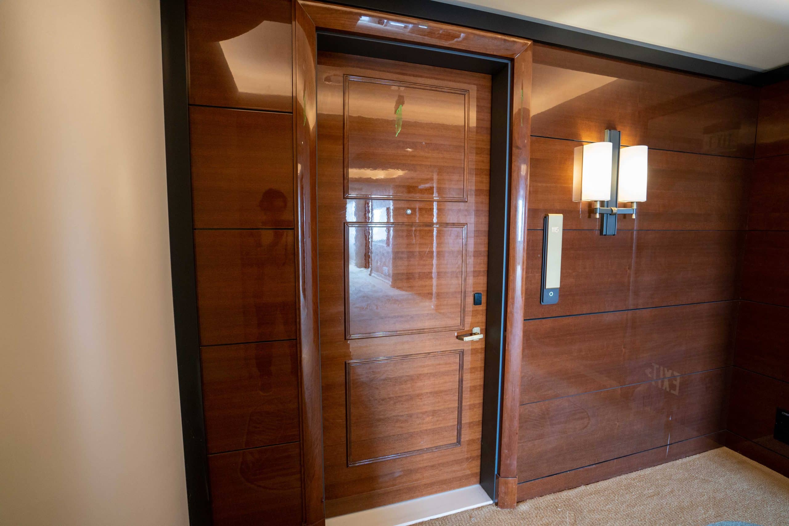 As we walked along the long guest-room hallways, I noticed the opulent gold carpeting adorned with intricate palm frond designs. Arriving at our room, the cherry wood doors added a sense of grandeur to the setting.