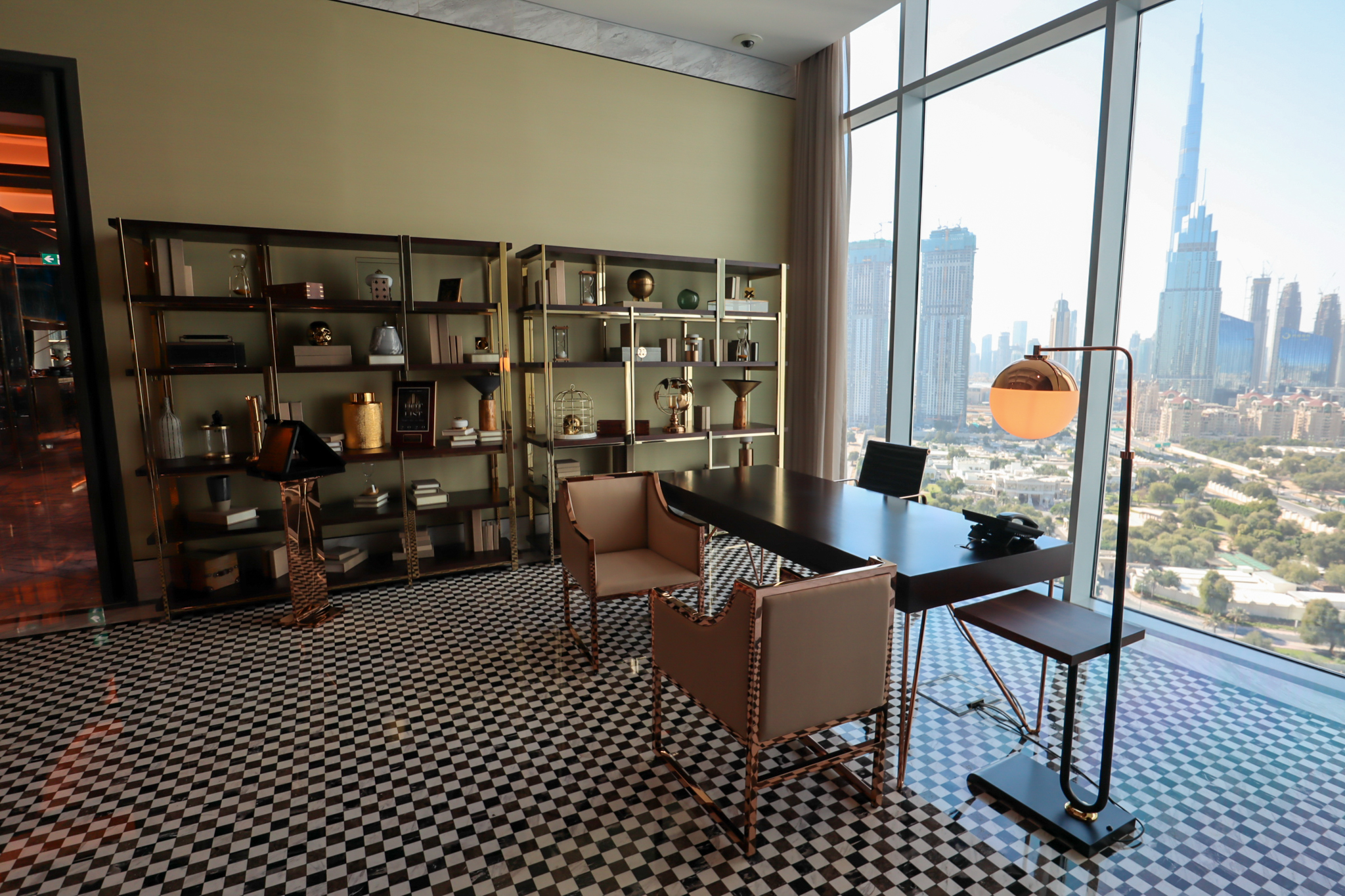Up to the 18th floor, and as soon as you turn left from the elevator bank, you’re greeted by a sight that will become commonplace throughout your stay: floor-to-ceiling windows with the Burj Khalifa towering outside.