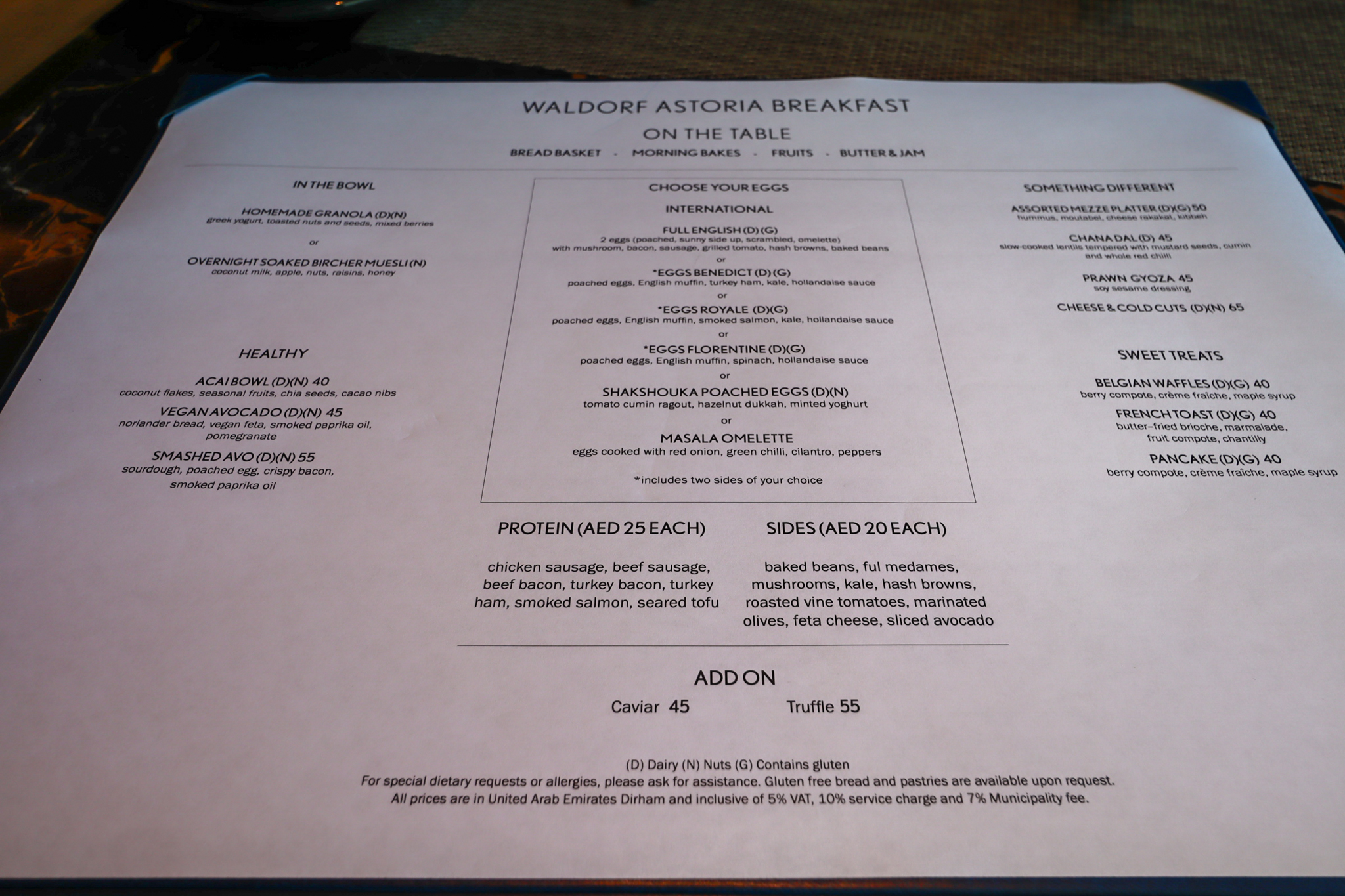 As of November 2020, breakfast at the Waldorf Astoria DIFC is served à la carte, and Diamond members have a rather peculiar allowance: anything under “On the Table”, “In the Bowl”, and “Choose Your Eggs” is complimentary, but the rest of the breakfast dishes must be paid for separately.