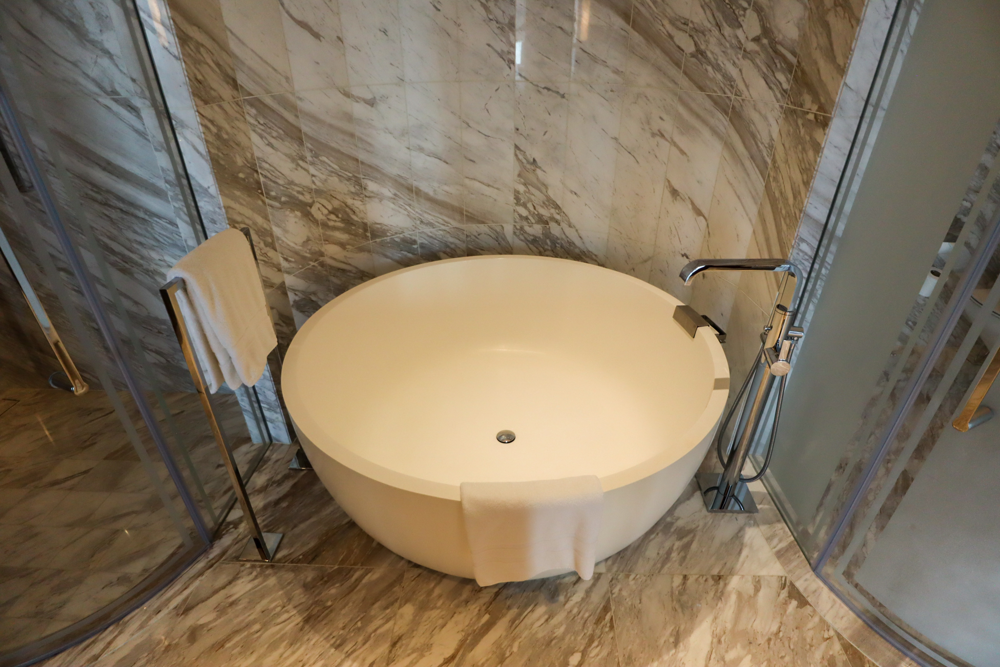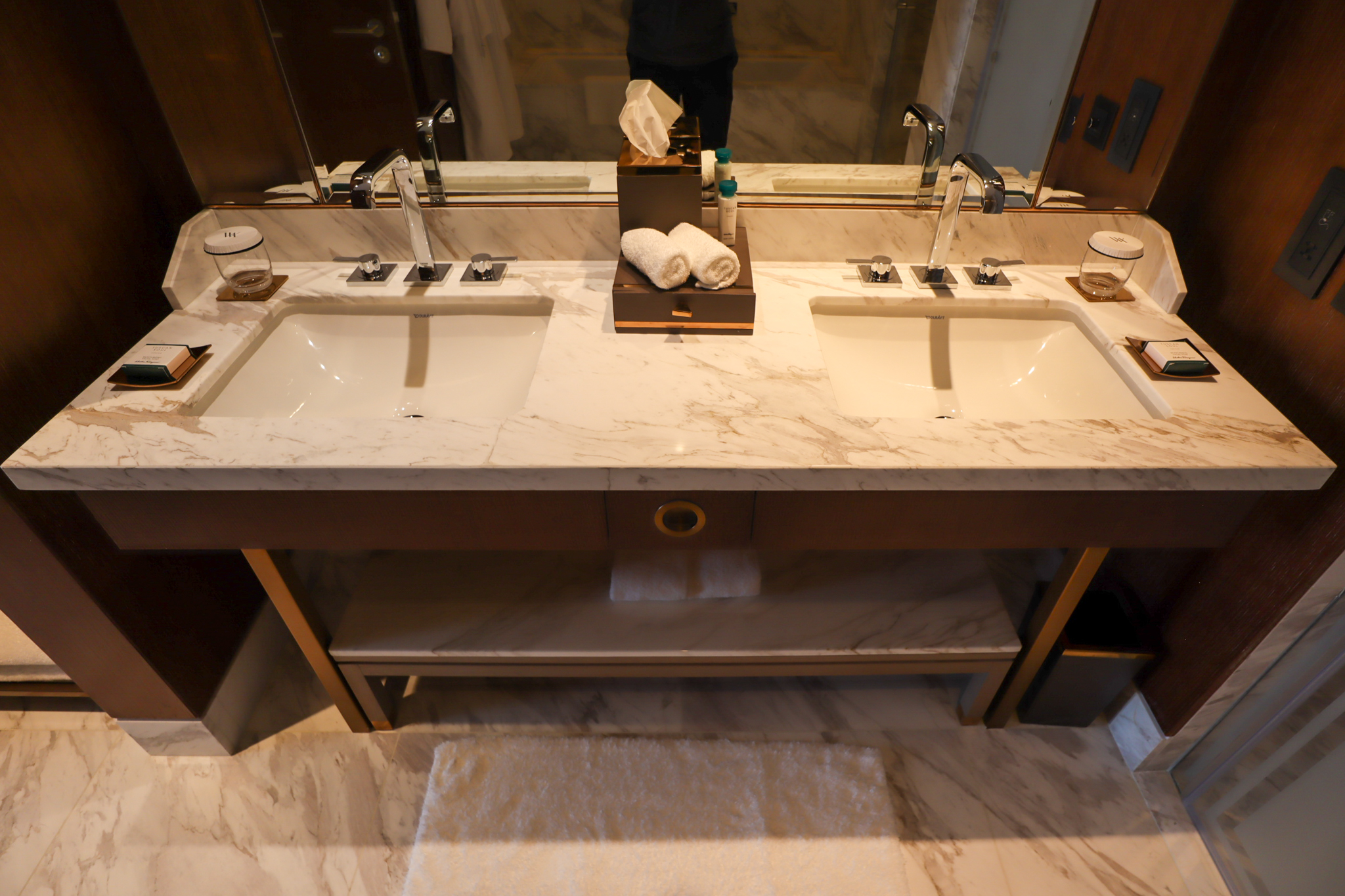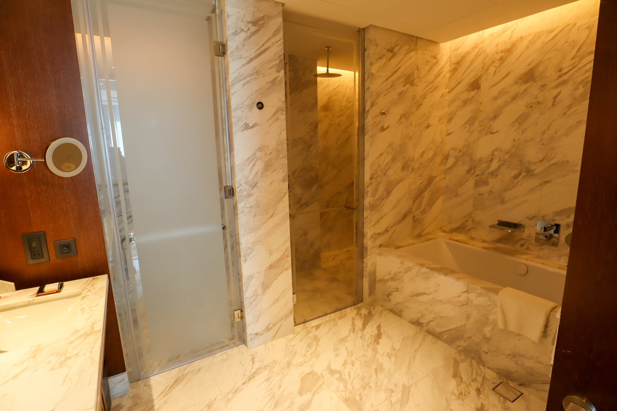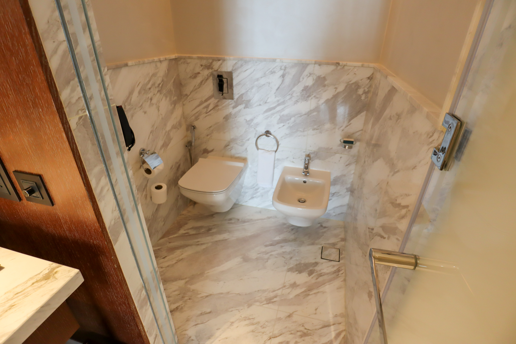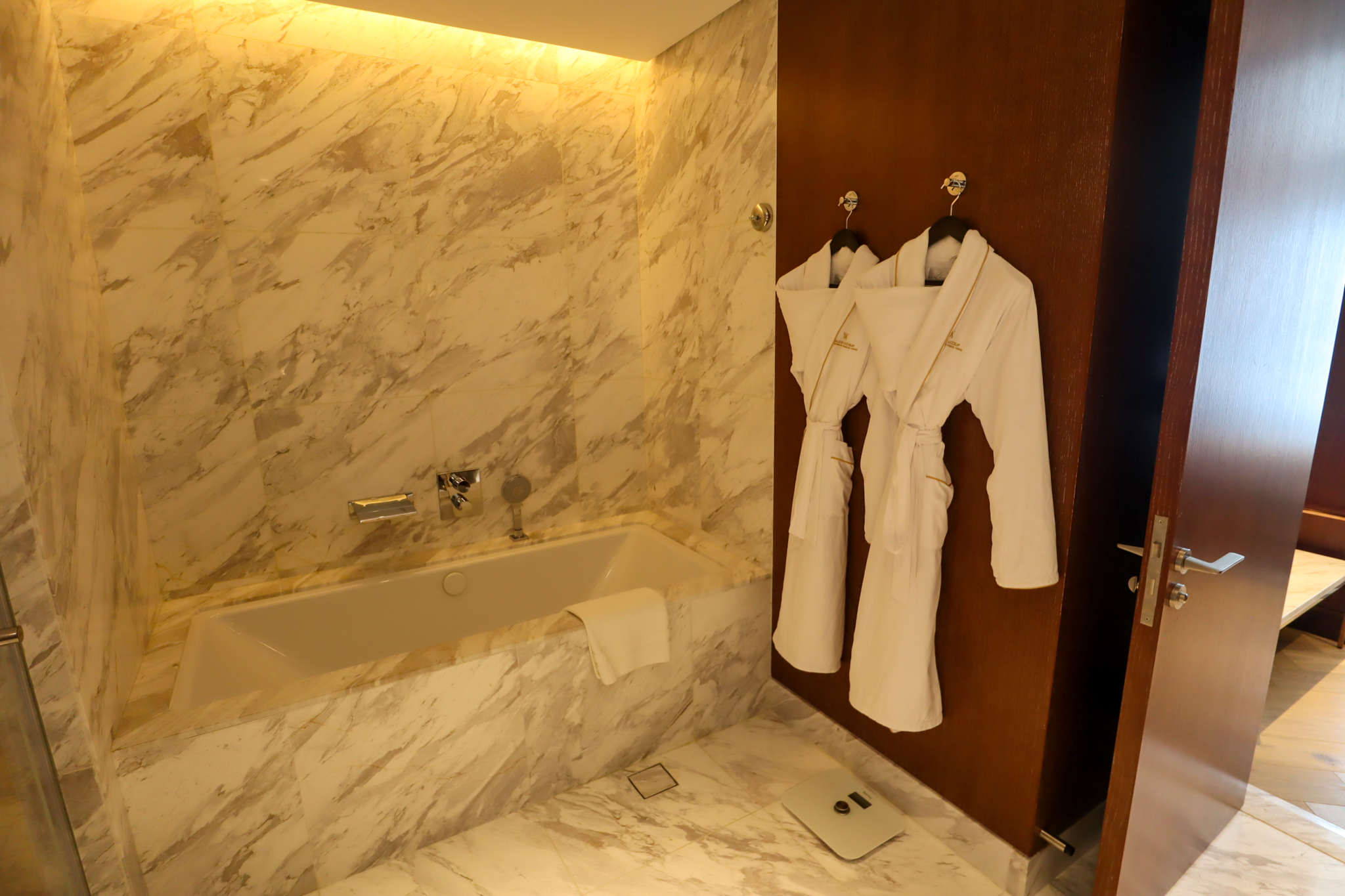 A luxurious marble bathroom is a hallmark of any high-end hotel. The Waldorf Astoria DIFC clearly recognizes this and does not hold back in this regard, incorporating gorgeous slabs of white marble into each of the sinks, shower, bathtub, and toilet chamber.