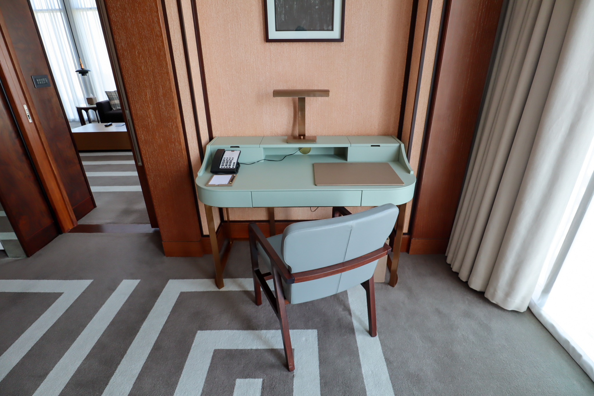 Through a set of double sliding doors, we arrive at the bedroom, which is similarly luxurious in terms of the square footage. Instead of a large stately wooden desk, the King Corner Suite offers a more chic mint-green style, which I still nevertheless enjoyed working from.