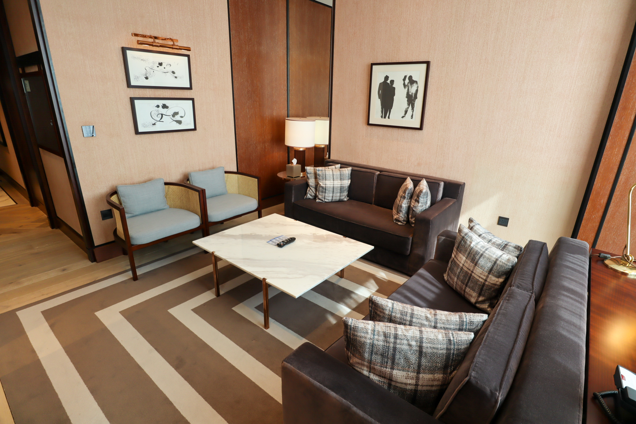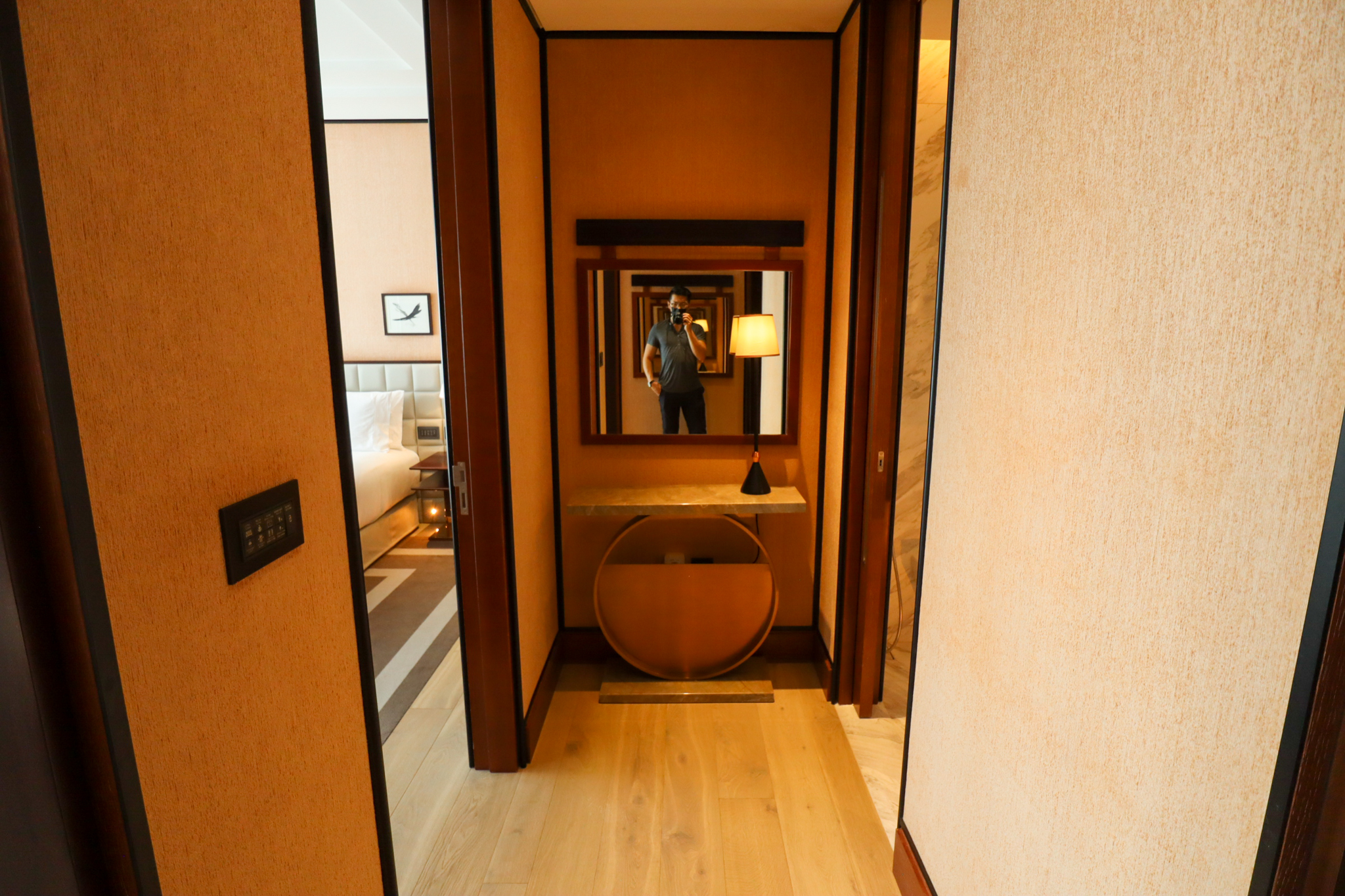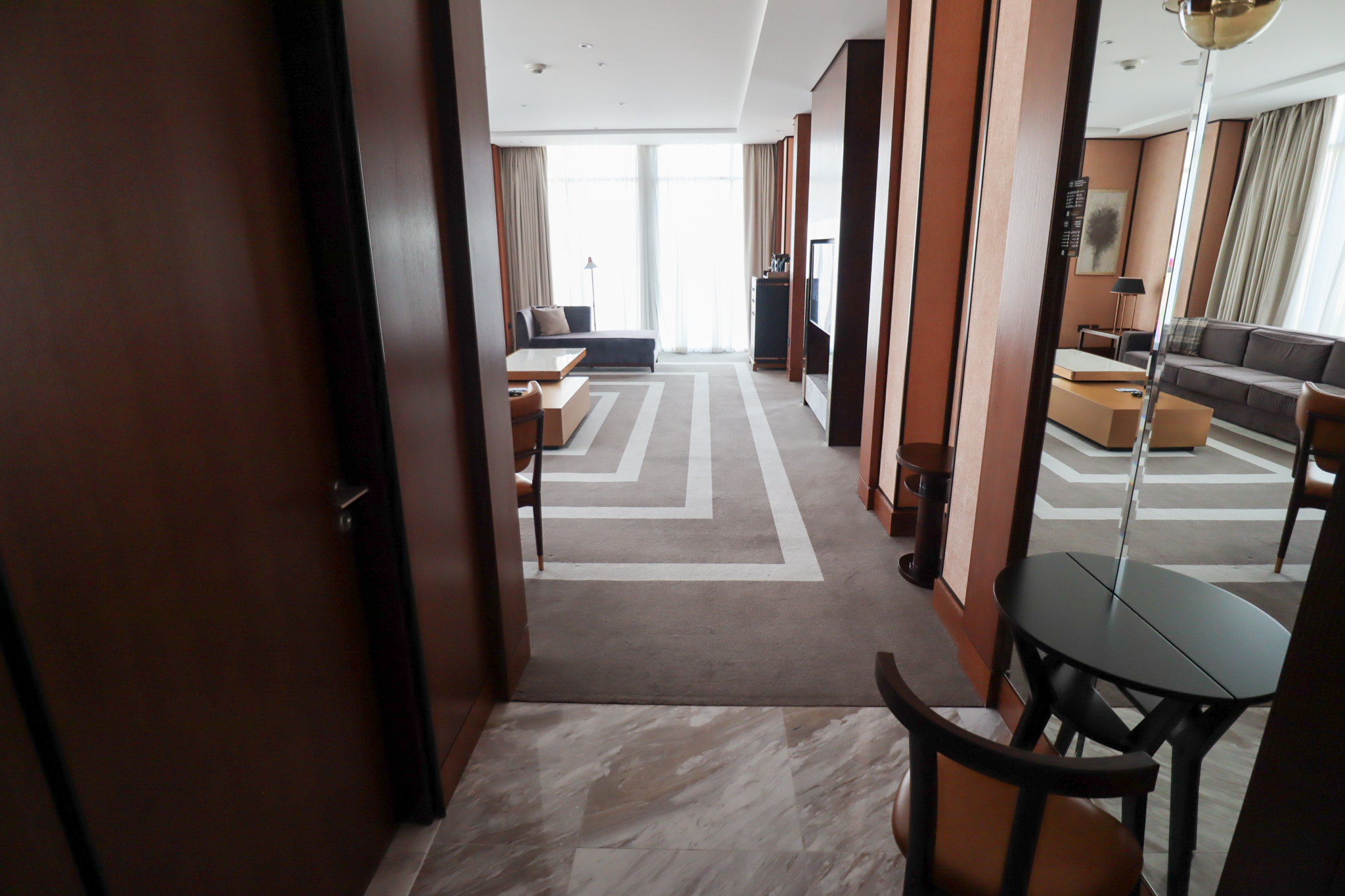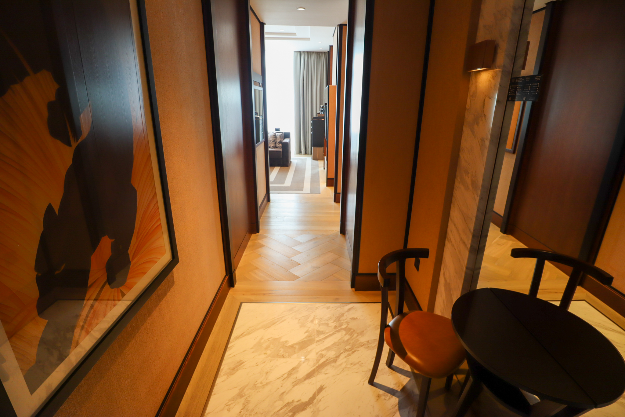 Entering the King Premier Suite, my first impression was that it’s much more reminiscent of a luxury apartment than a traditional hotel suite. The foyer is a very cozy space, offering a full-length mirror with a half-table and a walkway to the living room straight ahead.