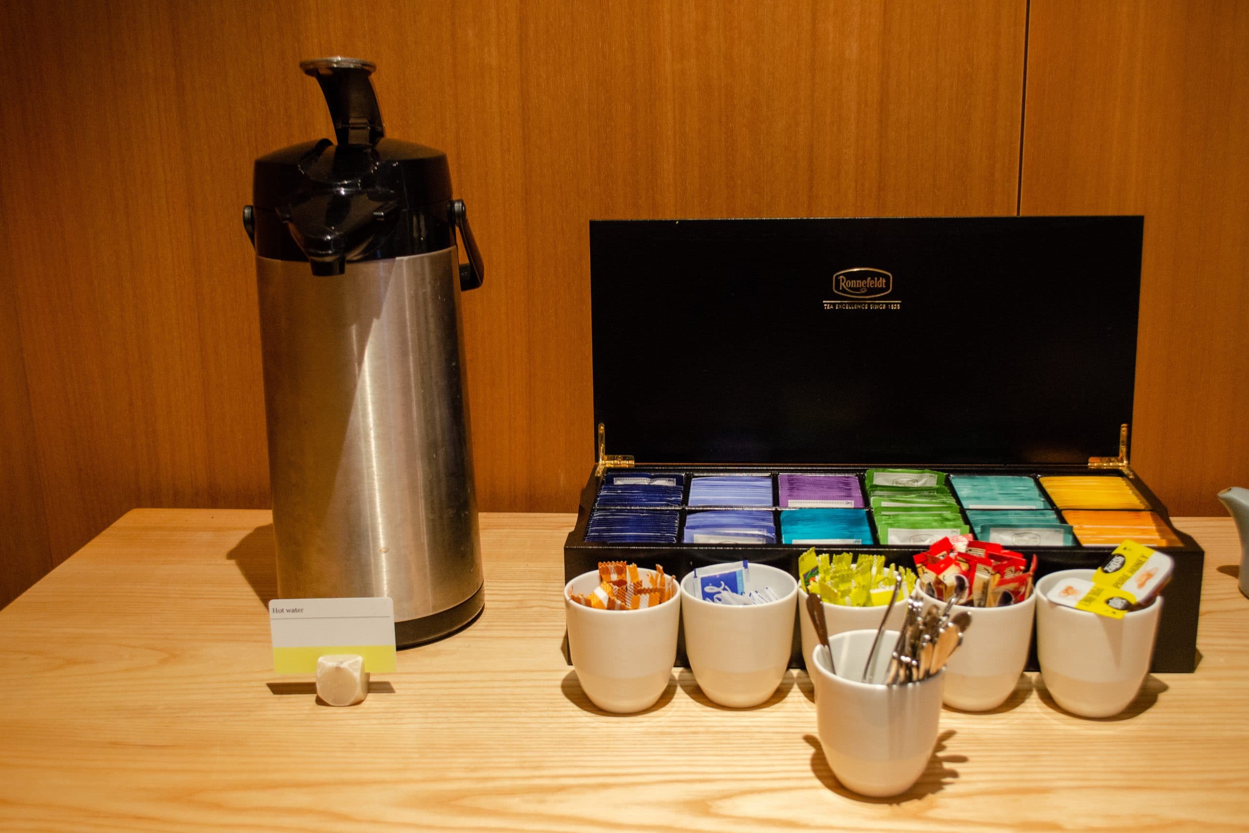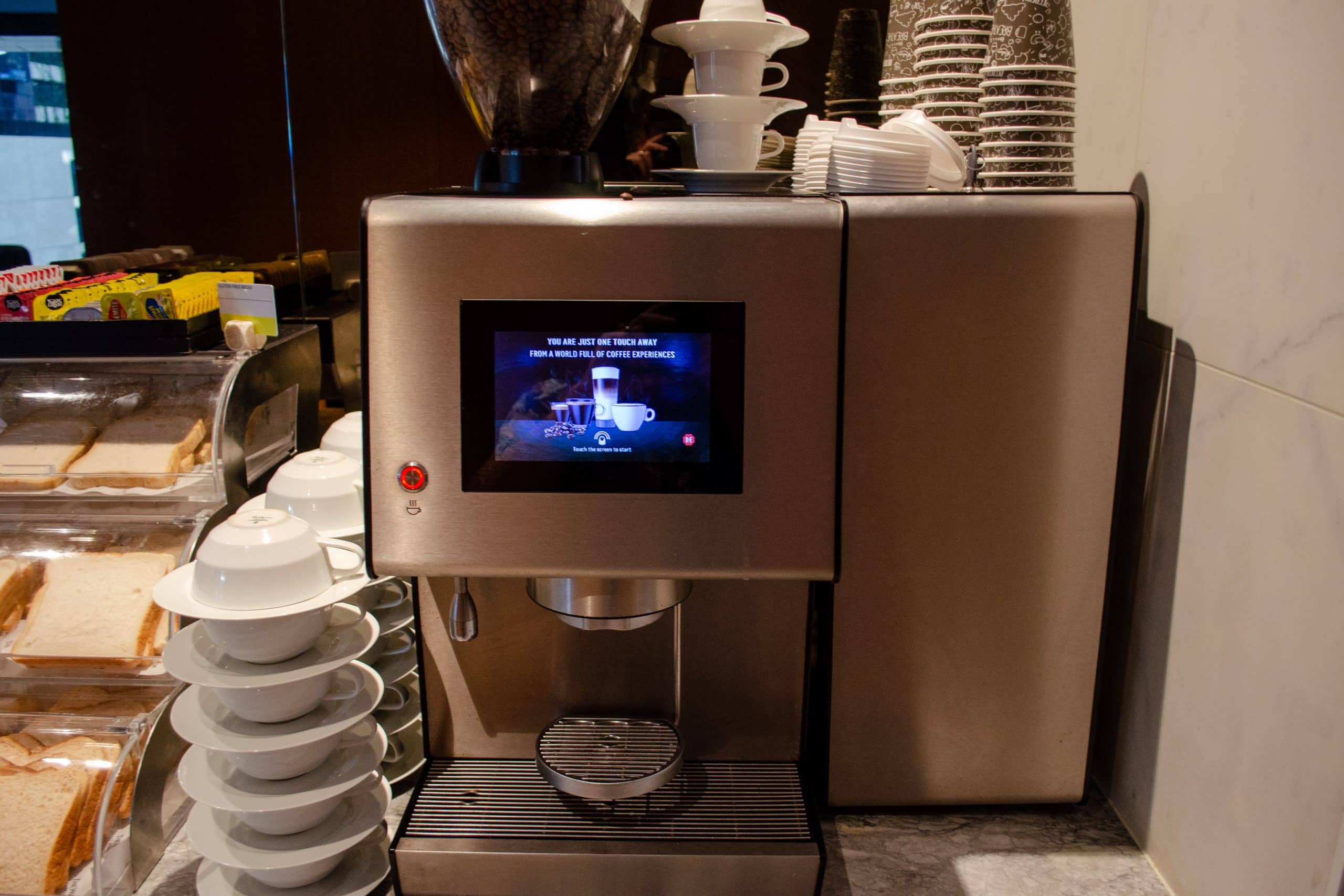 For drinks, there’s an automated coffee maker, a selection of teas, still water, a couple of juice dispensers, and a fridge with soft drinks.
