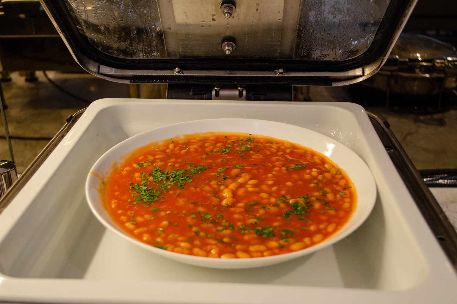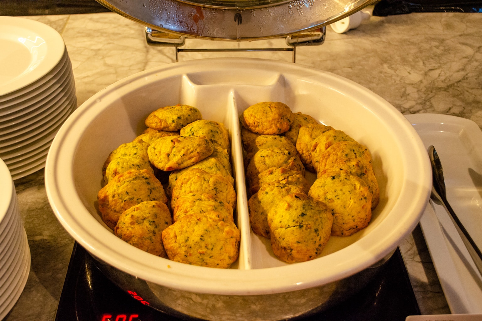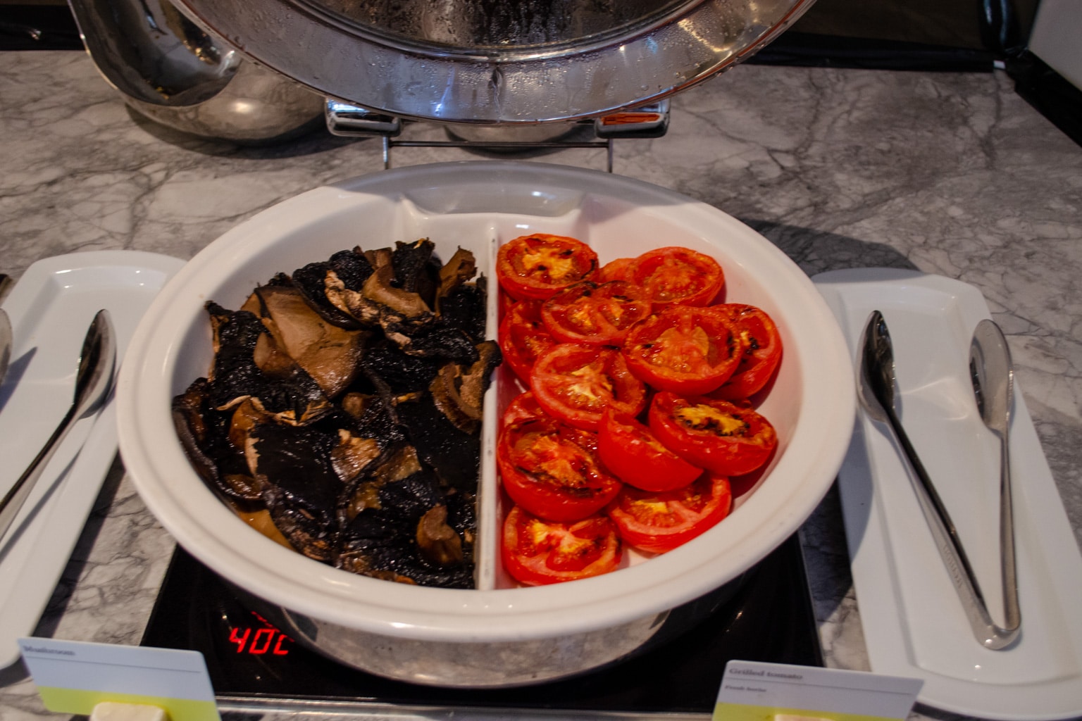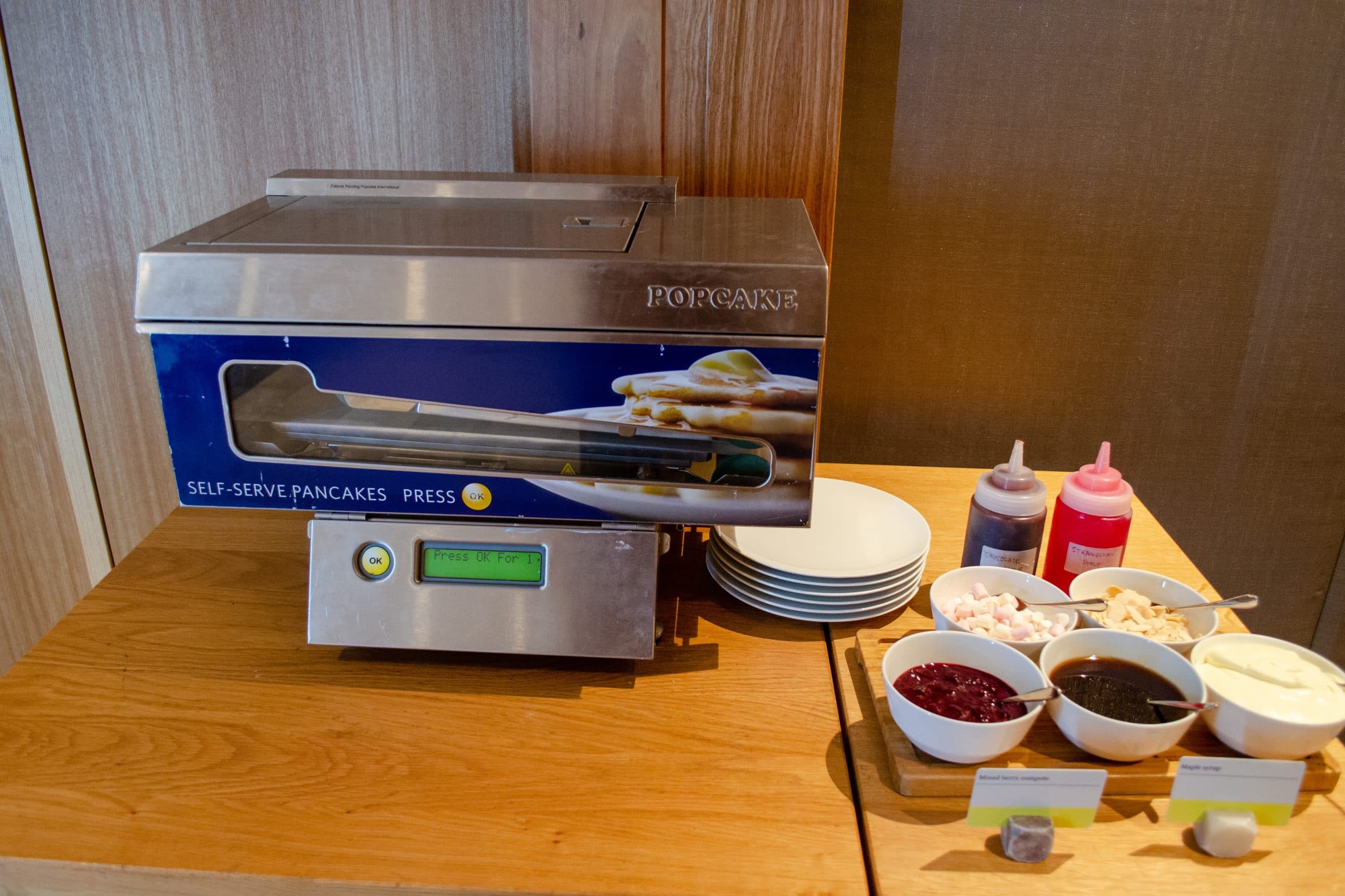The buffet area is stocked with a reasonable selection of hot and cold items. You’ll find many classic staples, such as scrambled eggs, sausages, bacon, baked beans, fried tomatoes, and mushrooms, as well as a pancake machine with a number of toppings.