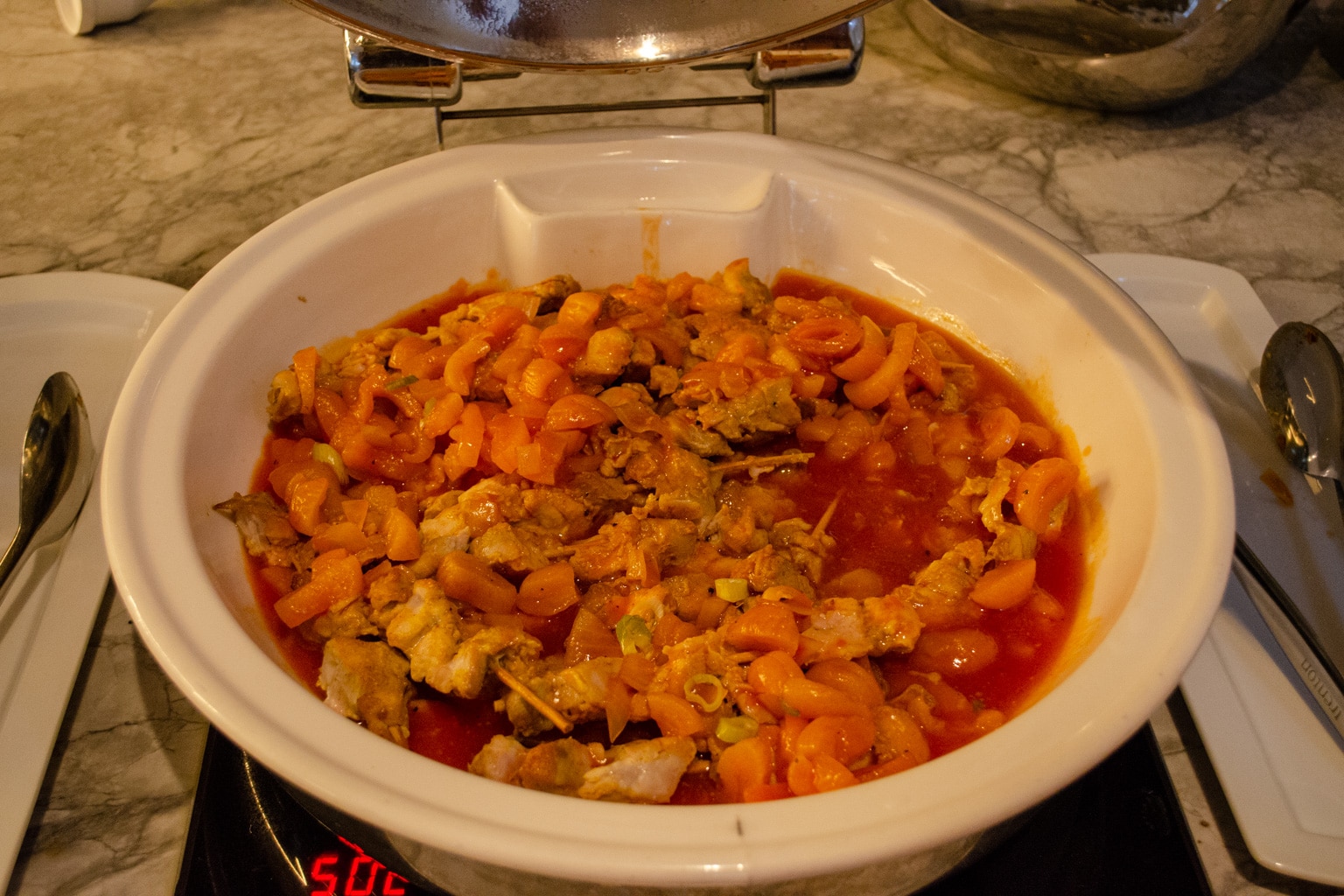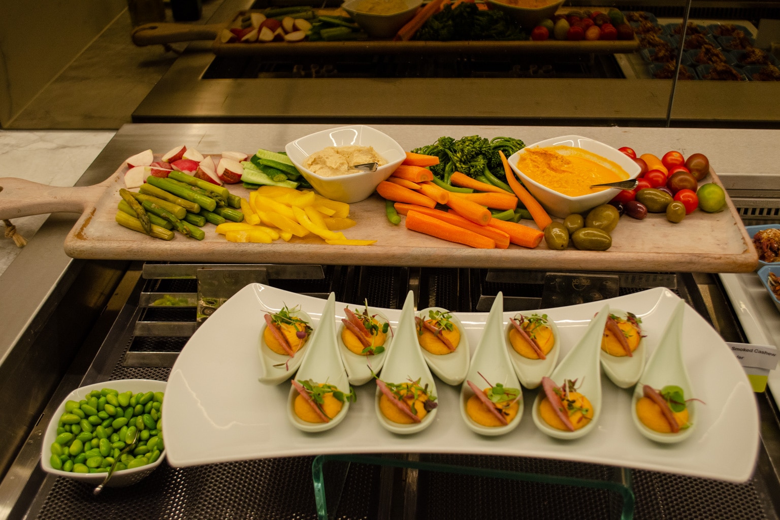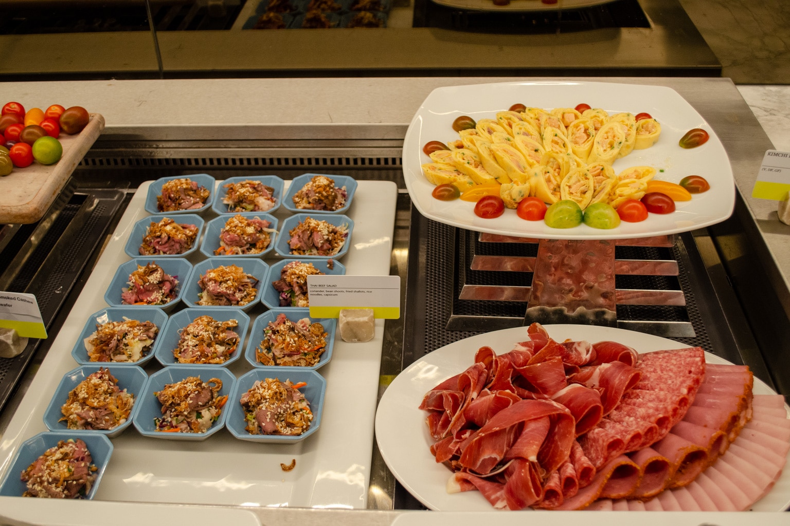 During our visit, there were chicken kebabs and some biscuits available as the hot items. There was also a selection of cold wraps, amuse-bouches, a Thai beef salad, fresh vegetables, cured meats, dried fruits, and nuts available, too.