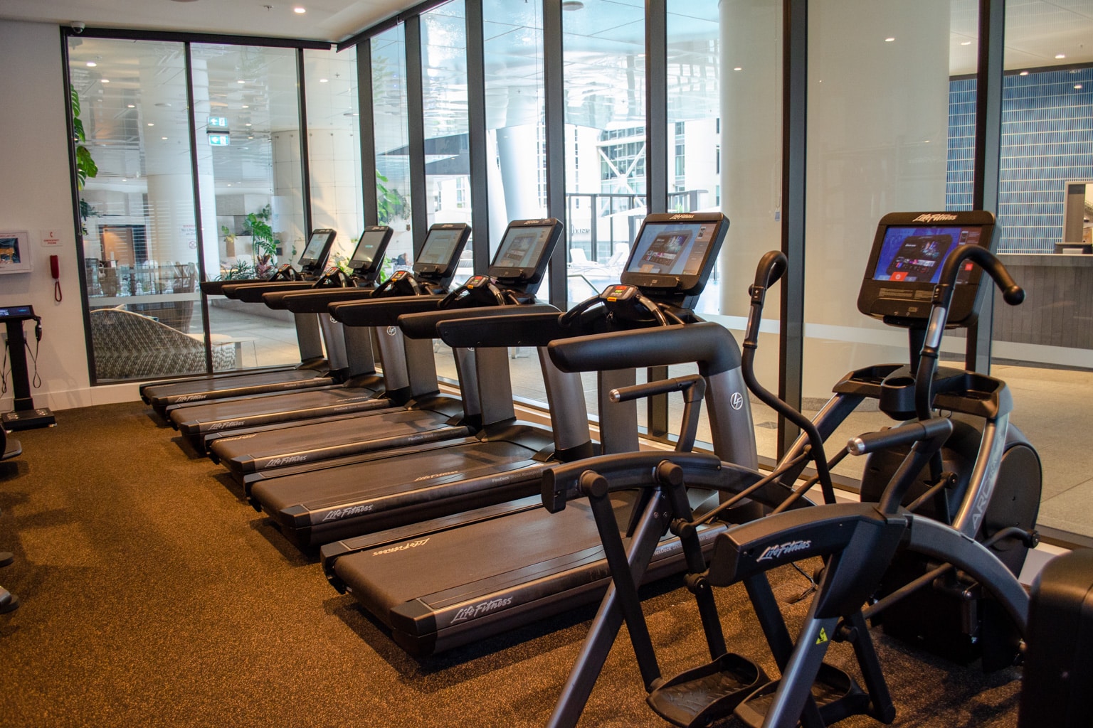 Inside, there’s a range of modern exercise equipment, including treadmills, bikes, elliptical machines, and weights.