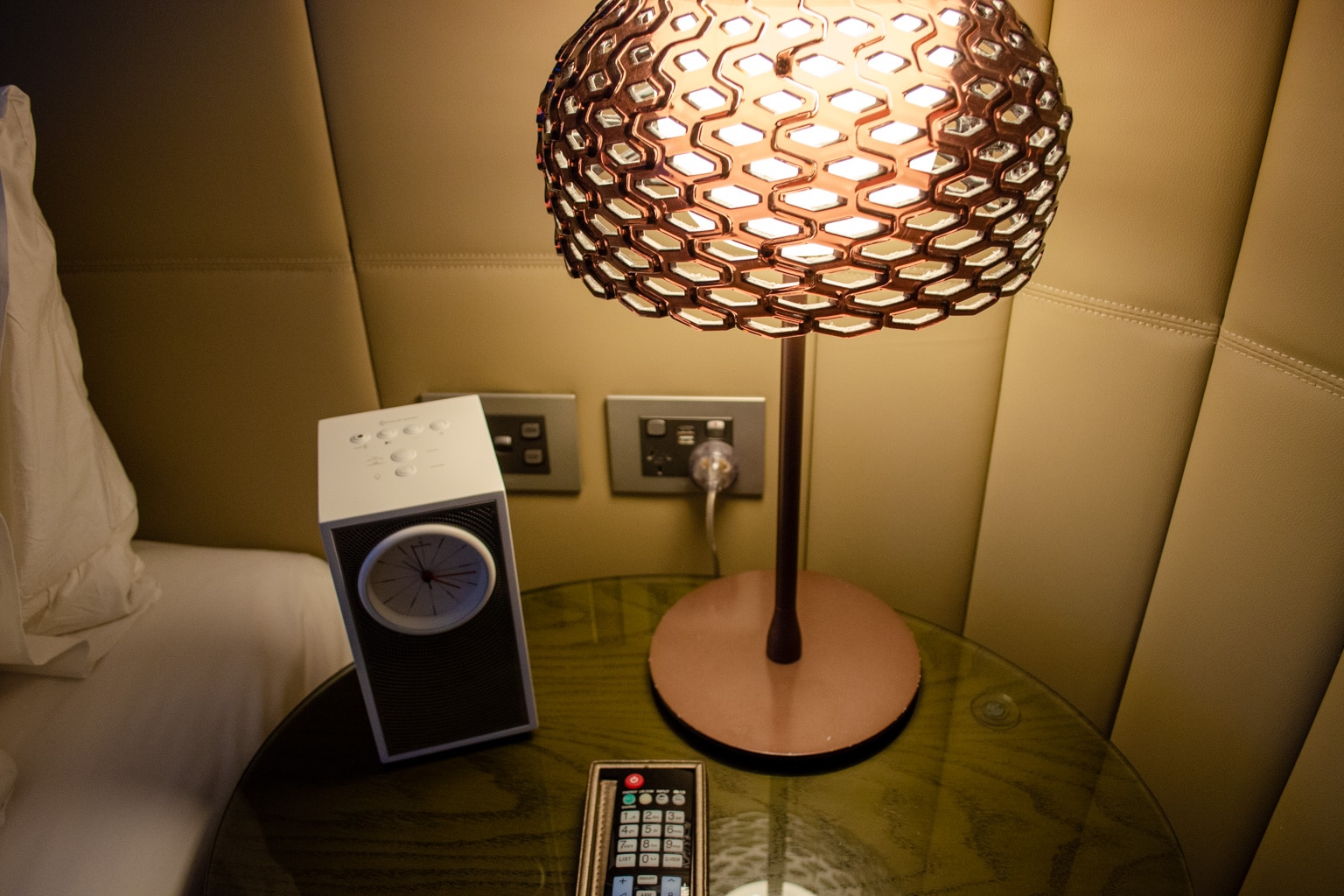 The side table to the right of the bed has a lamp and an analog Bluetooth clock speaker. USB charging ports and power outlets are built into the wall beside the bed.