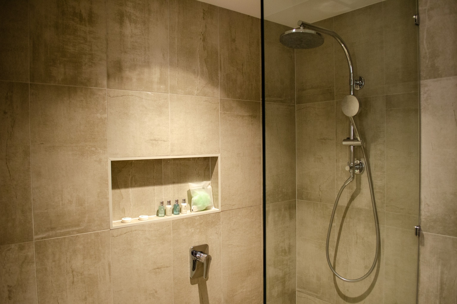 There is a walk-in shower at the back of the bathroom, and a toilet nestled in close to the door.