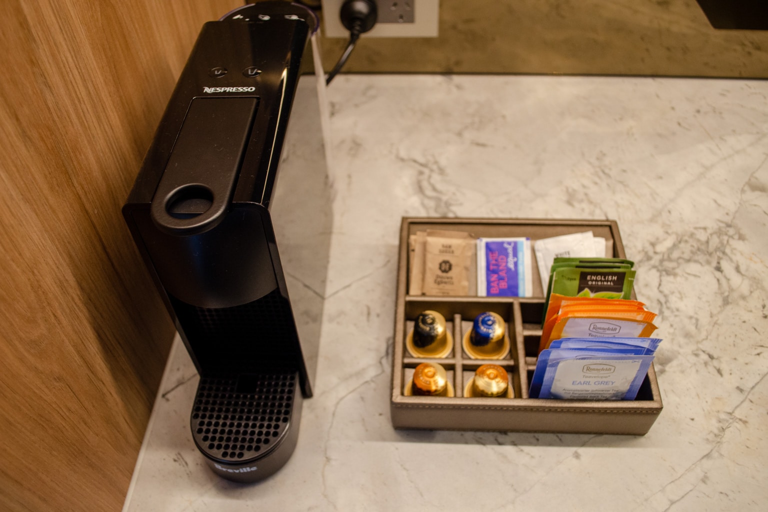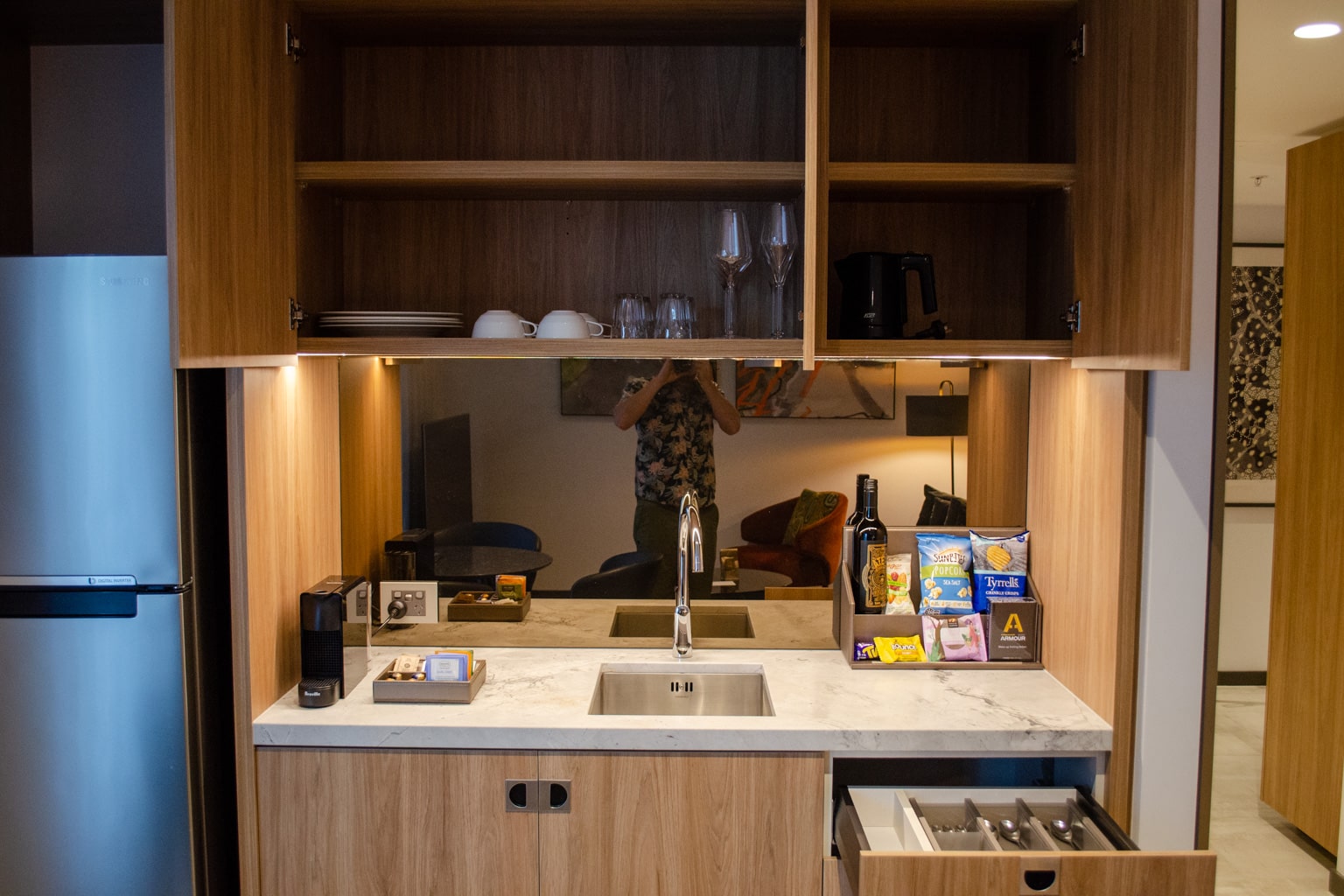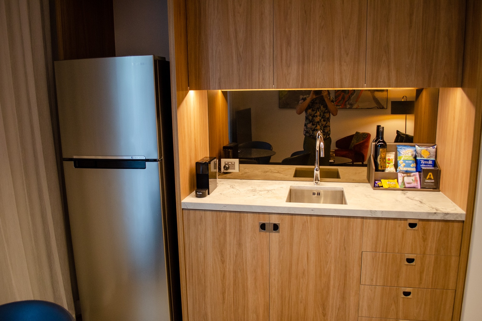 The kitchenette takes up the entire wall that backs onto the bathroom. You’ll find a full-sized refrigerator stocked with minibar items, a Nespresso coffee maker, and some grab-and-go goodies next to a sink.