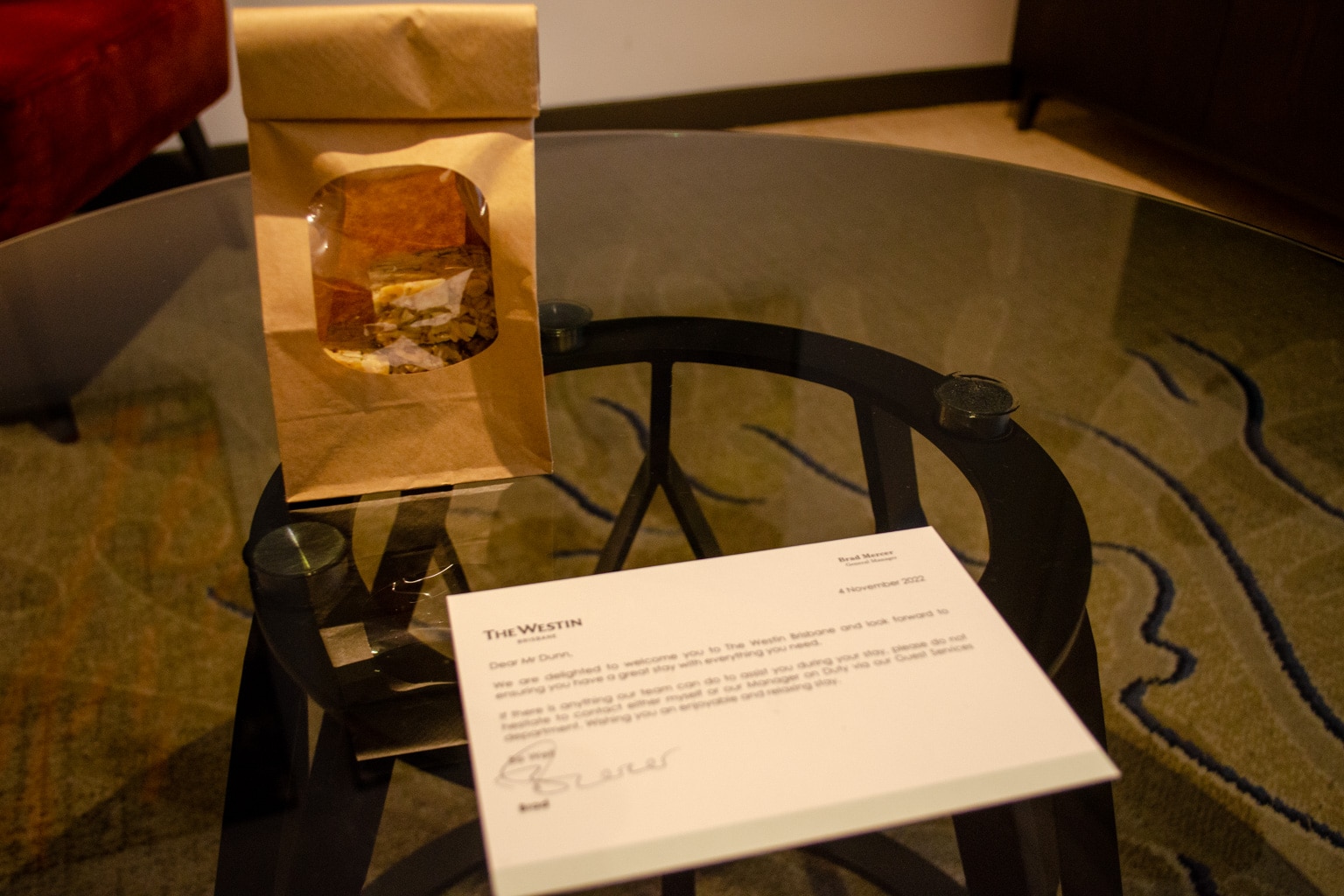 I found a boilerplate welcome note and a welcome gift bag of baked goods when I arrived.