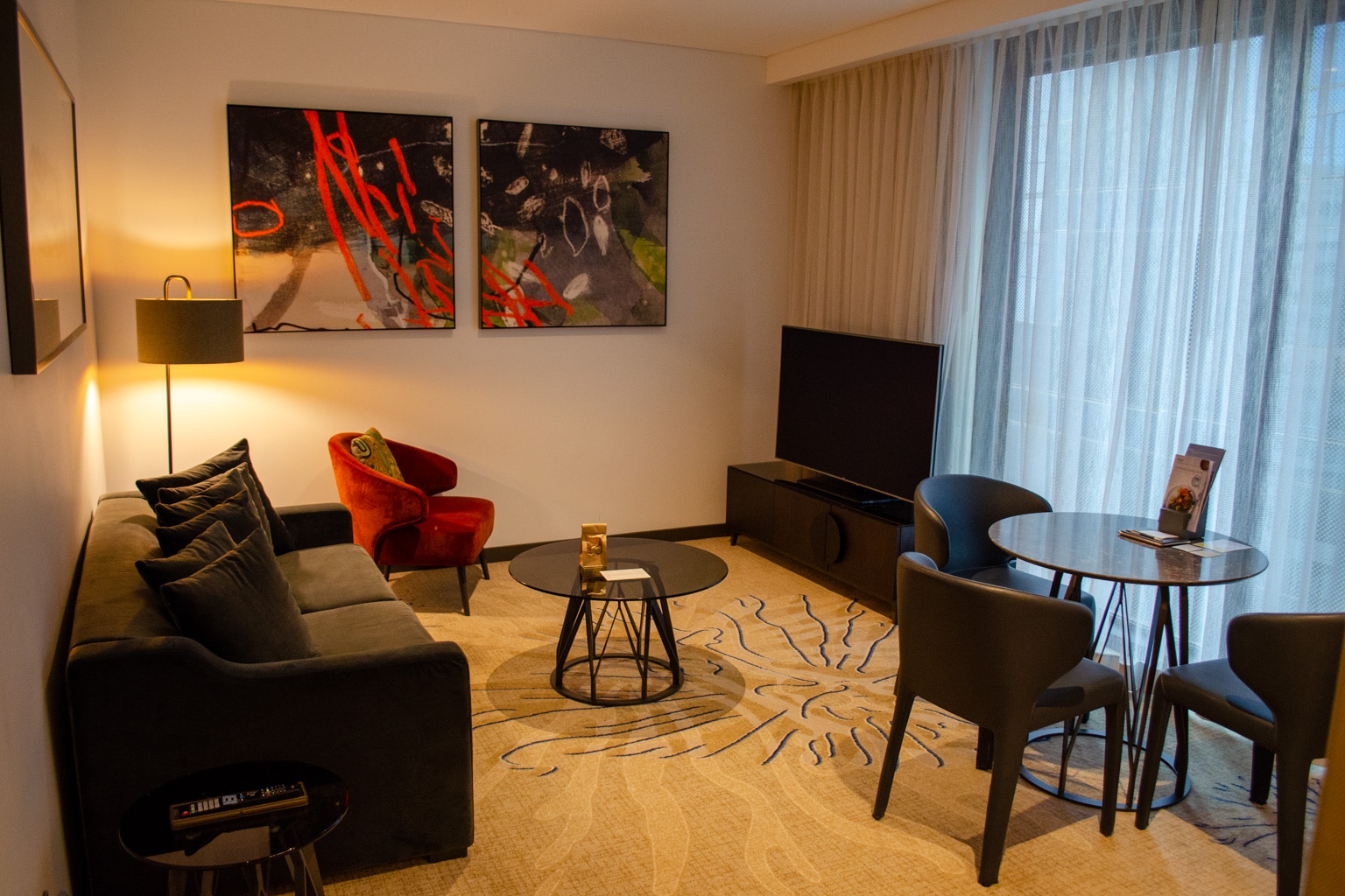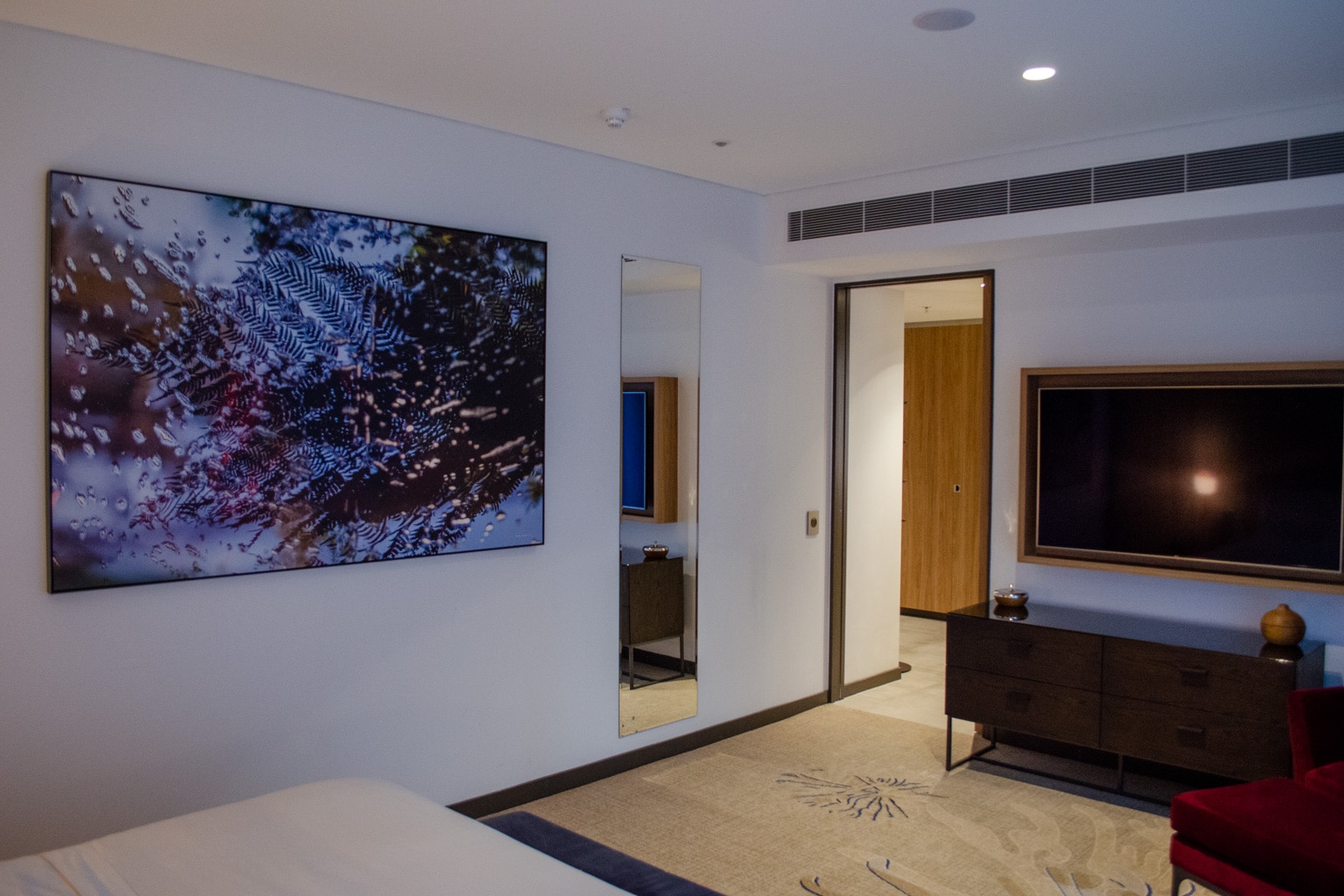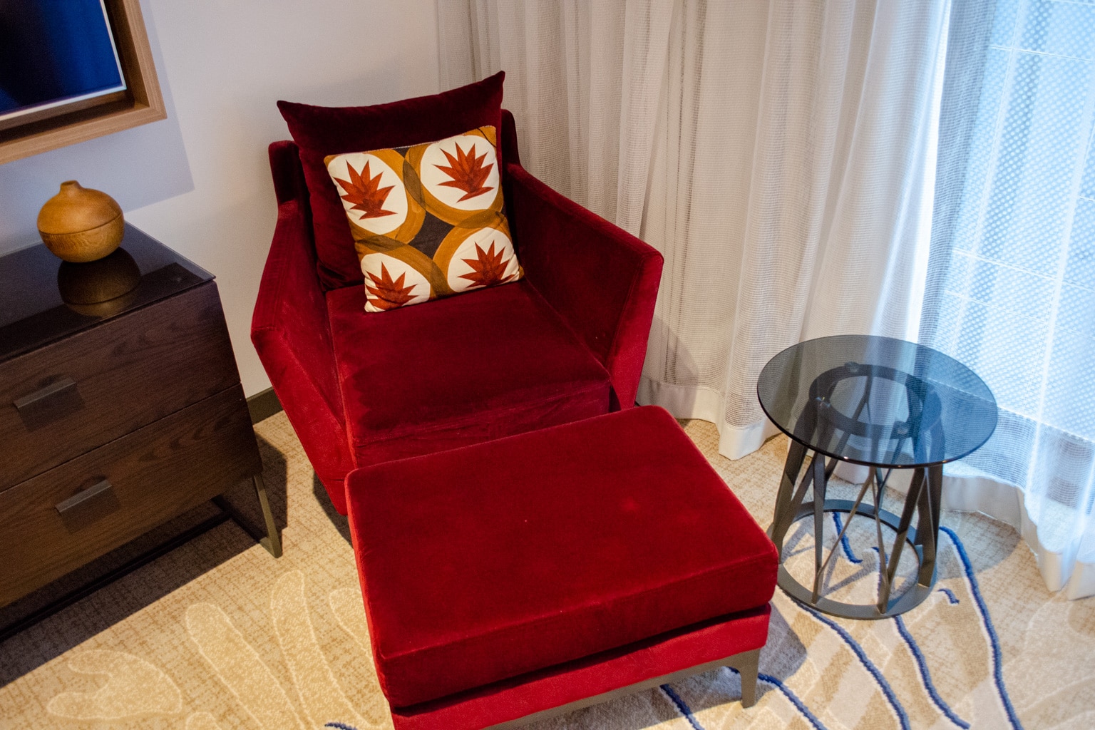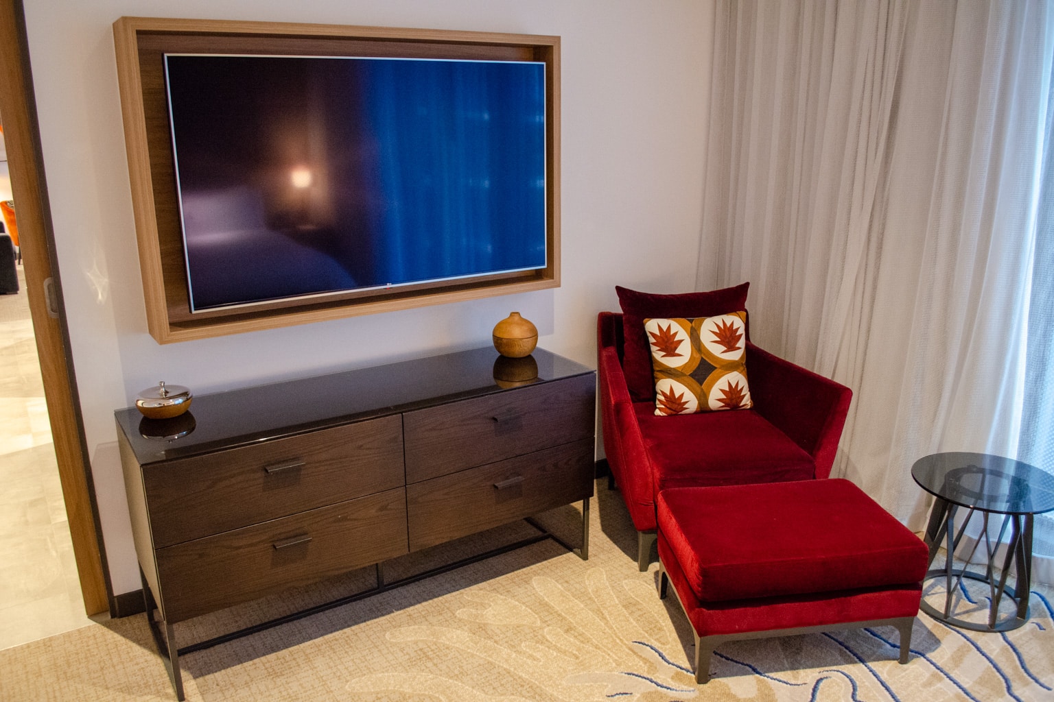On the wall opposite from the bed, you’ll find the suite’s second flat-screen TV mounted above a dresser. A bright red lounge chair and ottoman are parked in the corner of the room, next to a small coffee table.