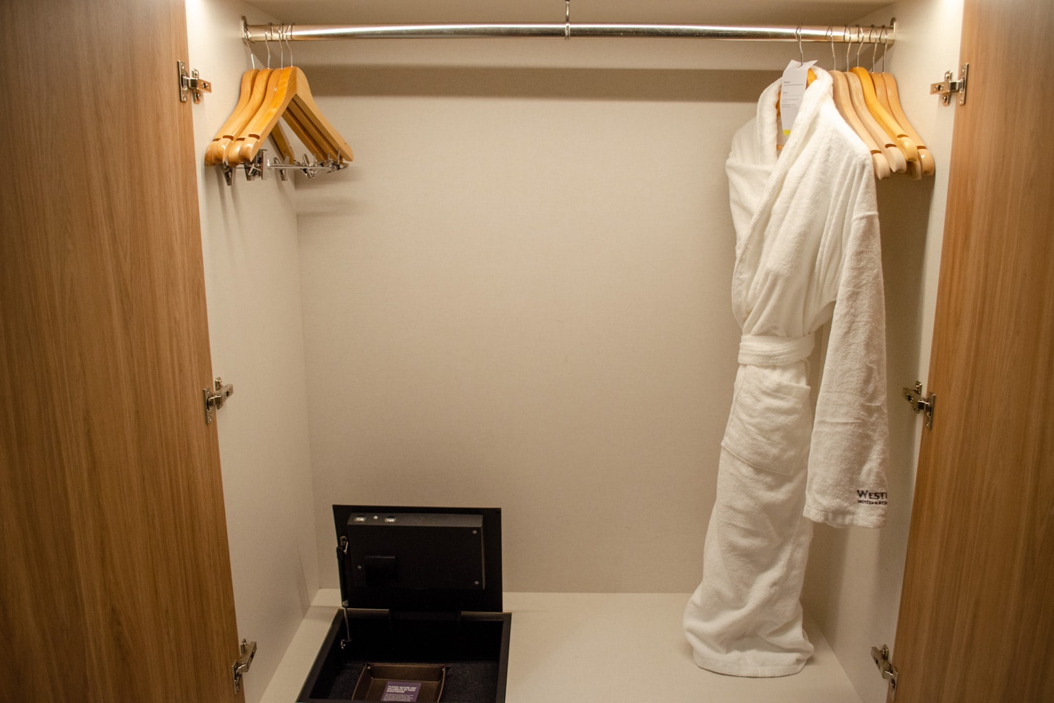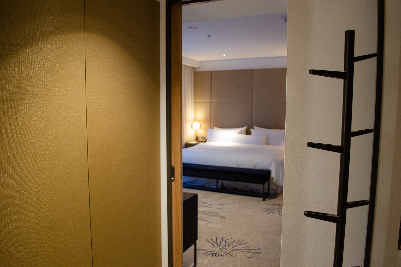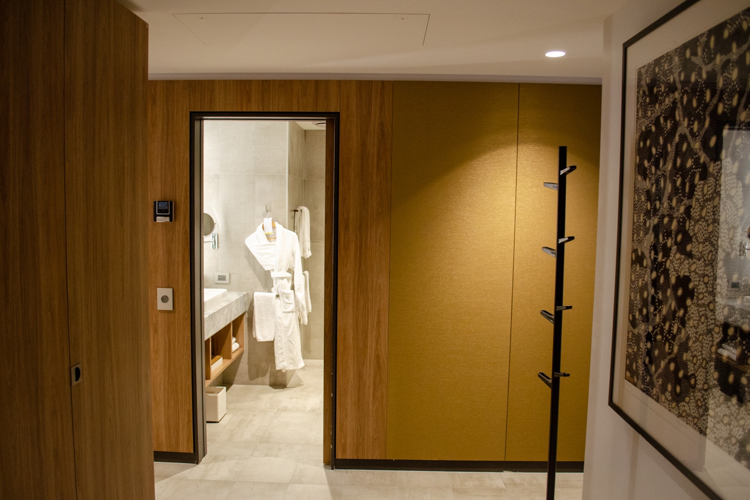 Immediately upon entry, there’s a spacious foyer with a large wardrobe on the left. Inside the wardrobe is where you’ll find the extra bathrobe, and there’s a luggage rack and bench tucked right against the wall by the door.