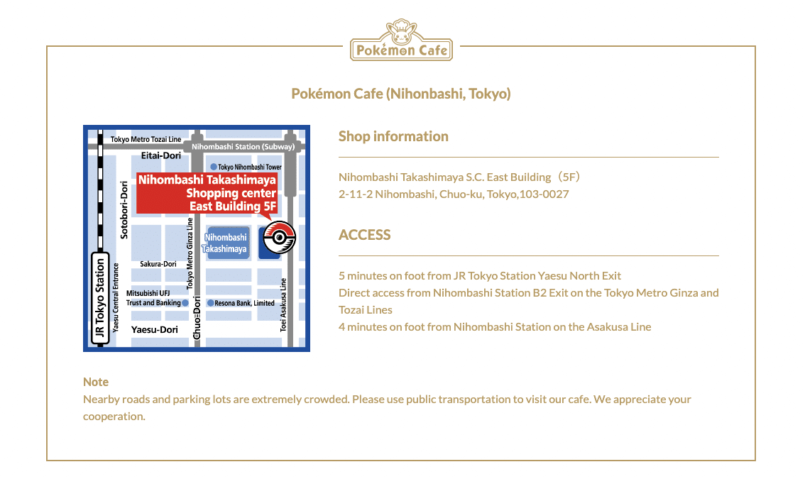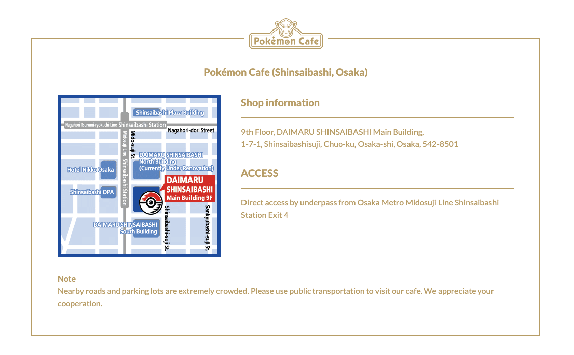 The Pokémon Cafe has two permanent locations in Japan: one in Tokyo and one in Osaka.