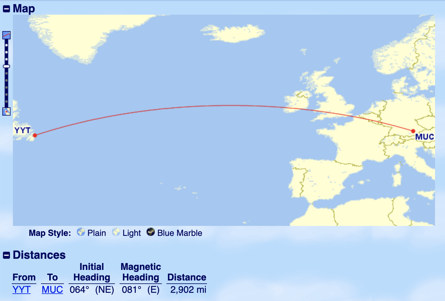 We can look at an example to illustrate, such as a one-way flight between St. John’s, Newfoundland and Munich.